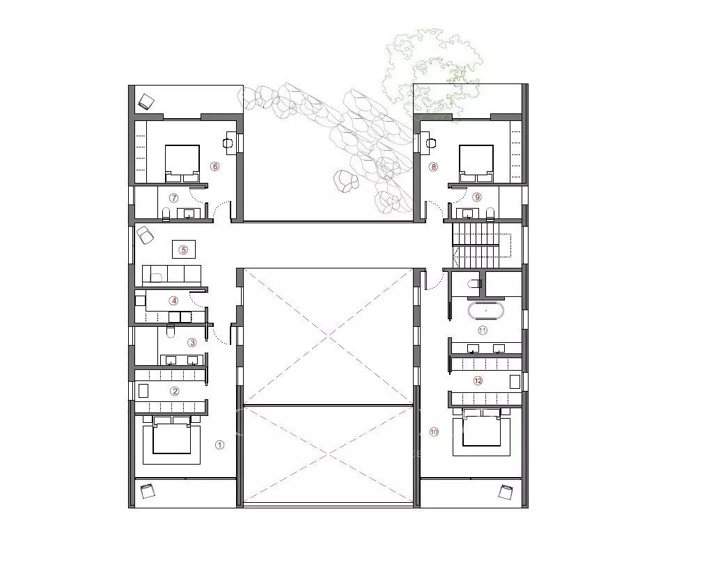 O piso superior tem 4 quartos, todos eles com casa de banho privativa e 2 deles são quartos principais com vestiários individuais cada um e acrescentamos que o projeto tem uma despensa e uma garagem.