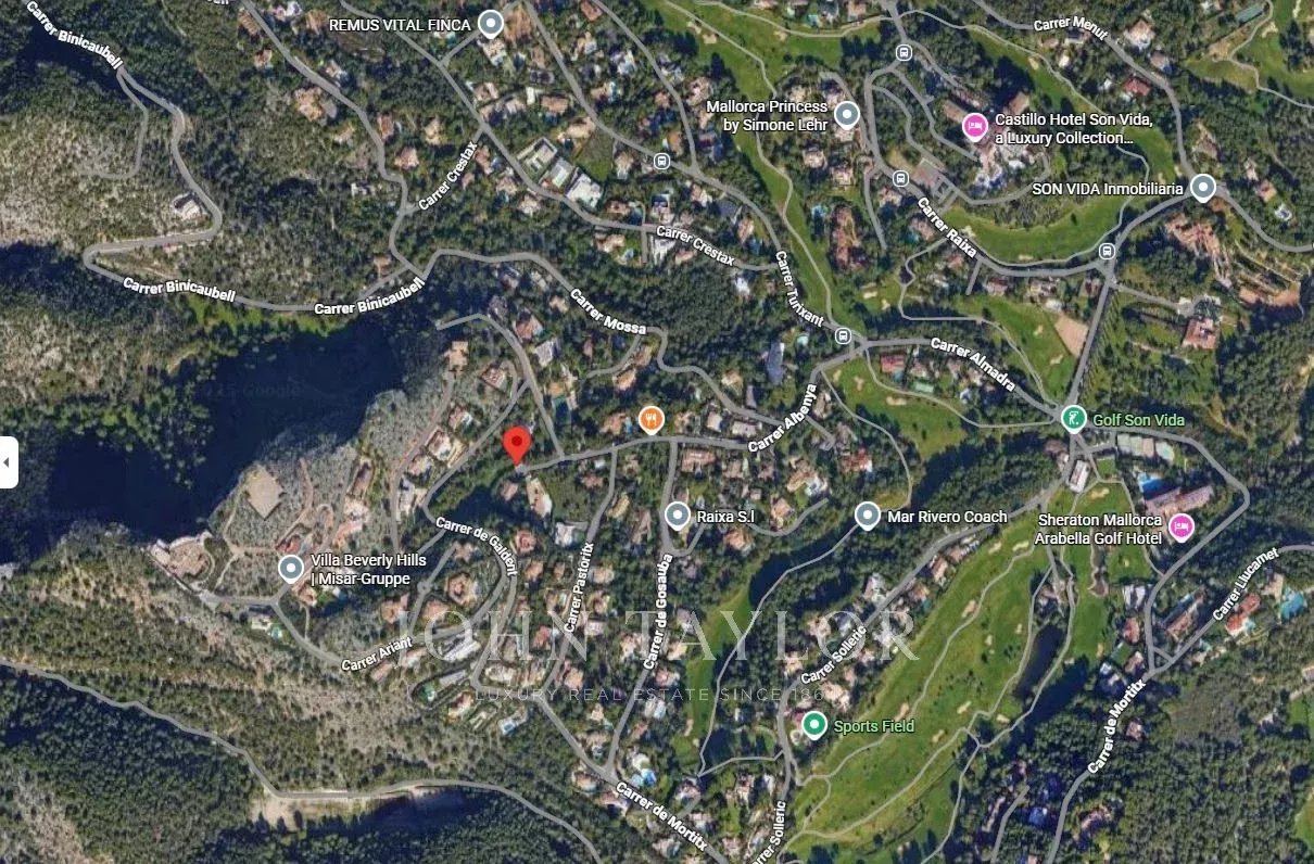Este amplo terreno está situado numa das localizações privilegiadas de Son Vida. Com uma área total de terreno de 2.399 m2 e uma orientação sudeste, cria as condições perfeitas para a sua futura casa com vistas deslumbrantes sobre Palma e o mar. O projeto em si foi planeado por uma das mais prestigiadas empresas de arquitetura da ilha para estabelecer os padrões mais elevados e luxuosos. Possui 6 quartos, 6 casas de banho, uma piscina de água salgada de 78m2, uma área de spa e fitness e estacionamento para até 5 carros. Sendo um dos quatro lotes que estão a ser desenvolvidos no bairro, esta é verdadeiramente uma oportunidade única. É dada a possibilidade de realizar o projeto com os arquitectos já envolvidos. O preço indicado não inclui qualquer planeamento adicional, construção ou alterações ao projeto atual.