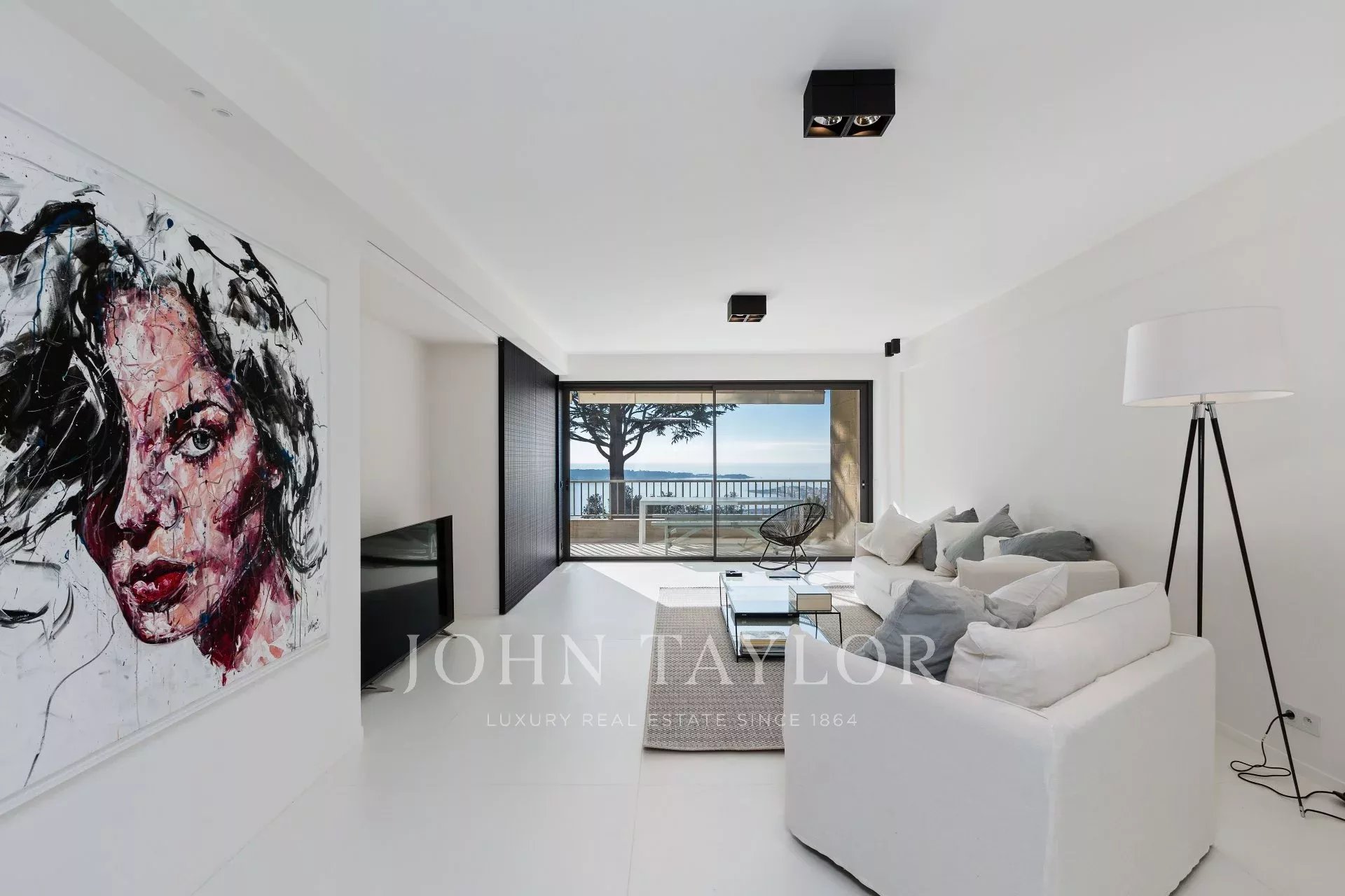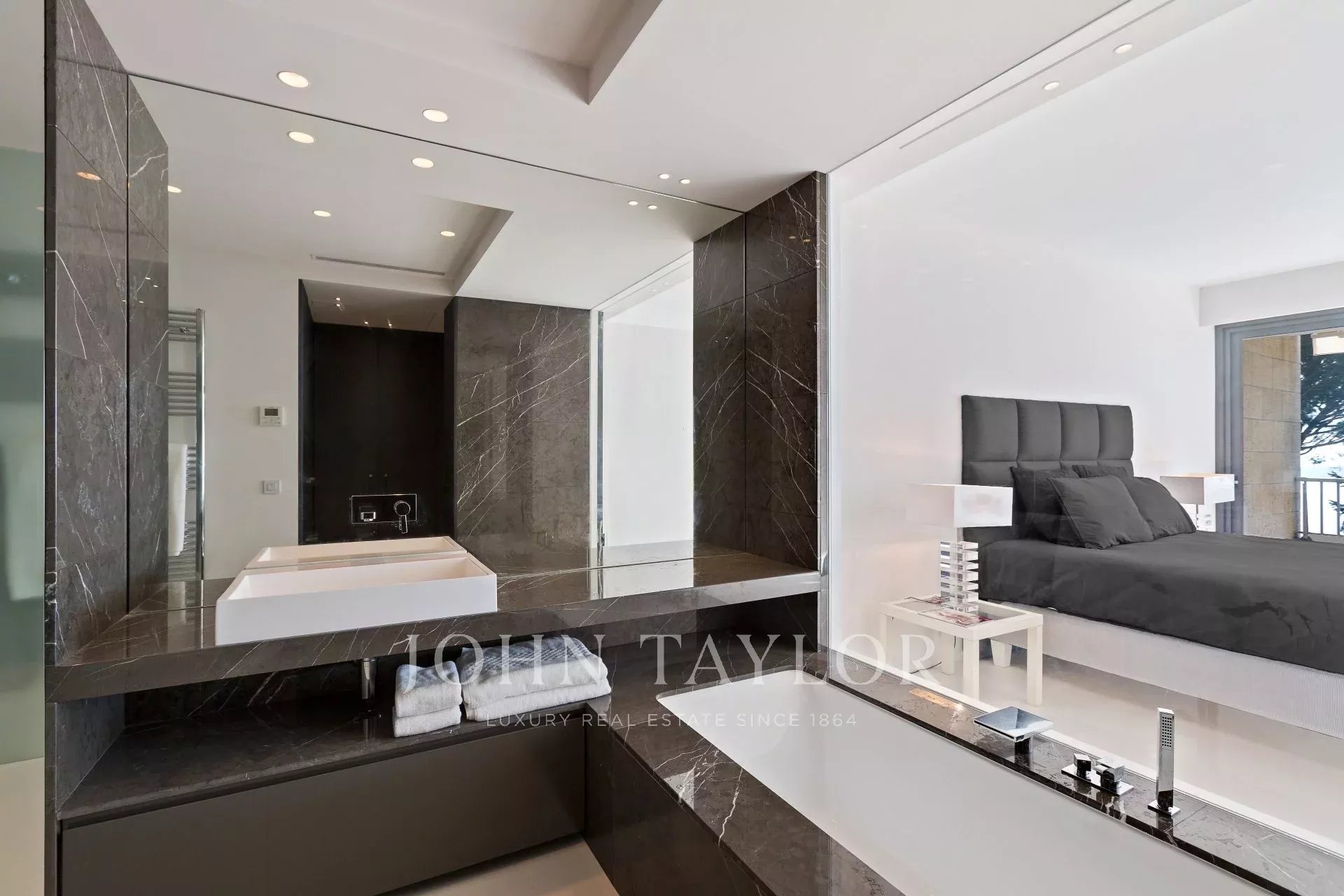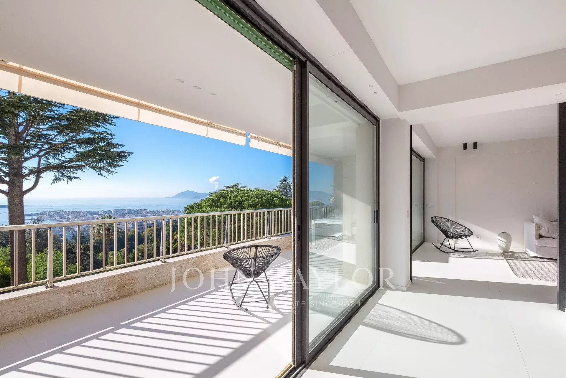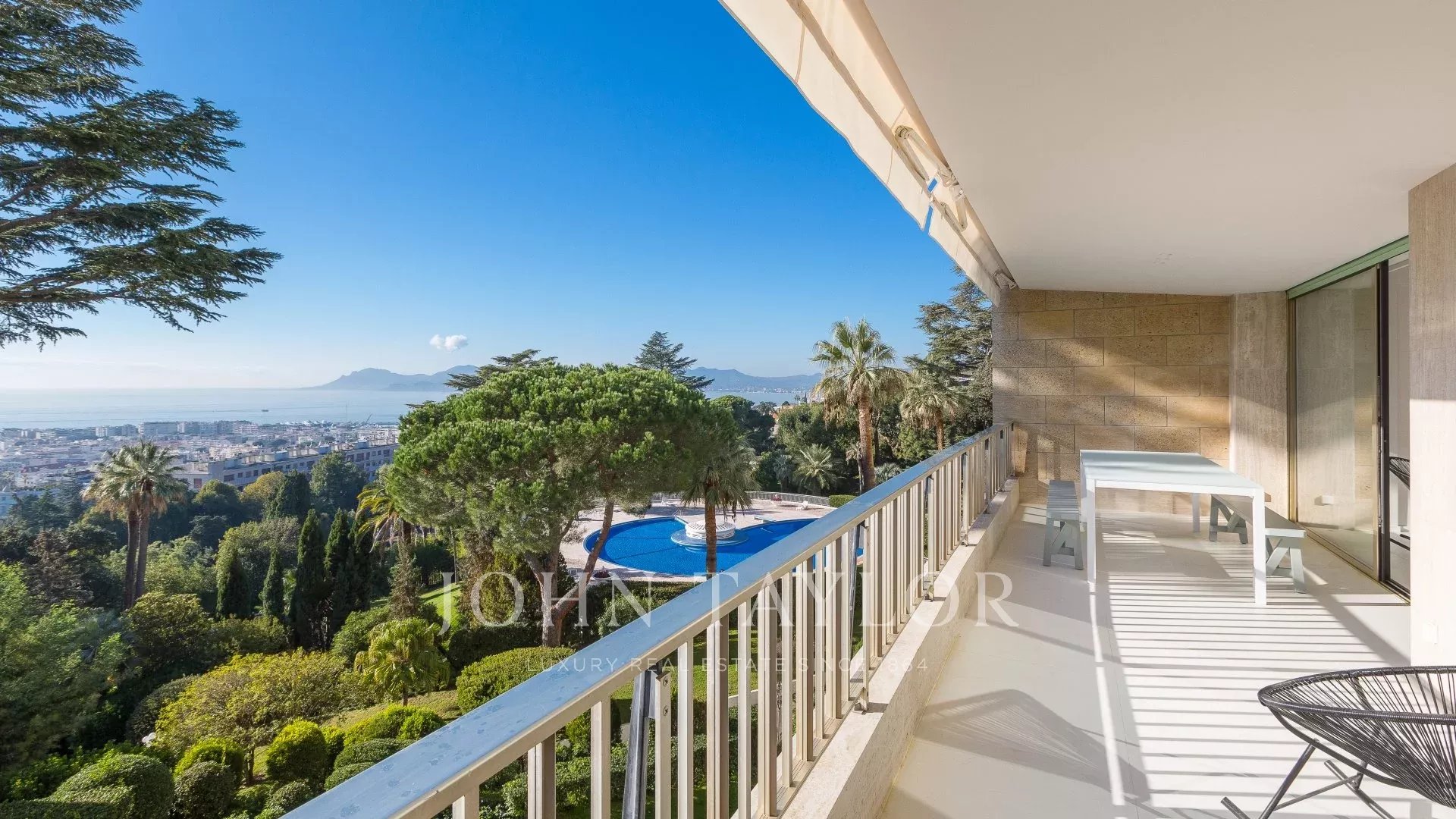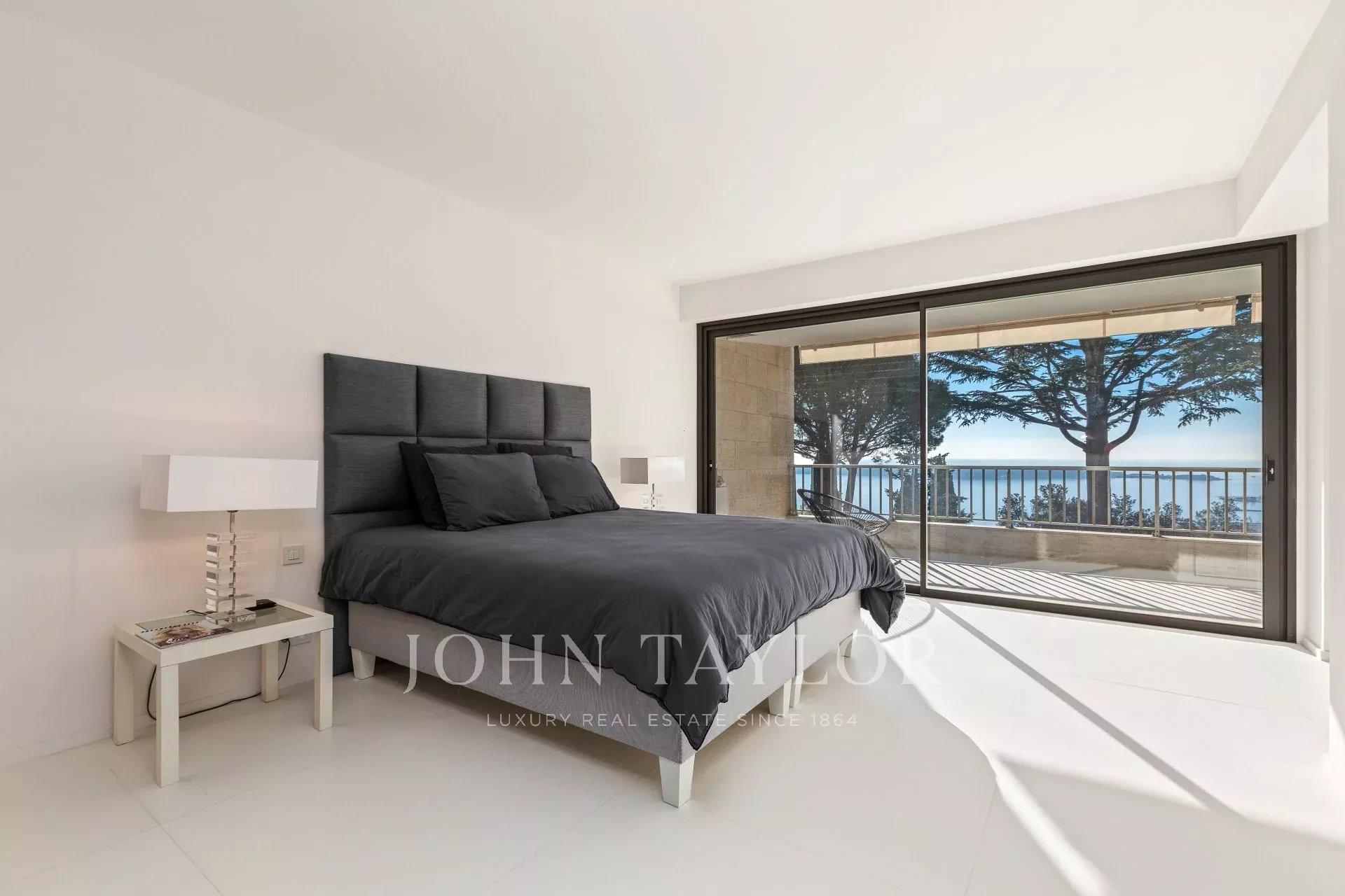 Numa residência de luxo com piscina, um belo apartamento com ar condicionado, totalmente renovado num estilo contemporâneo, com vista para a Baía de Cannes.