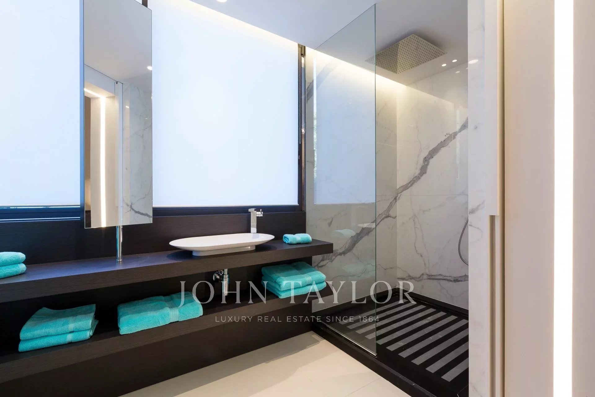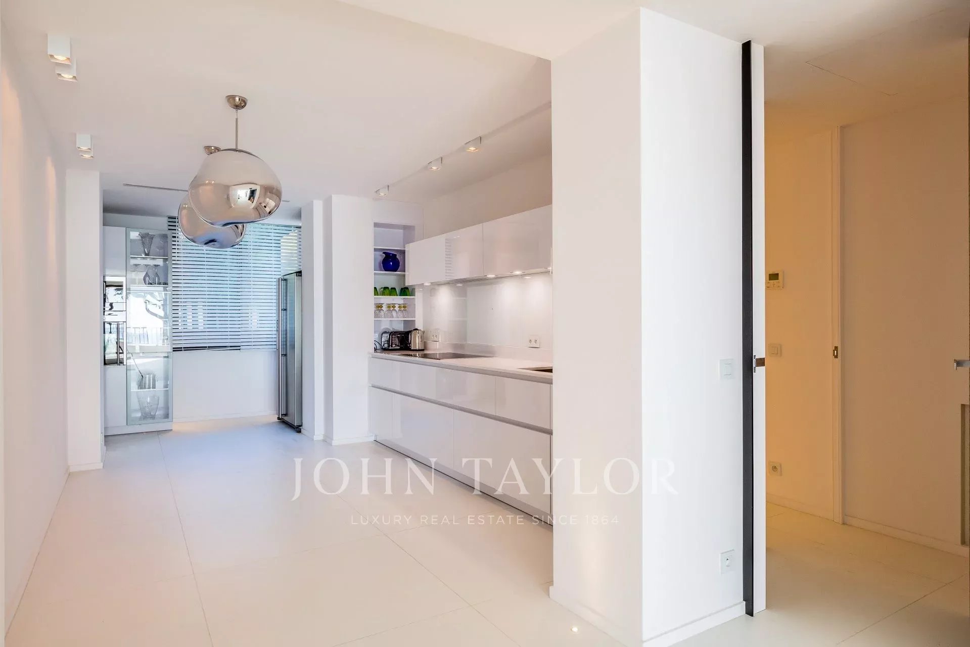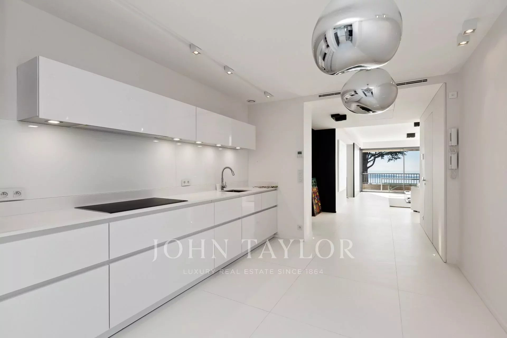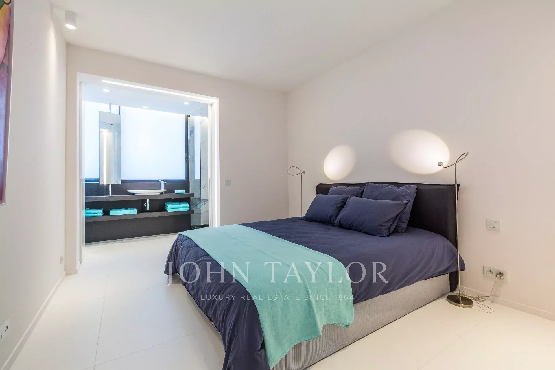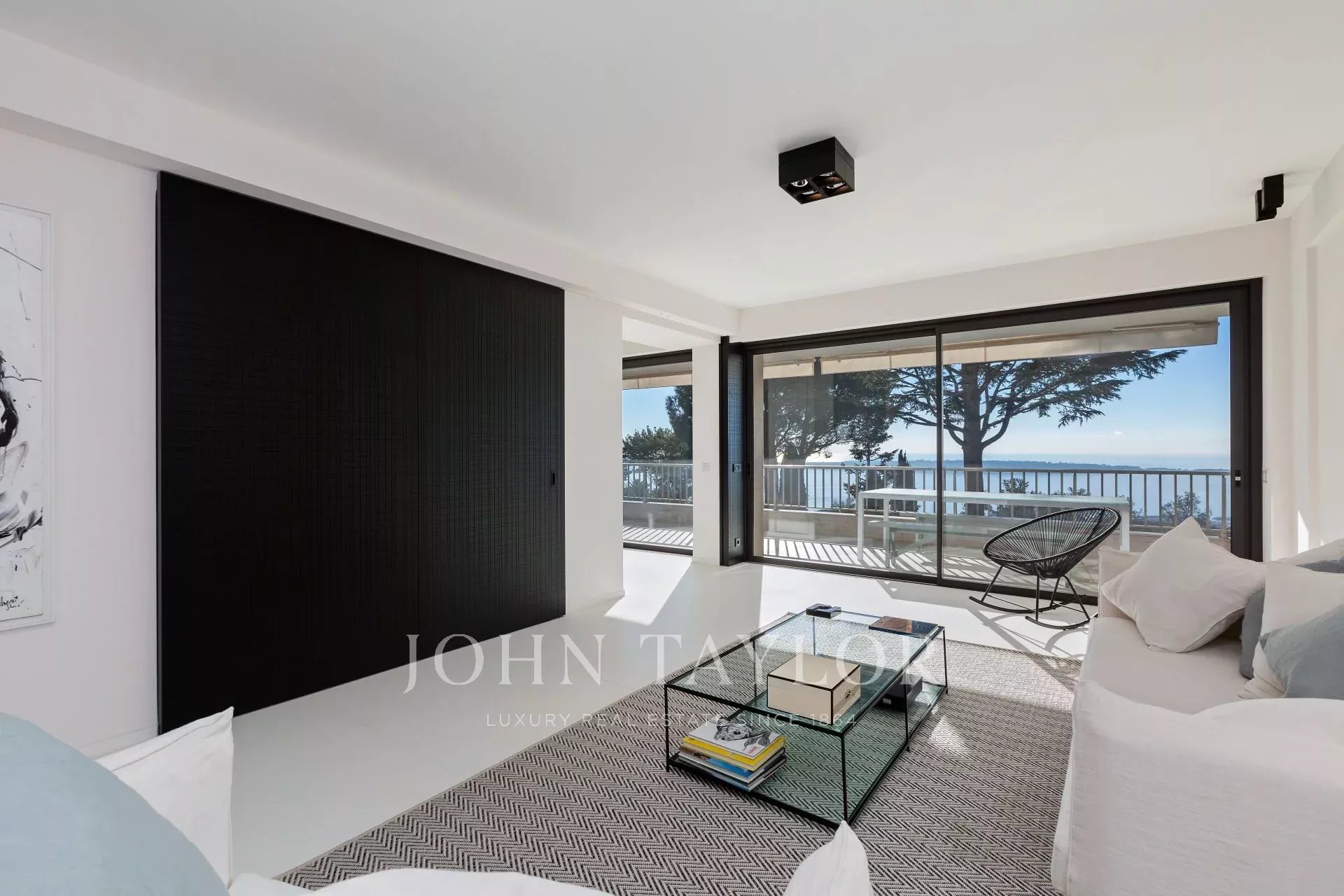 Numa residência de luxo com piscina, um belo apartamento com ar condicionado, totalmente renovado num estilo contemporâneo, com vista para a Baía de Cannes.