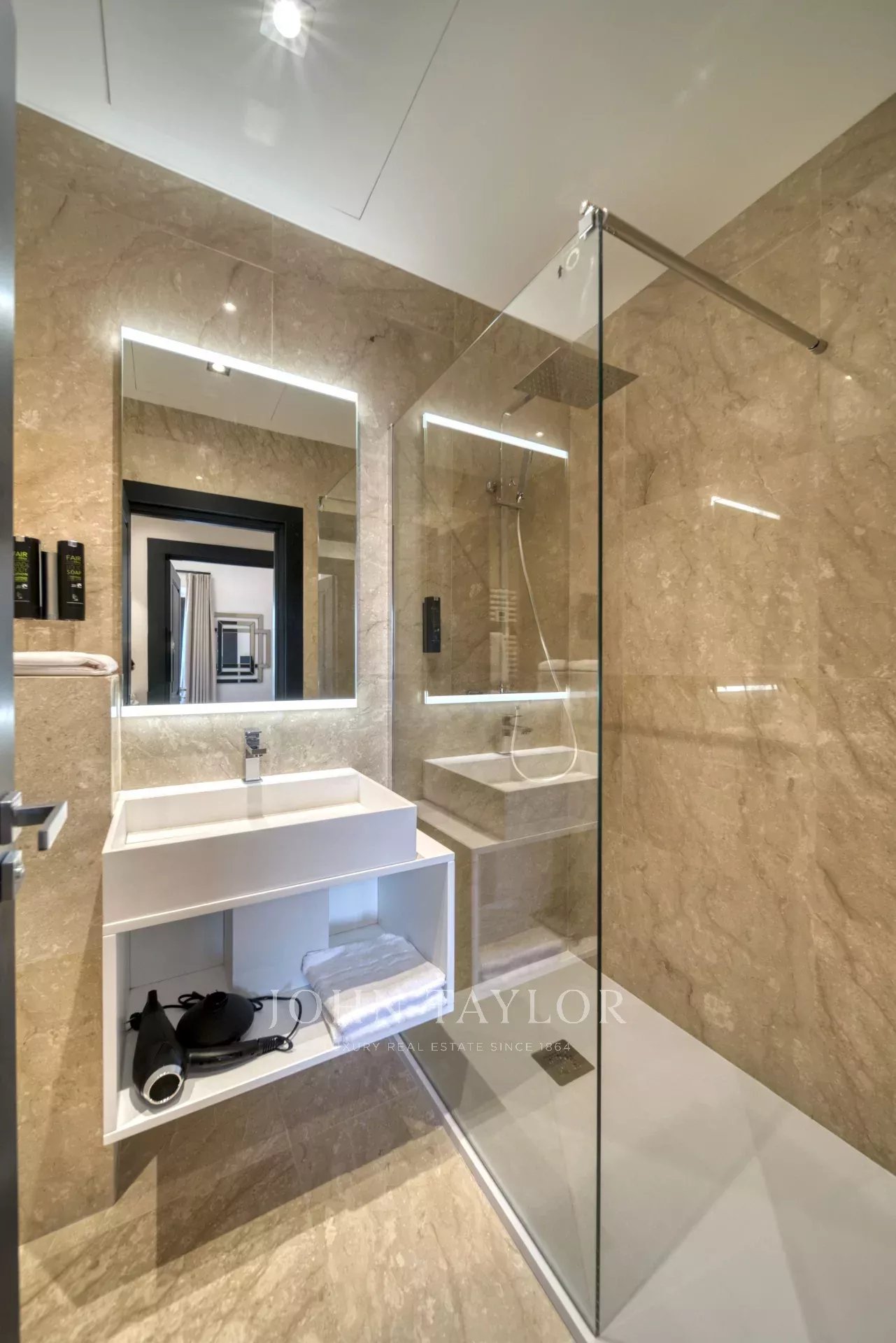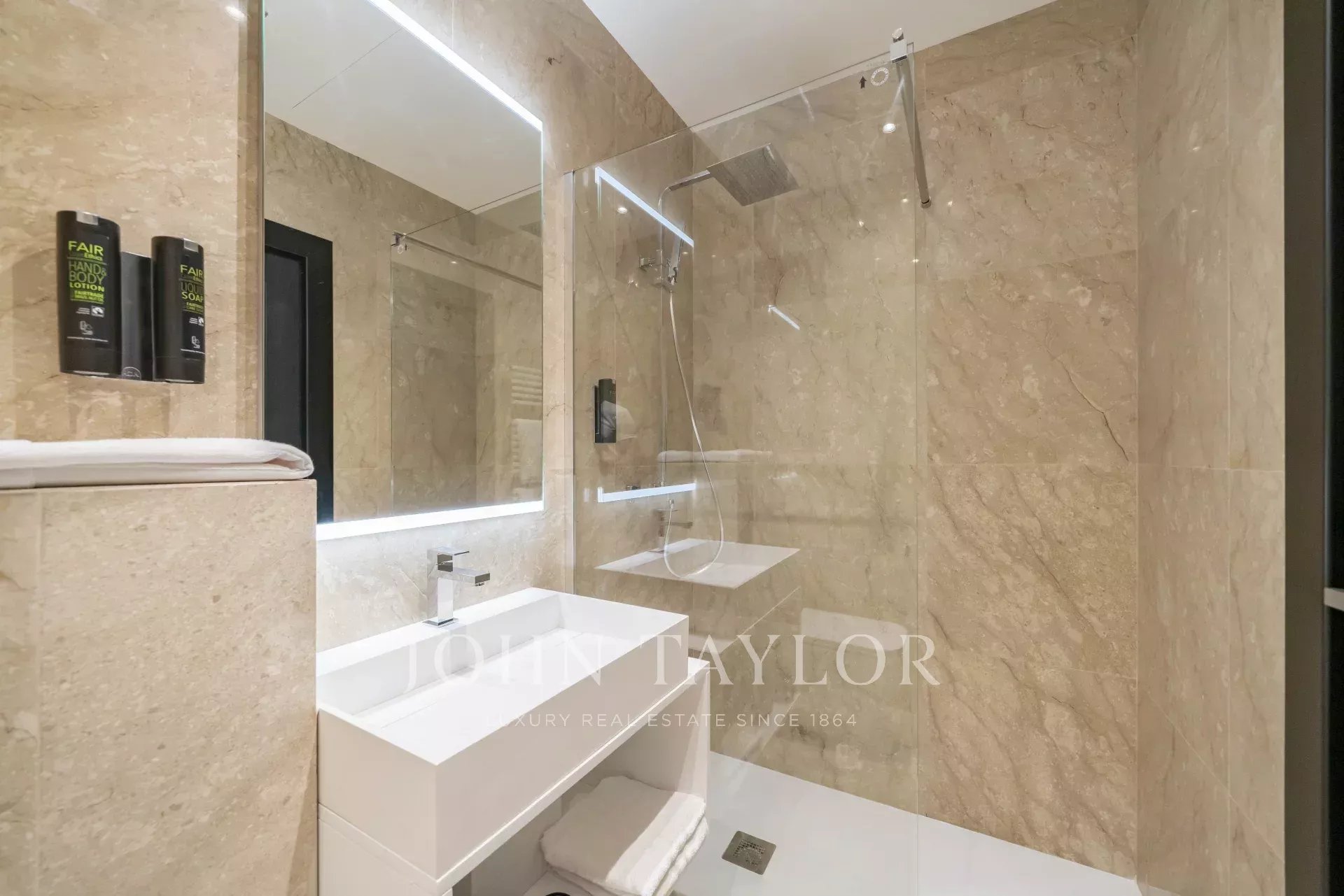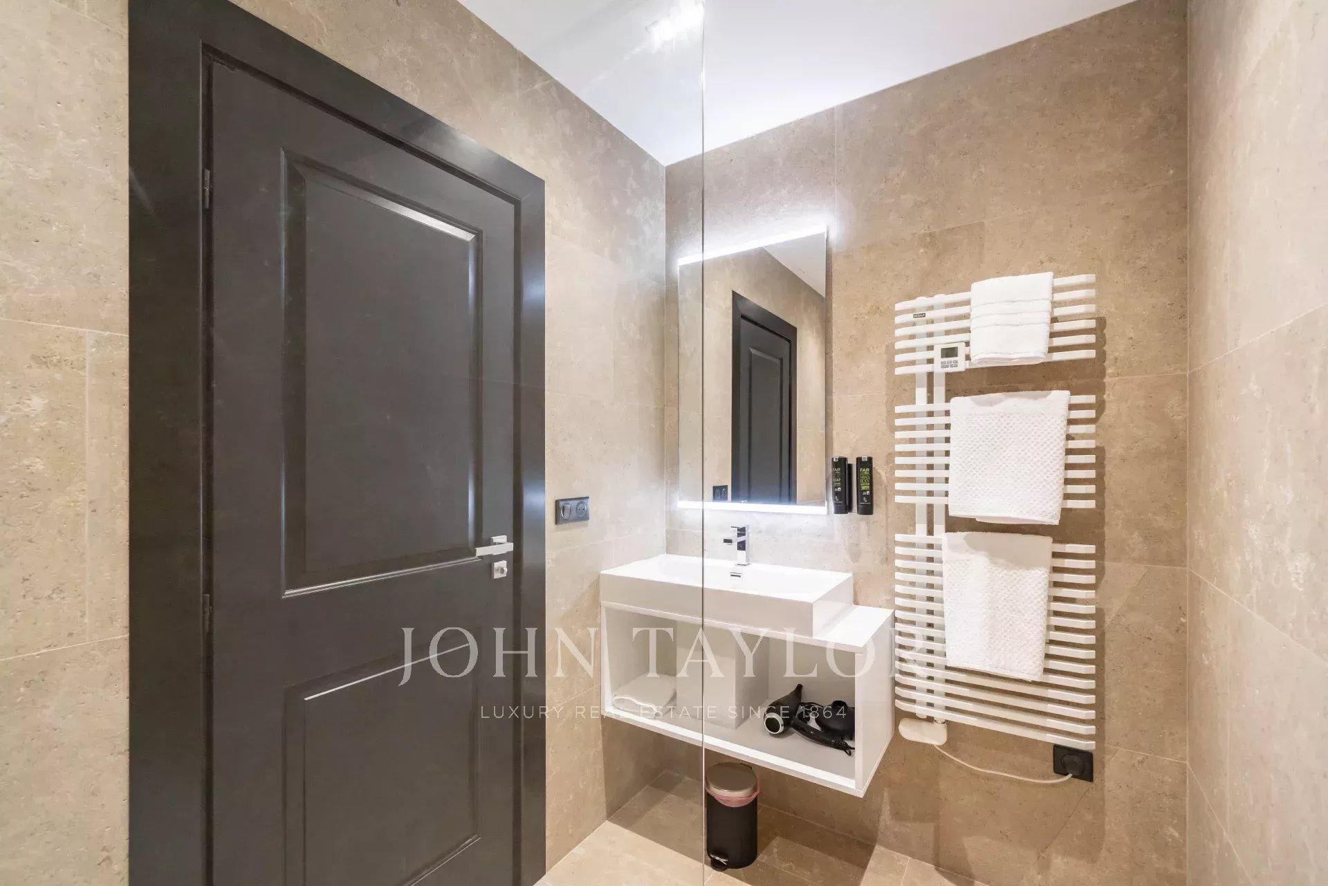 No 3.º andar de um edifício de classe média, em frente ao Palais des Festivals e às praias da Croisette, a 1 minuto da rue d'Antibes, apartamento contemporâneo totalmente renovado com ar condicionado e 195 m2 de área útil: