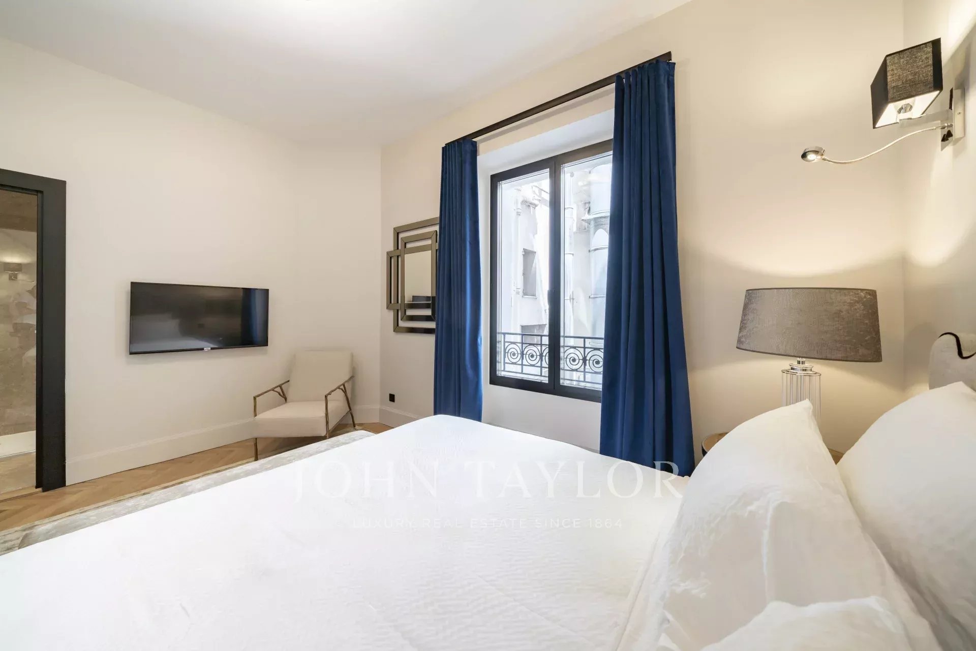 Quarto 1 (cama de 180 cm ou duas camas individuais), TV, quarto de vestir - vista para o Palais e o mar. Casa de banho privativa, banheira, duche italiano, toalheiro aquecido / WC japonês
