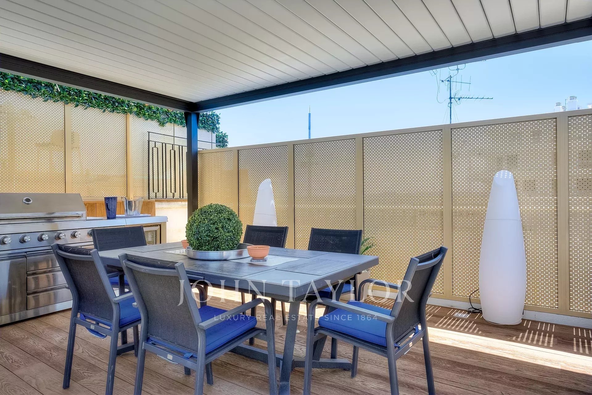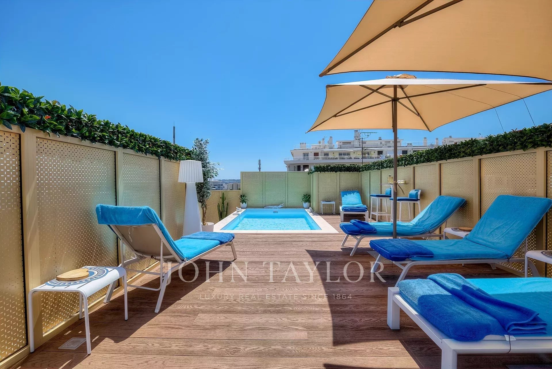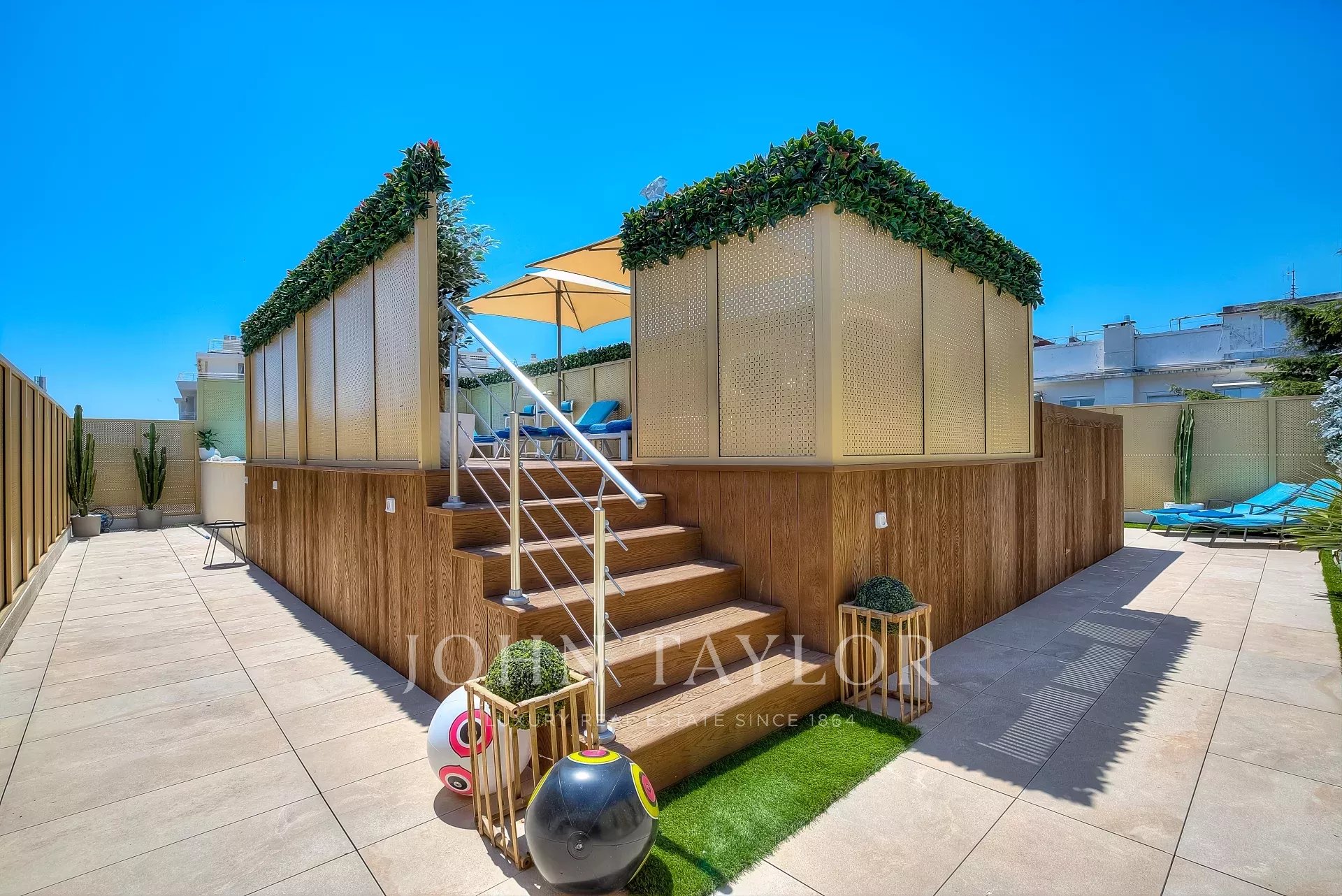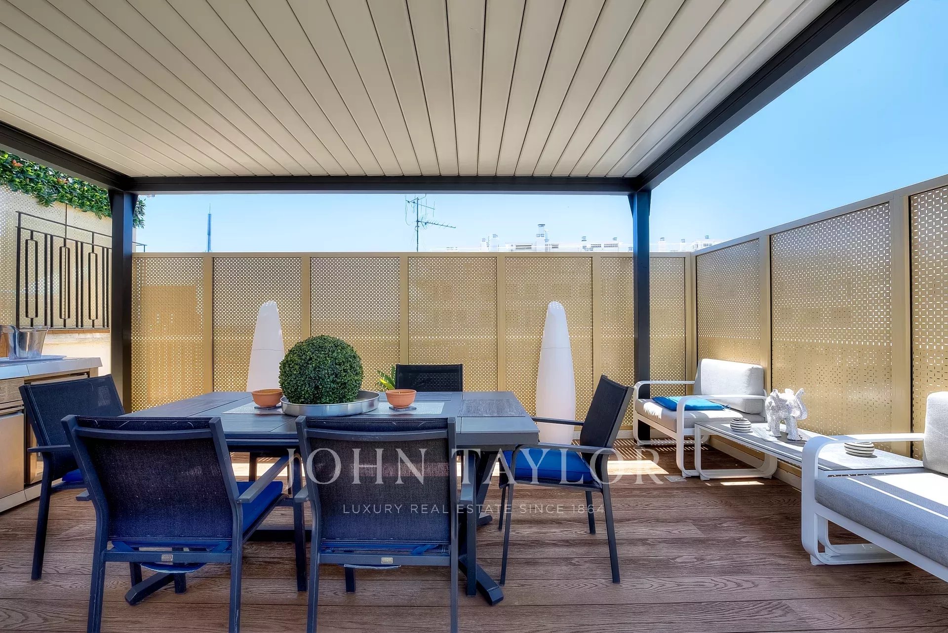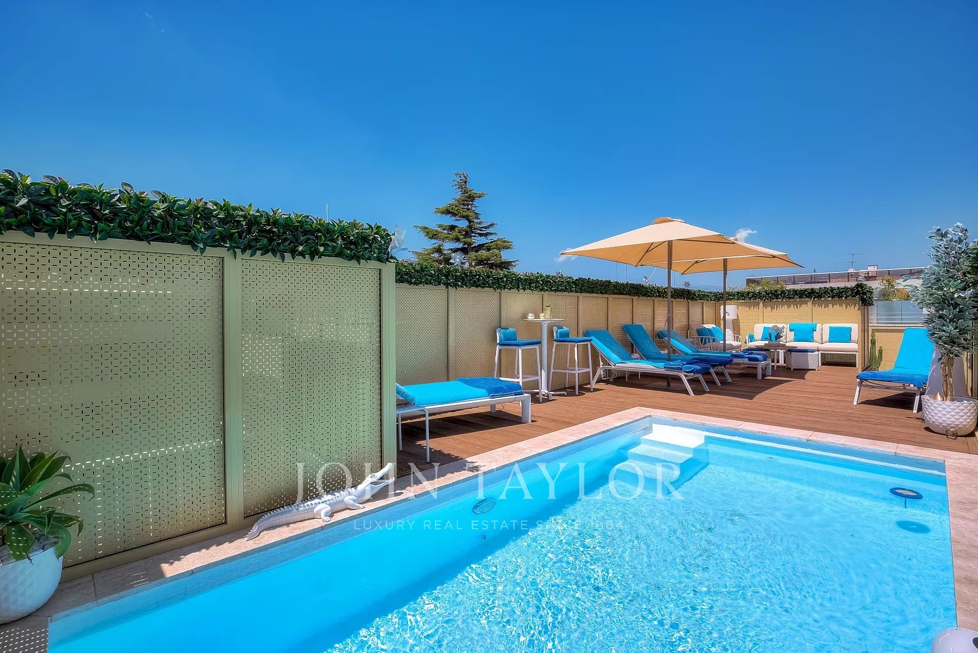 Numa residência de luxo, na 2ª linha da Croisette, um soberbo apartamento contemporâneo de 100 m2 com um terraço de 176 m2 no telhado com piscina privada (5,5 m x 3 m), espreguiçadeiras, sala de estar, área de refeições e cozinha de verão com churrasco.