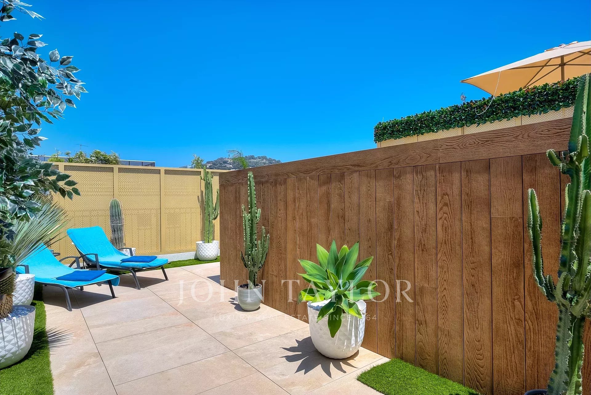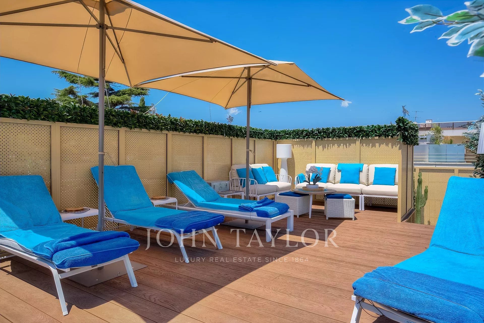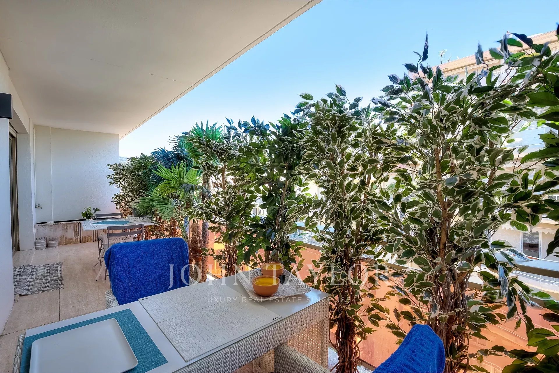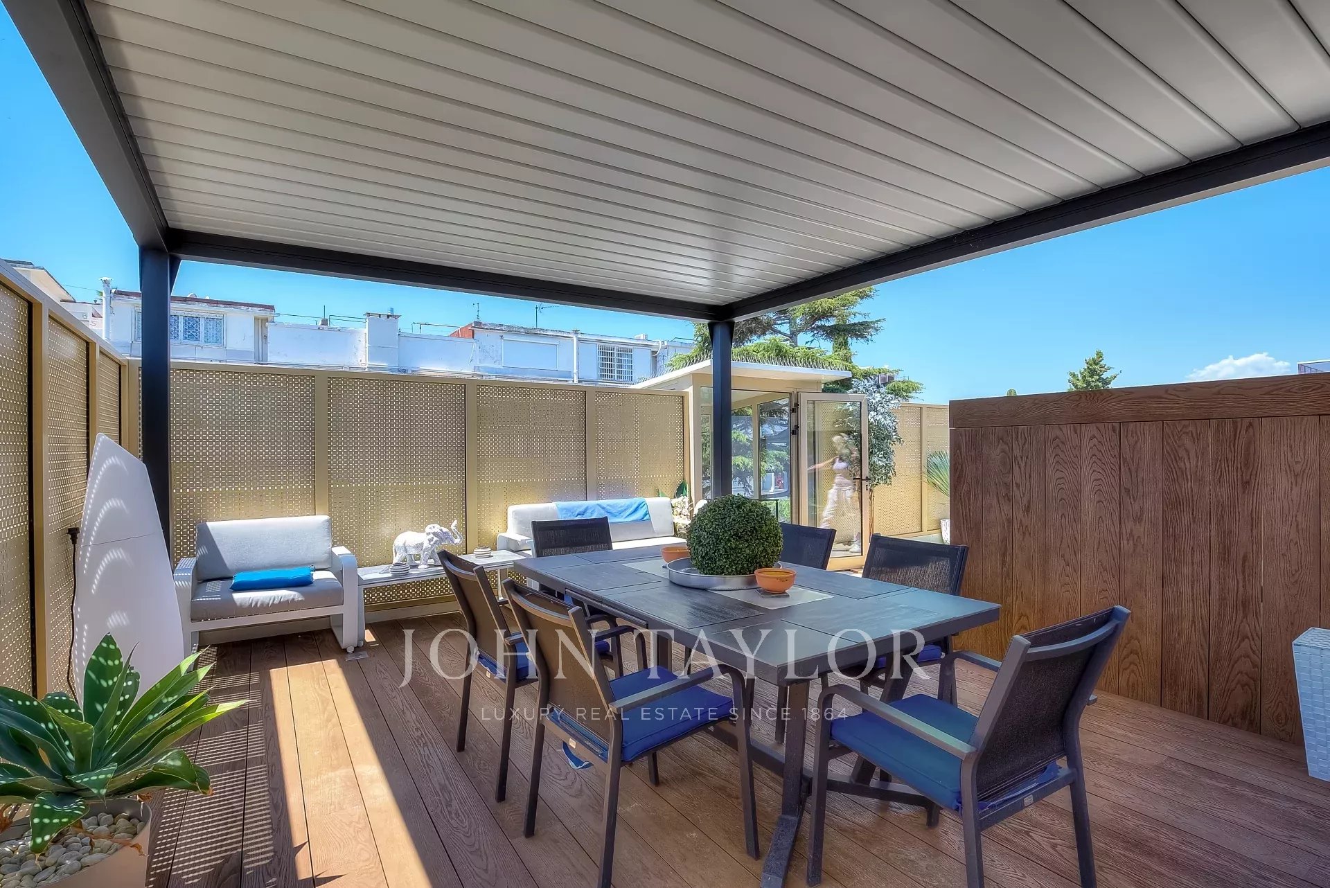 Numa residência de luxo, na 2ª linha da Croisette, um soberbo apartamento contemporâneo de 100 m2 com um terraço de 176 m2 no telhado com piscina privada (5,5 m x 3 m), espreguiçadeiras, sala de estar, área de refeições e cozinha de verão com churrasco.