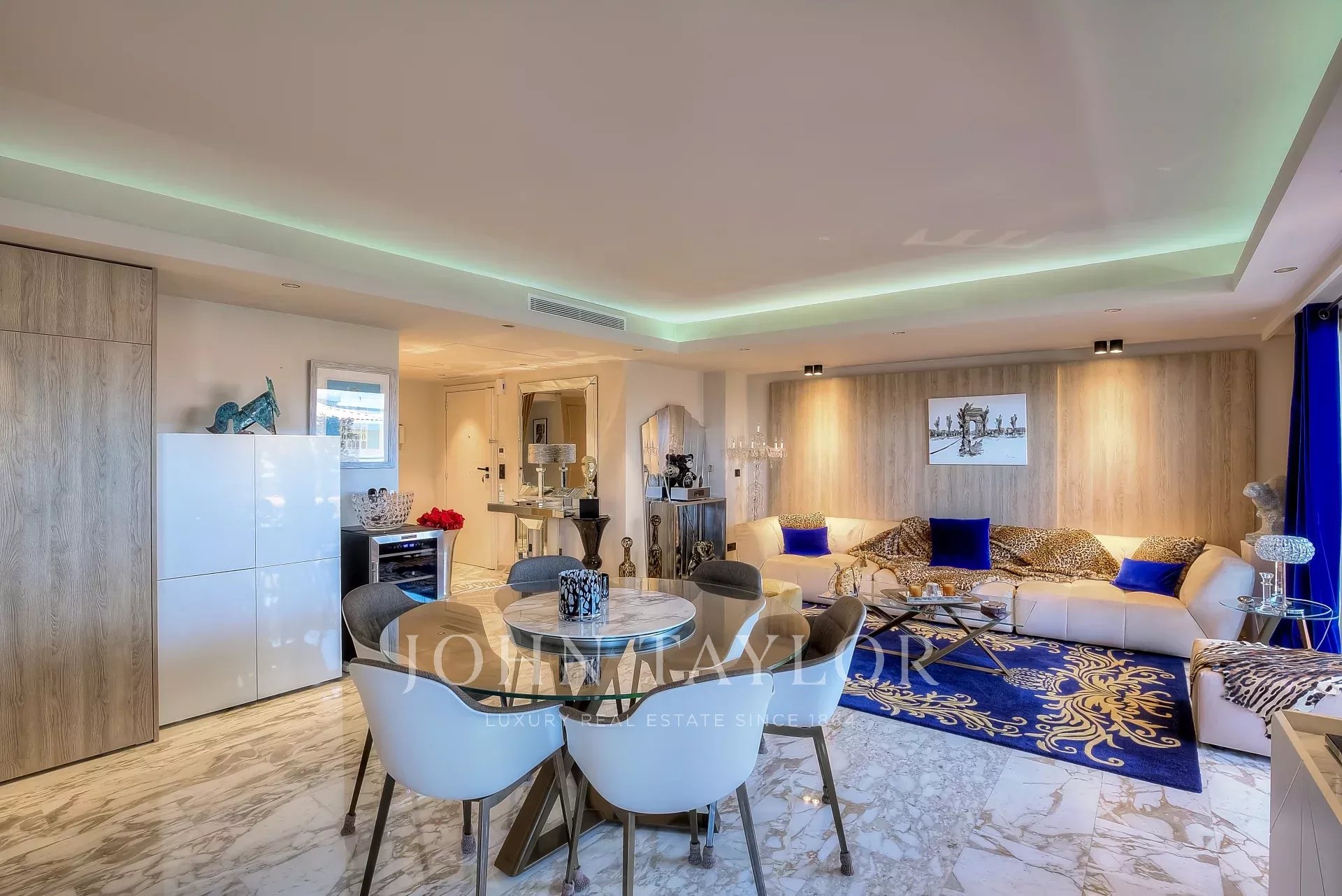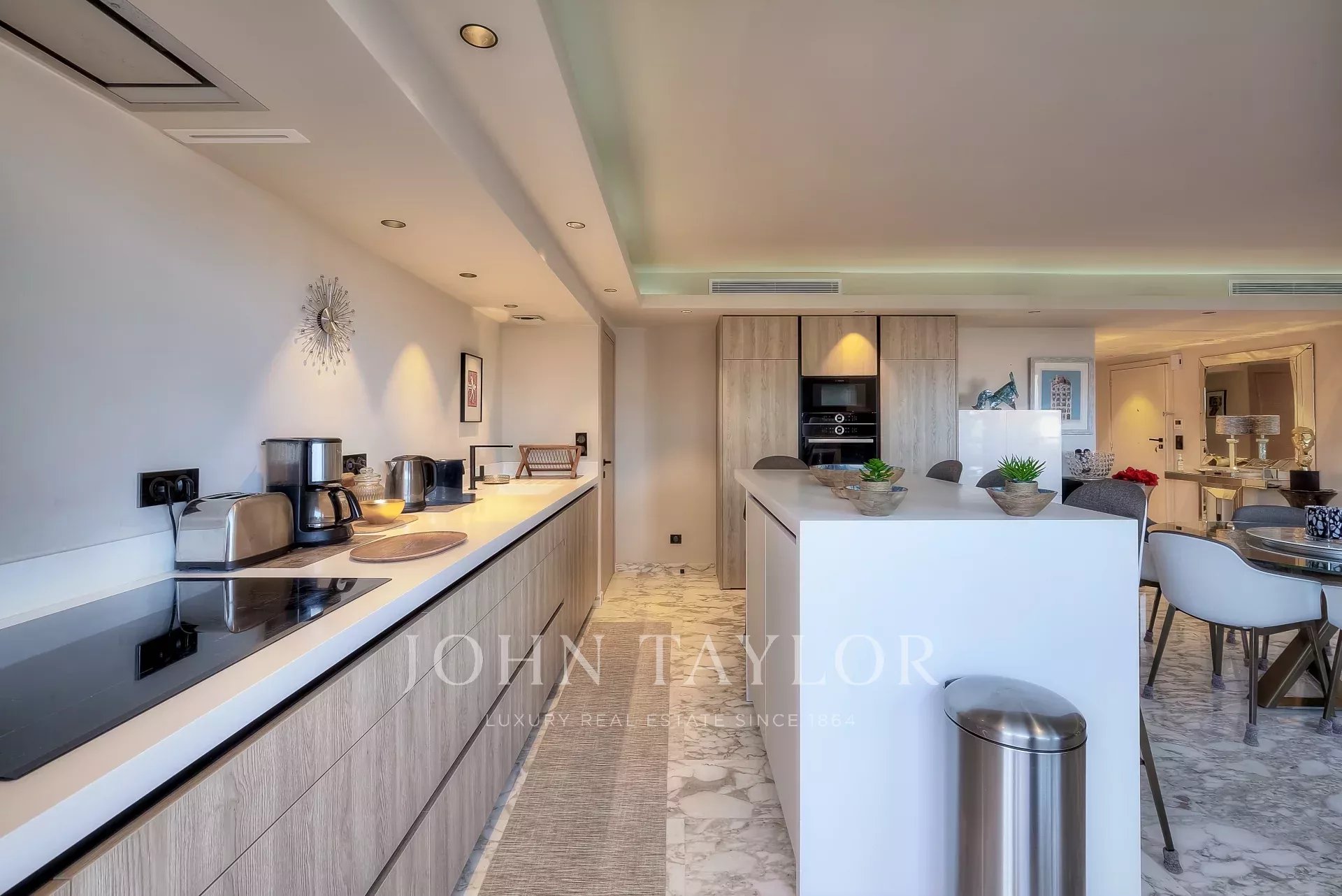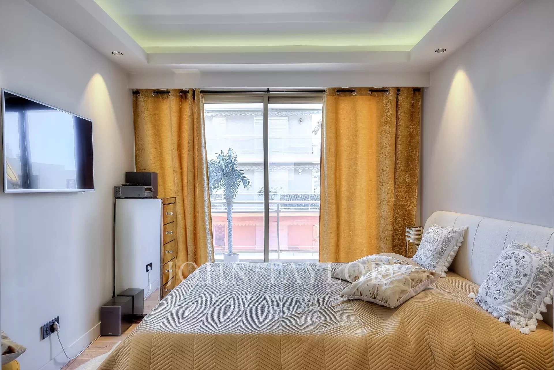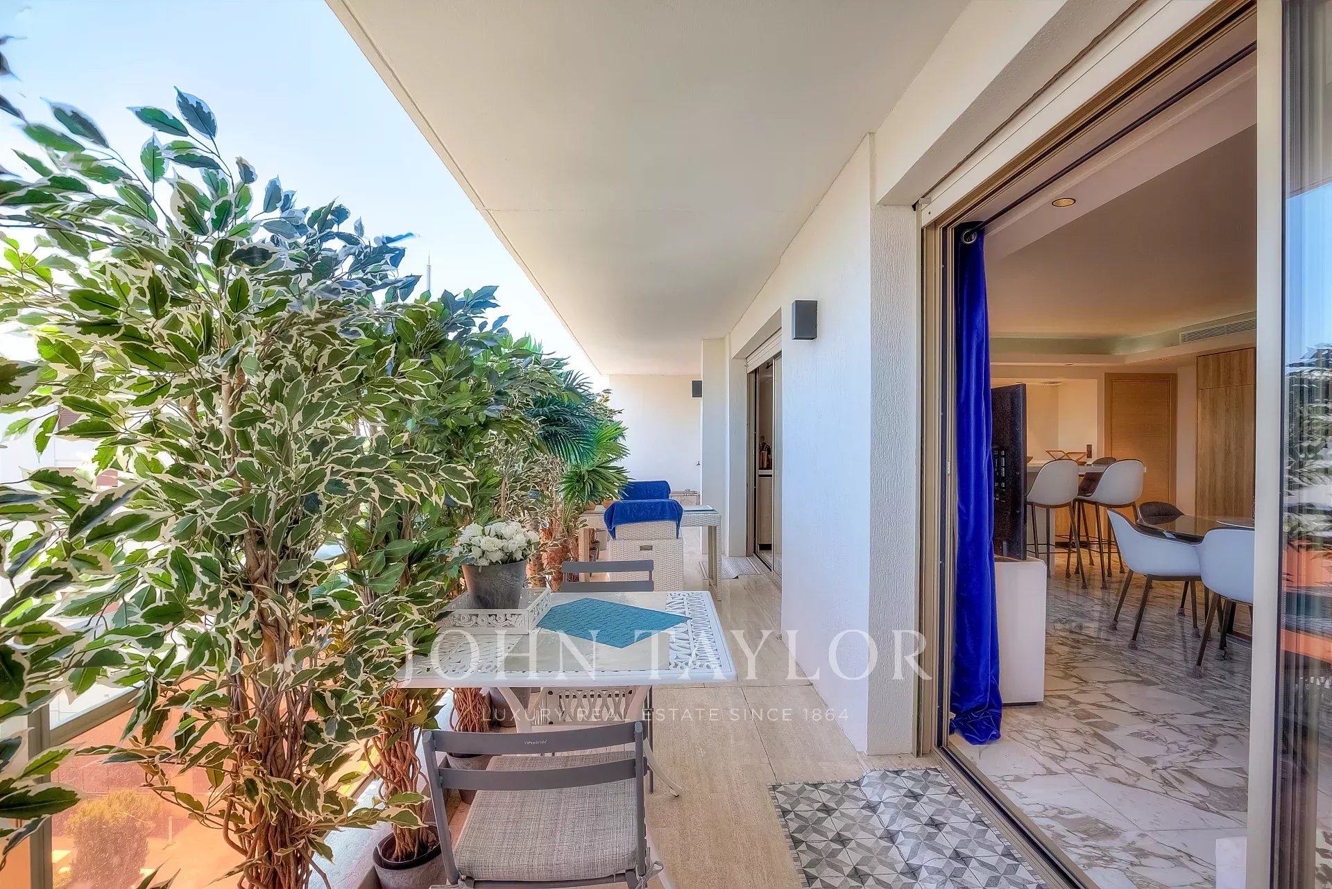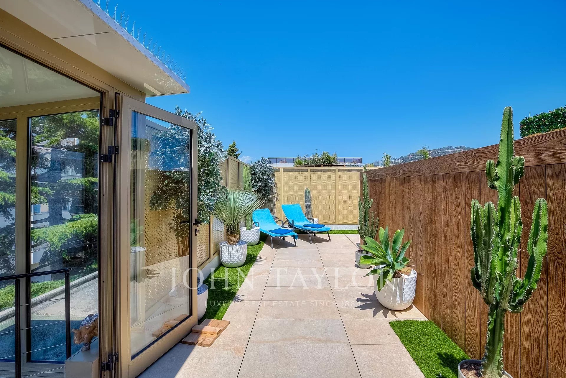 Numa residência de luxo, na 2ª linha da Croisette, um soberbo apartamento contemporâneo de 100 m2 com um terraço de 176 m2 no telhado com piscina privada (5,5 m x 3 m), espreguiçadeiras, sala de estar, área de refeições e cozinha de verão com churrasco.