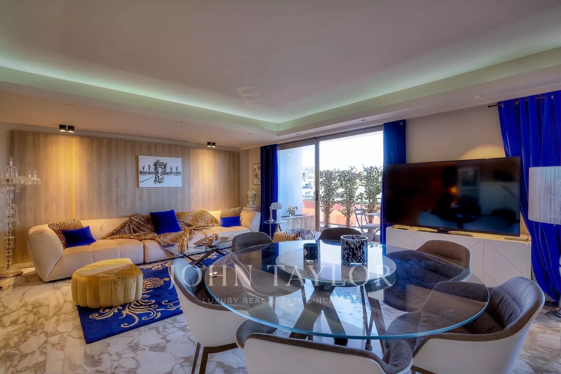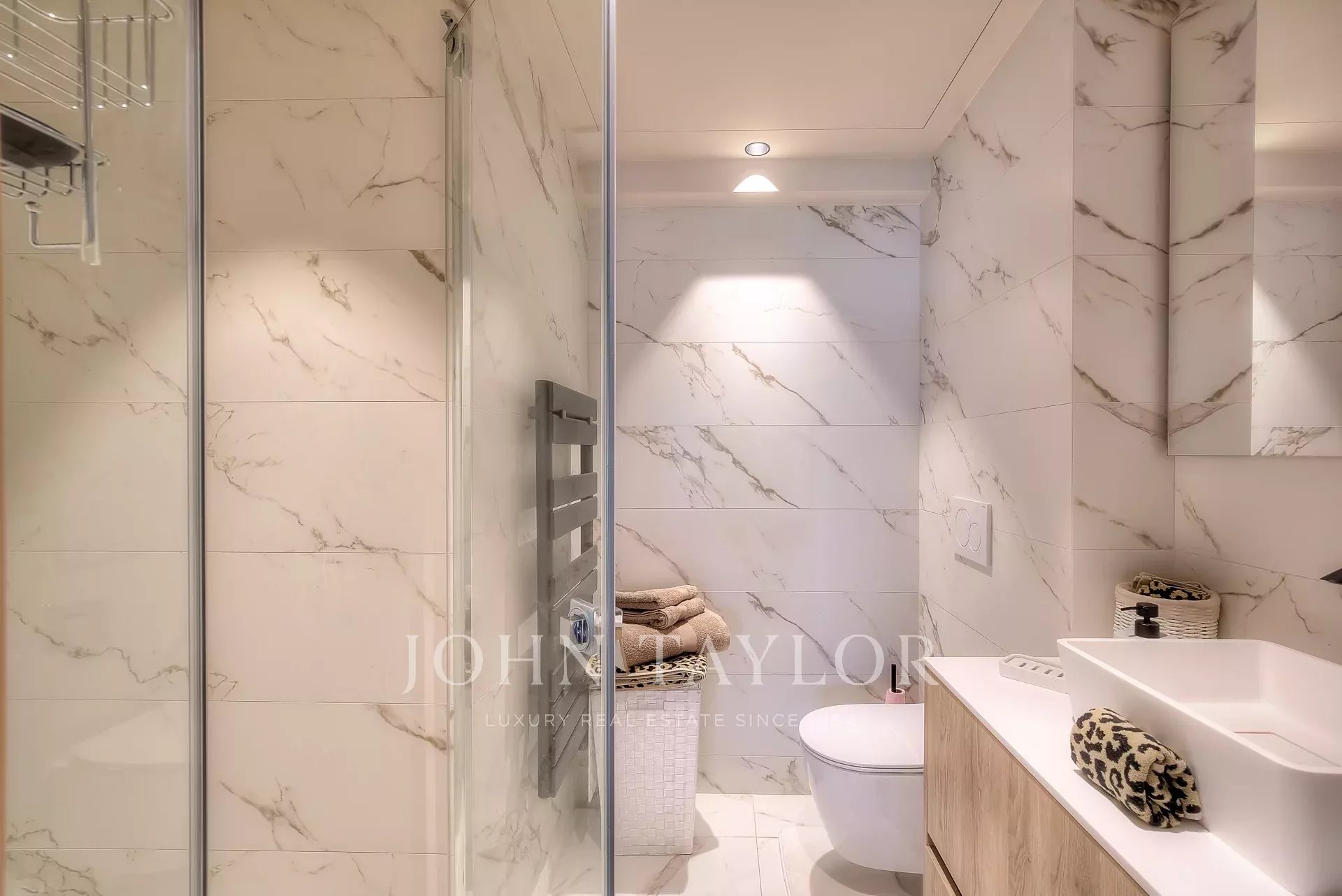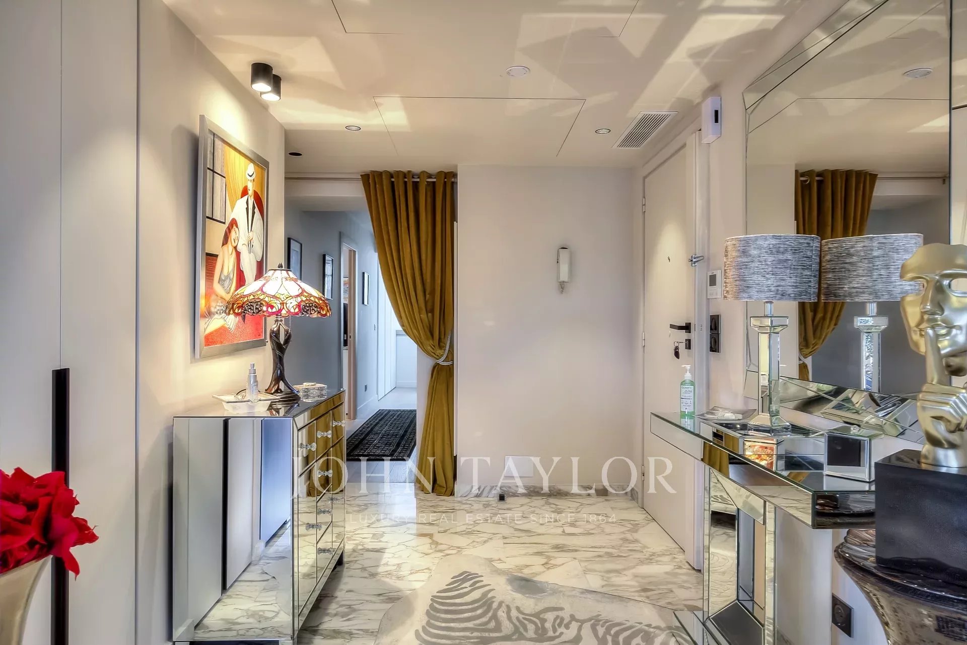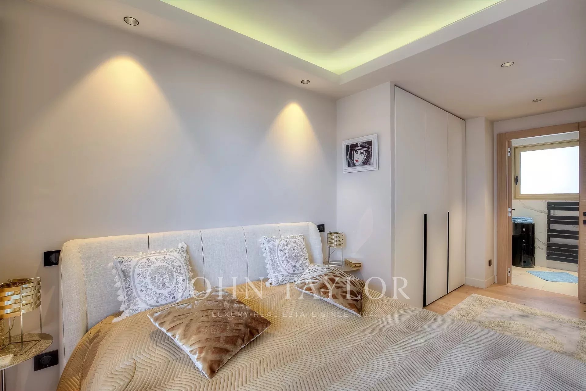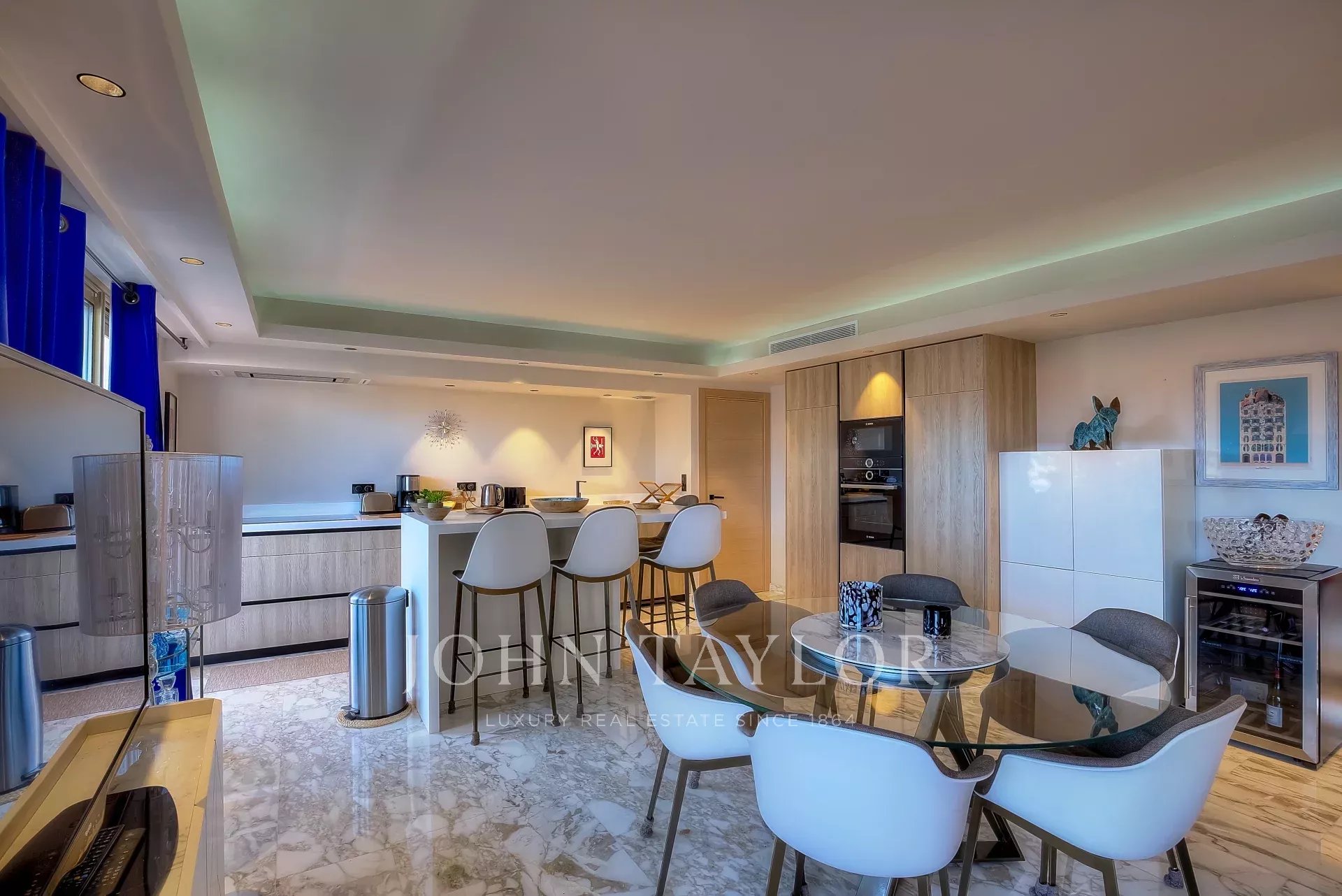 Numa residência de luxo, na 2ª linha da Croisette, um soberbo apartamento contemporâneo de 100 m2 com um terraço de 176 m2 no telhado com piscina privada (5,5 m x 3 m), espreguiçadeiras, sala de estar, área de refeições e cozinha de verão com churrasco.