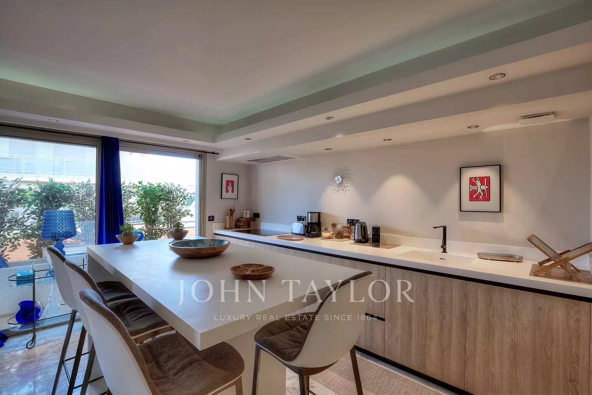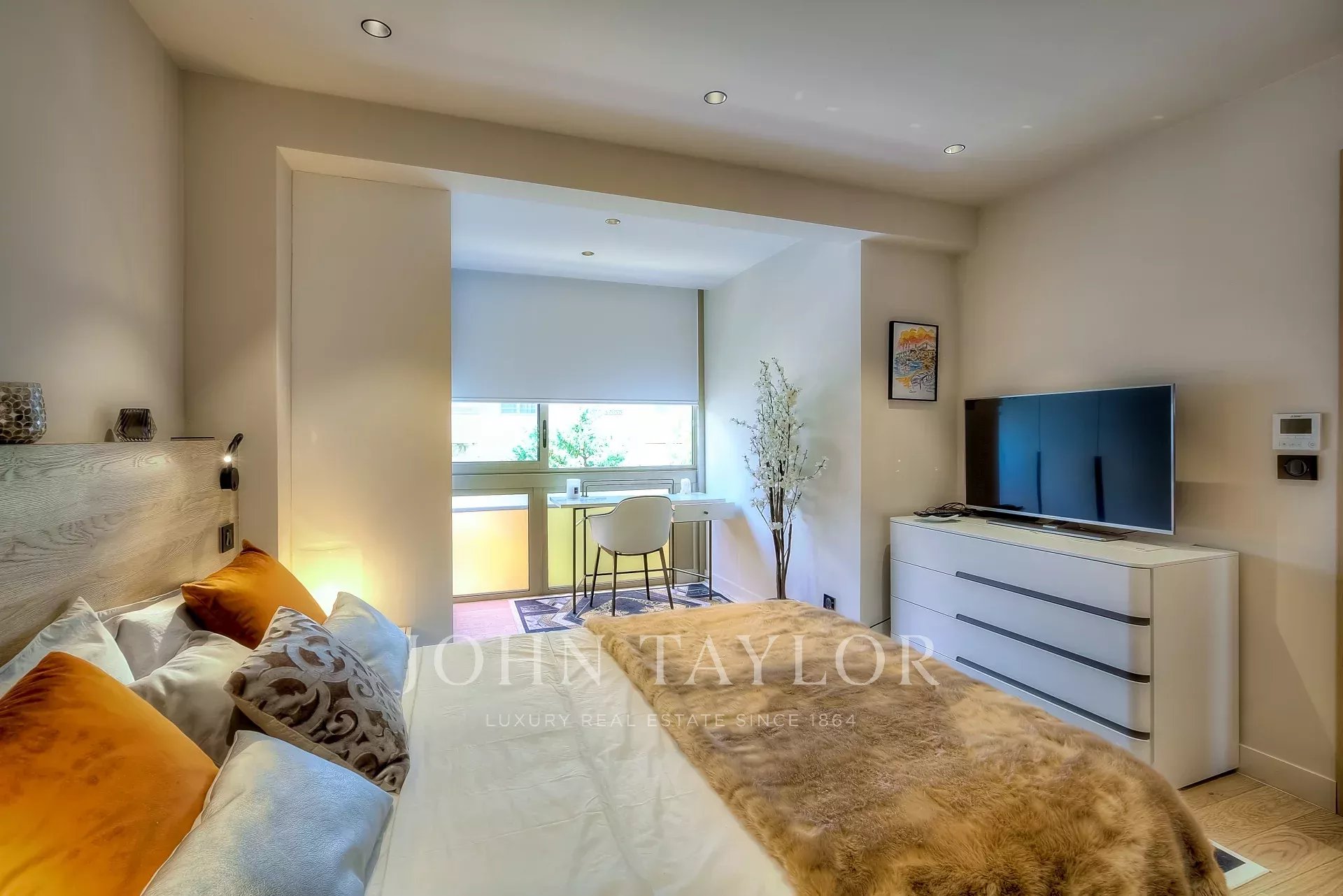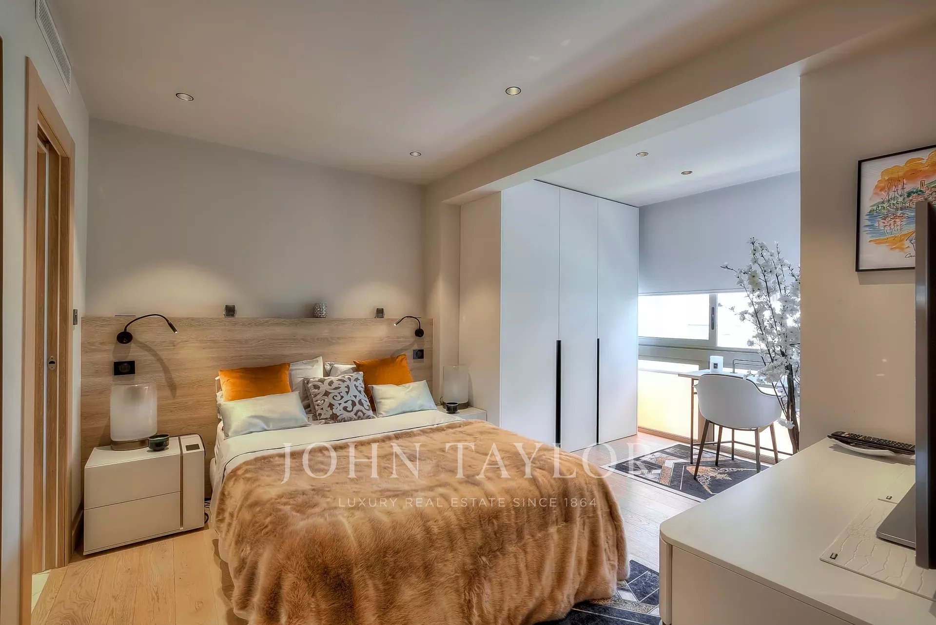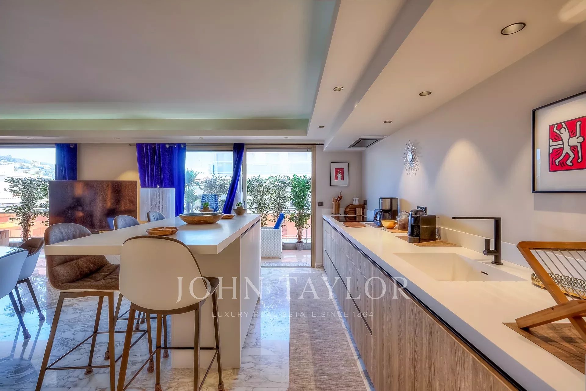 Numa residência de luxo, na 2ª linha da Croisette, um soberbo apartamento contemporâneo de 100 m2 com um terraço de 176 m2 no telhado com piscina privada (5,5 m x 3 m), espreguiçadeiras, sala de estar, área de refeições e cozinha de verão com churrasco.