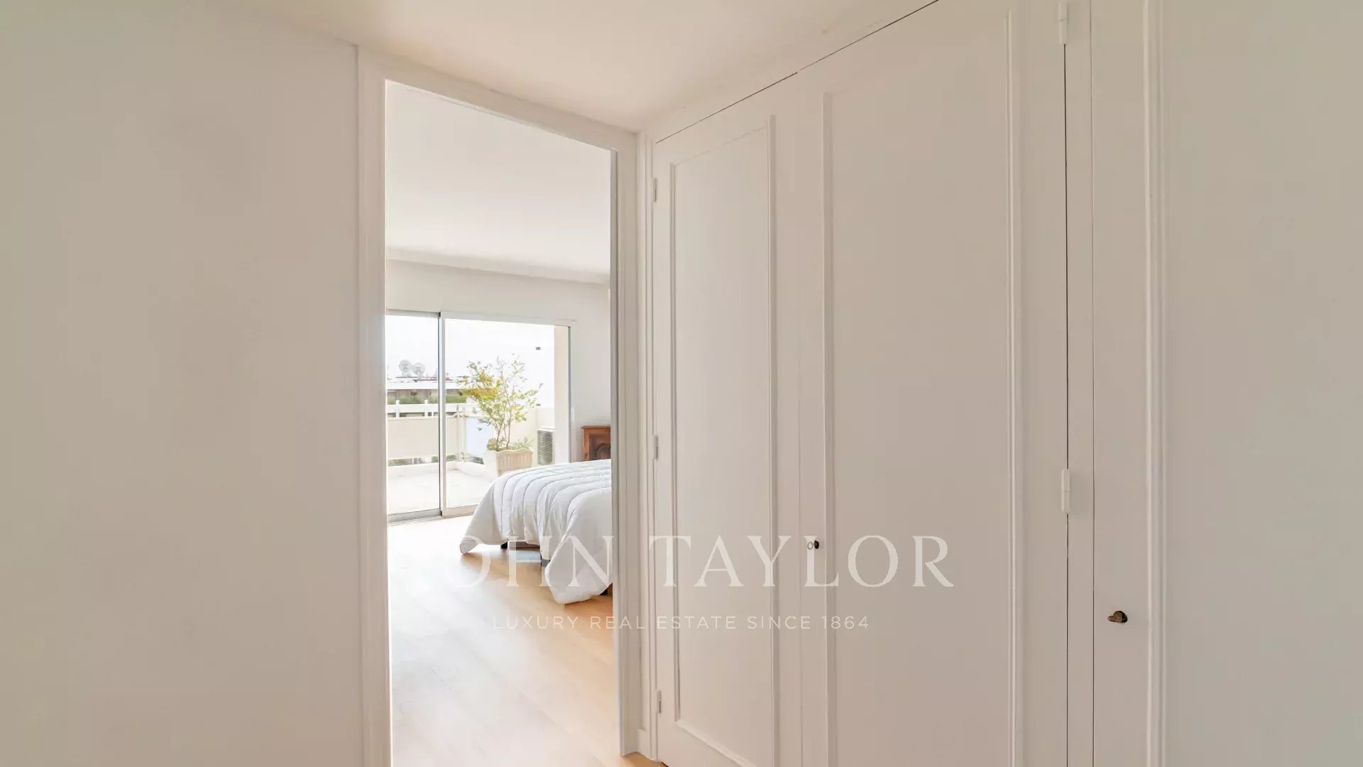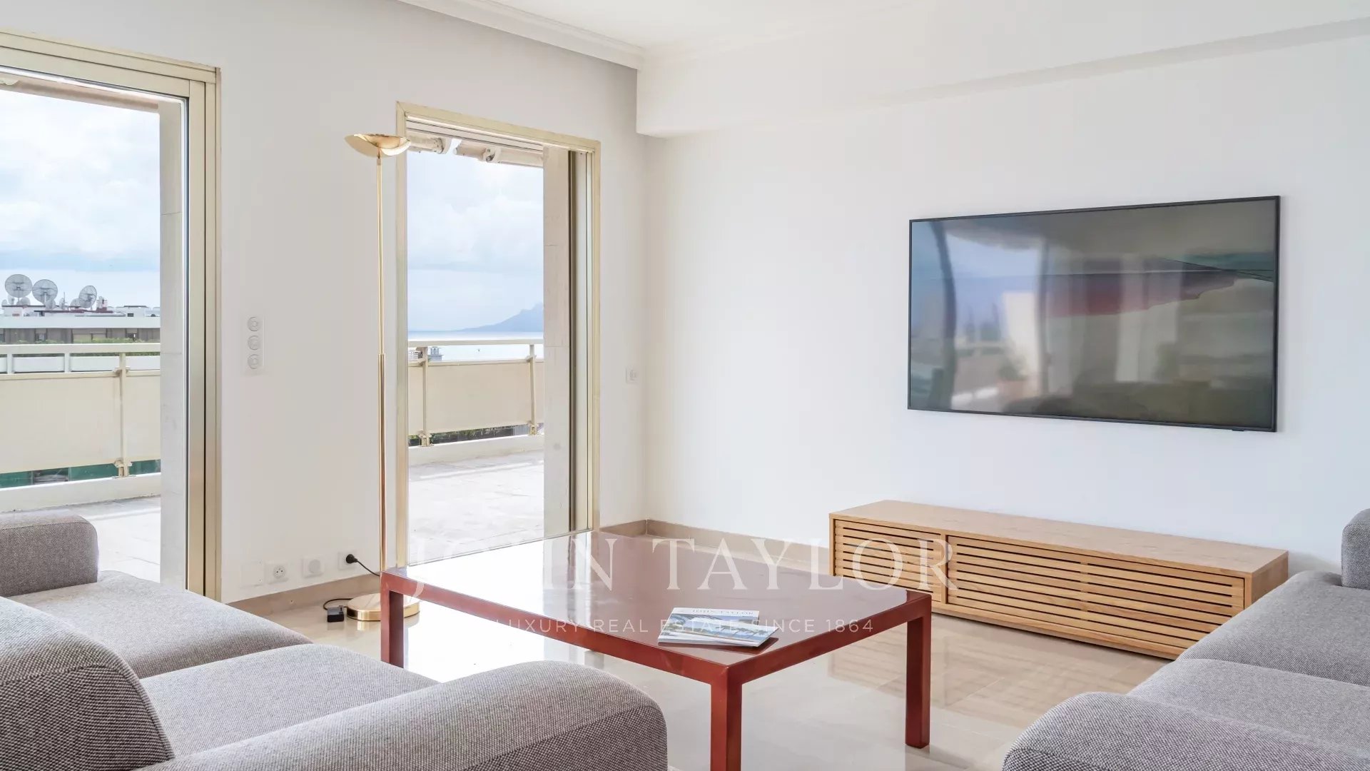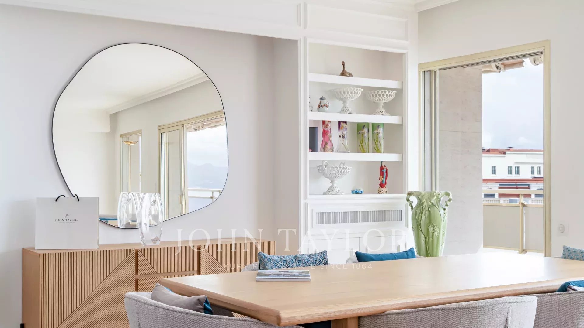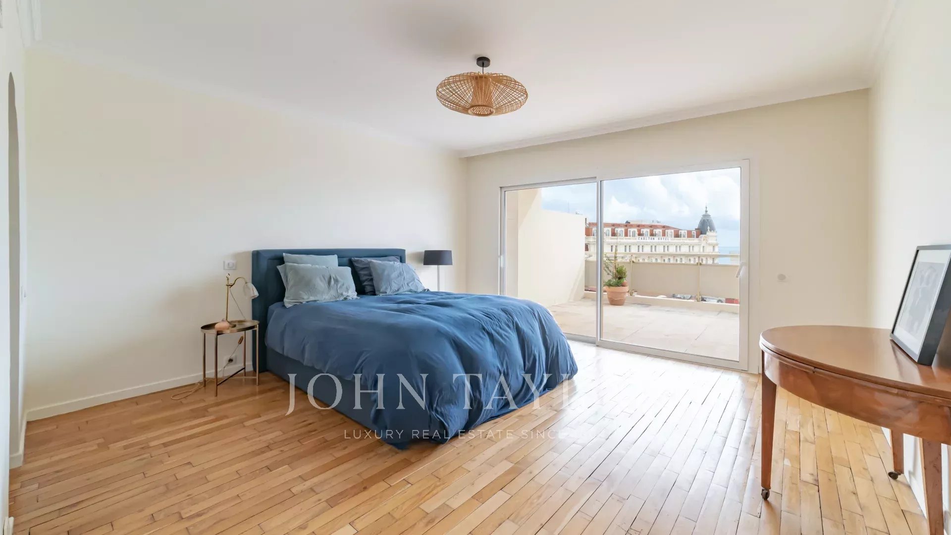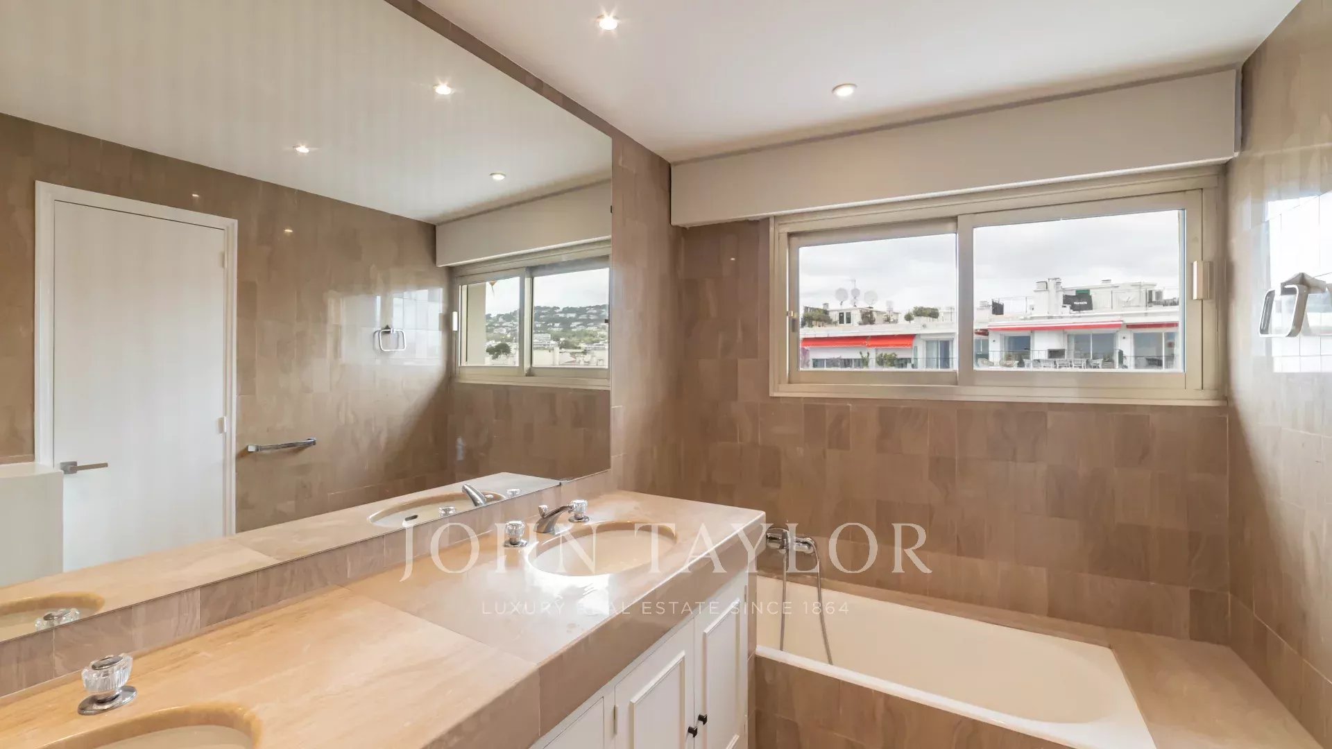 Este apartamento de 140 m2, virado a sul e totalmente climatizado, situa-se no último andar (8º) de uma residência no centro da cidade, a poucos minutos a pé das praias e do Palais des Festivals.