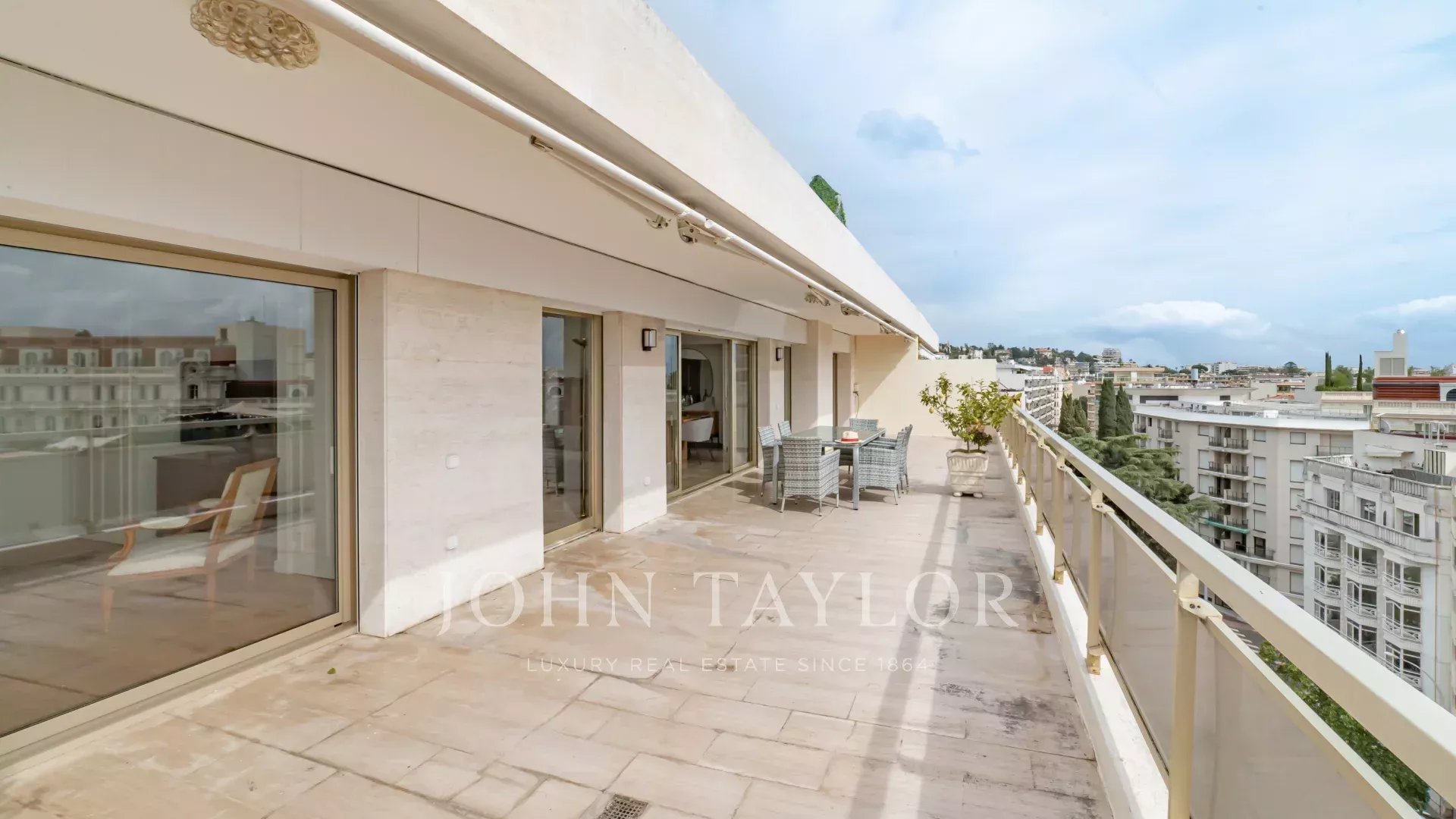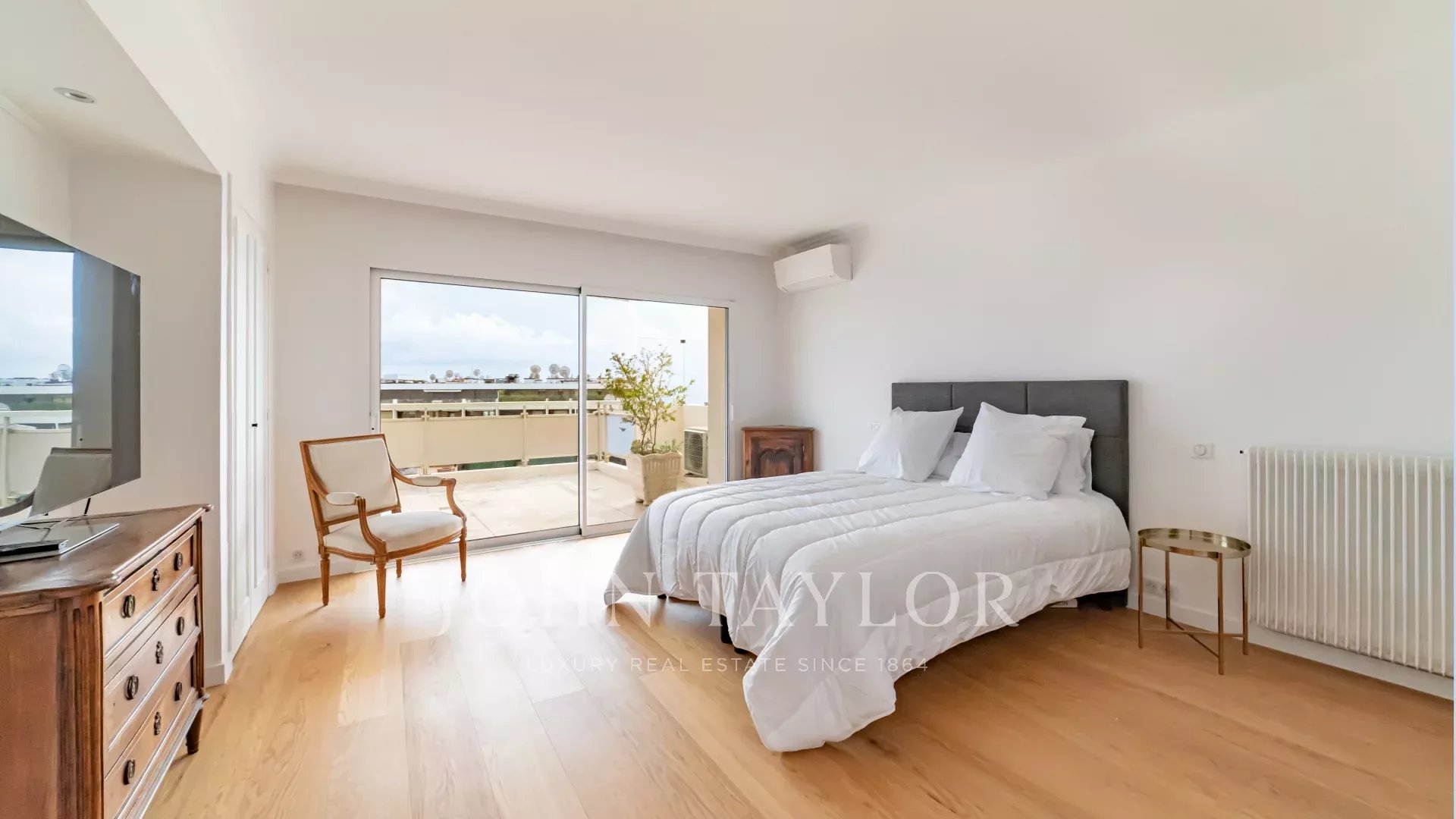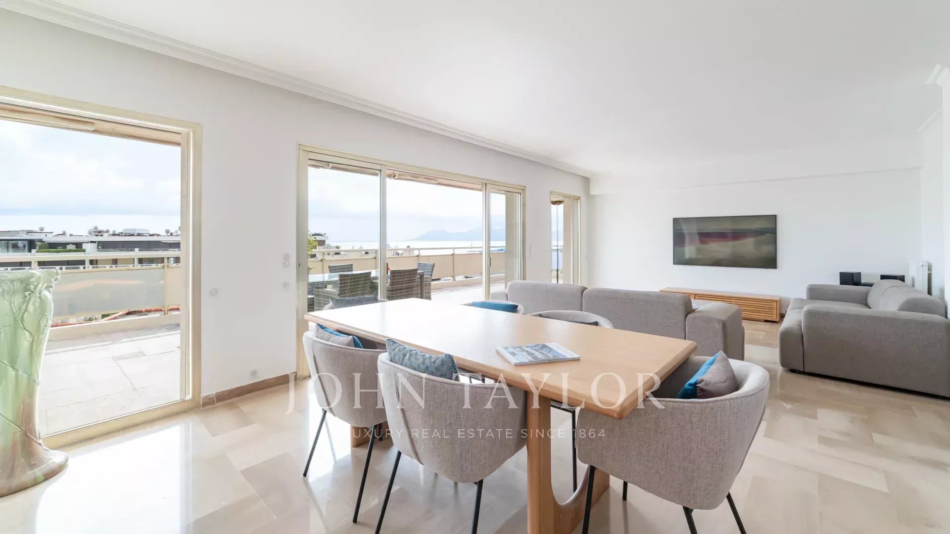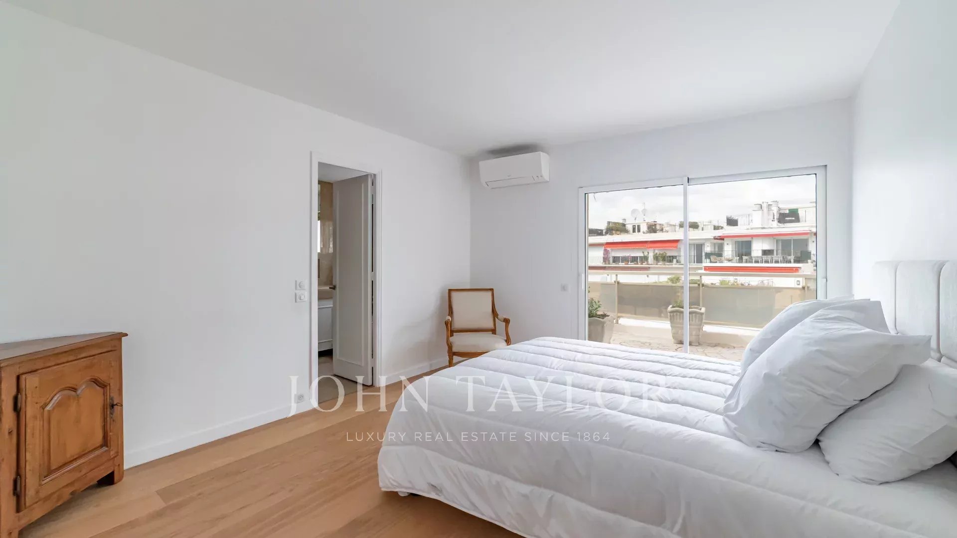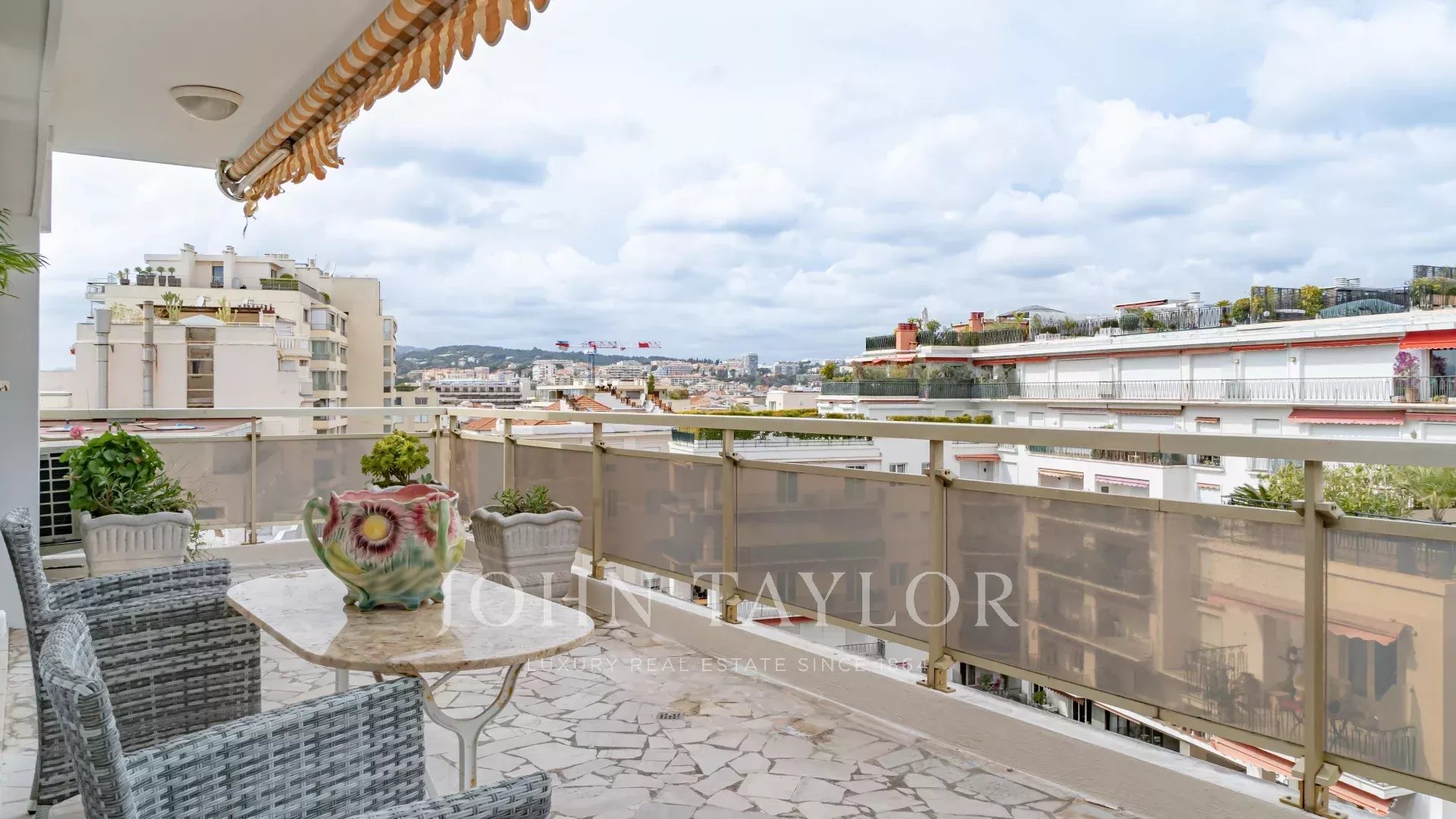 Este apartamento de 140 m2, virado a sul e totalmente climatizado, situa-se no último andar (8º) de uma residência no centro da cidade, a poucos minutos a pé das praias e do Palais des Festivals.