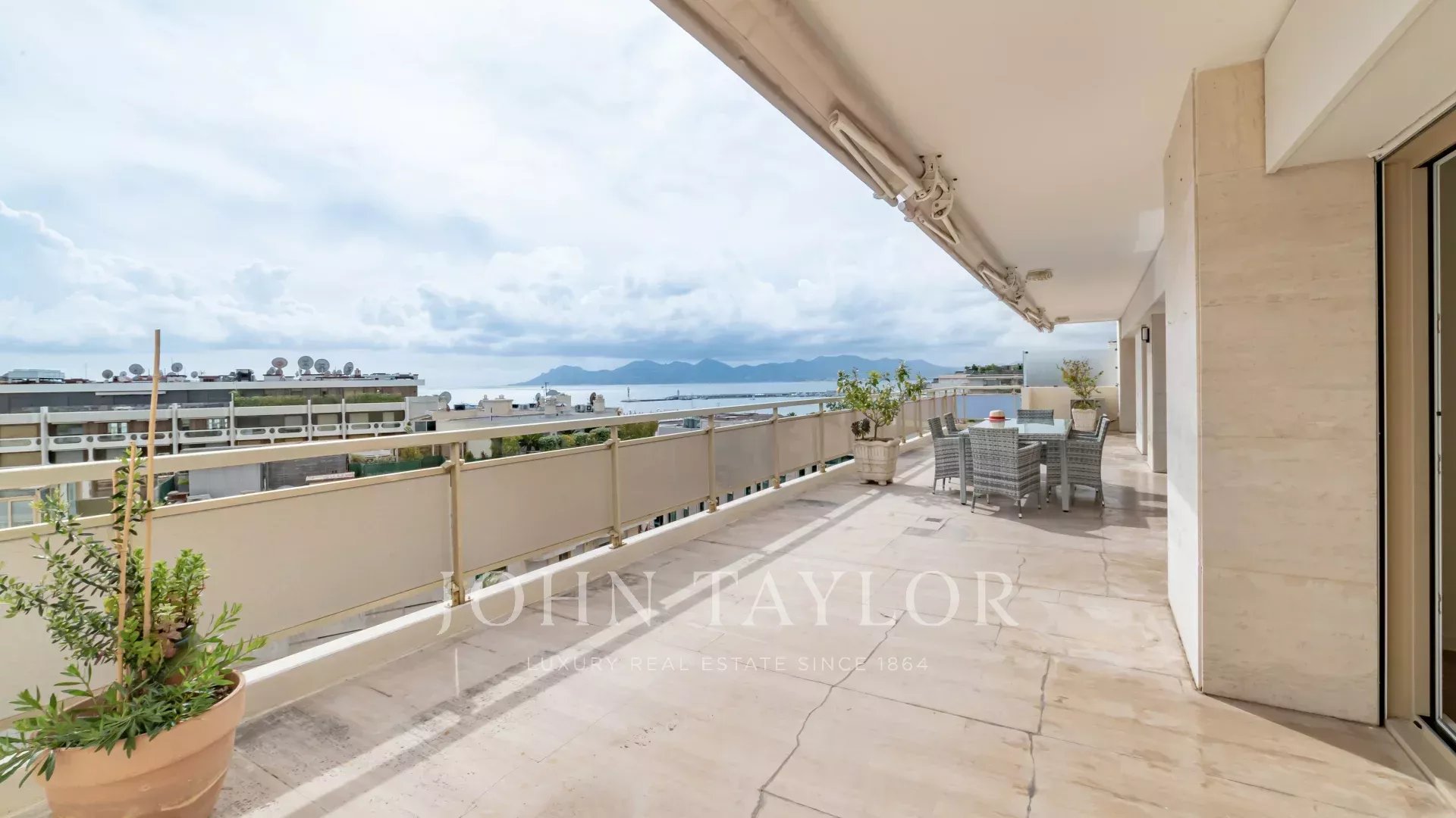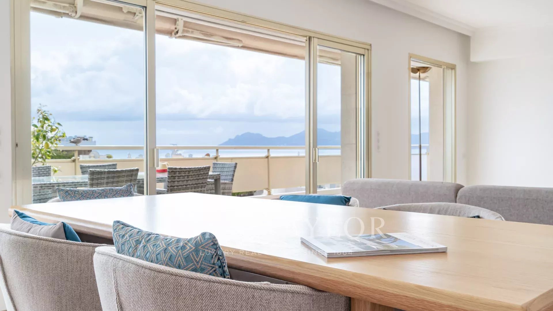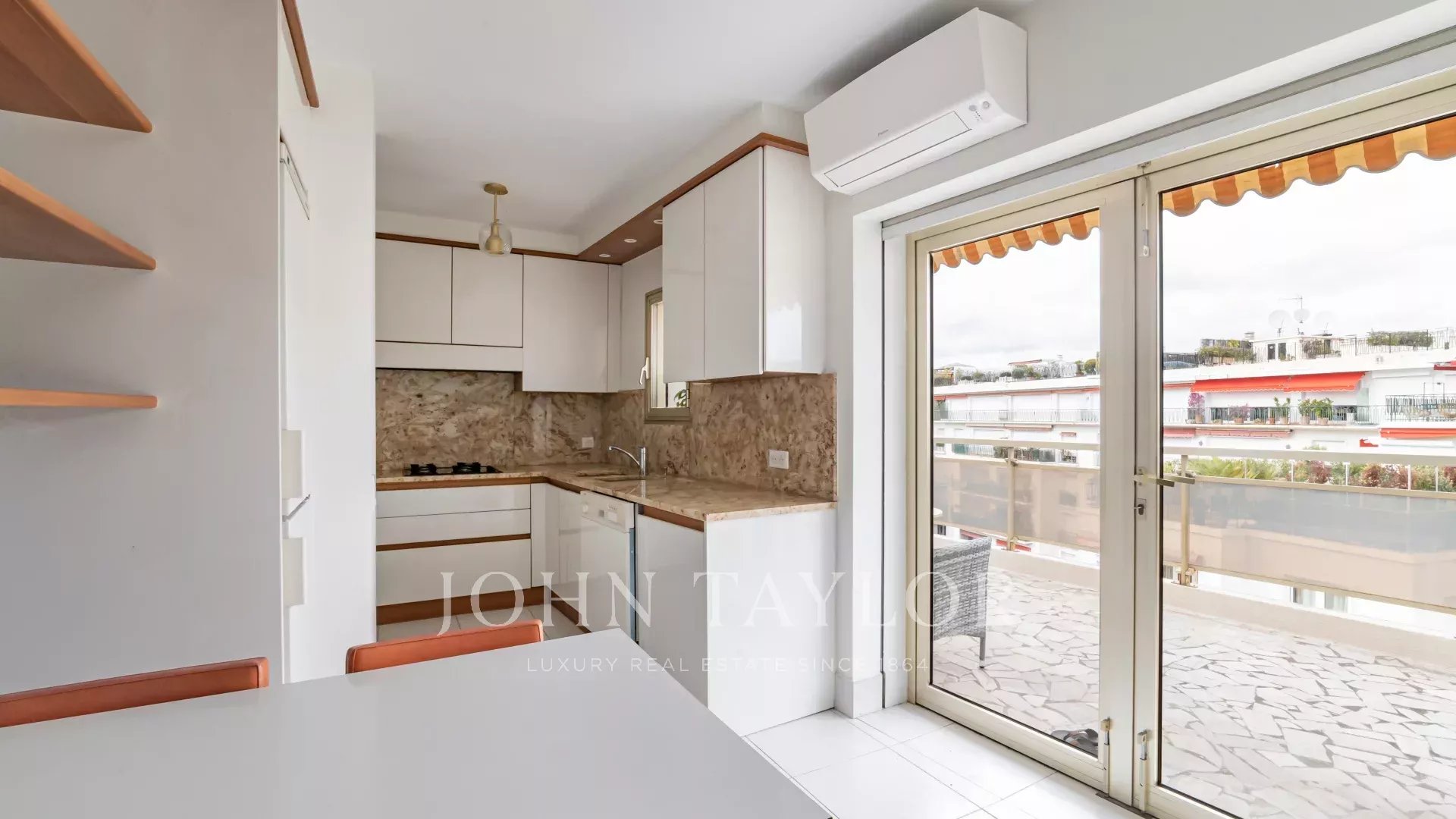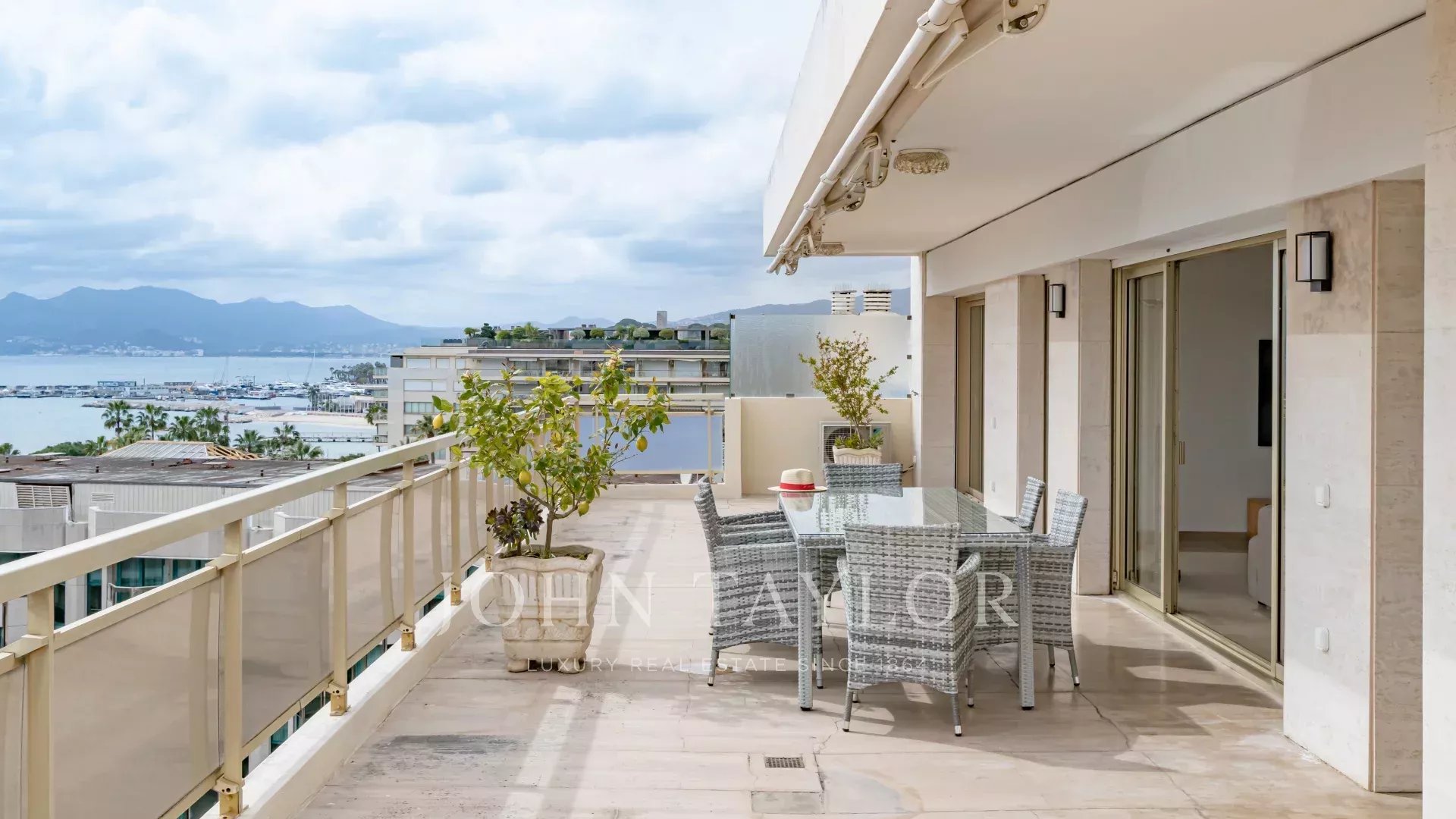 Este apartamento de 140 m2, virado a sul e totalmente climatizado, situa-se no último andar (8º) de uma residência no centro da cidade, a poucos minutos a pé das praias e do Palais des Festivals.