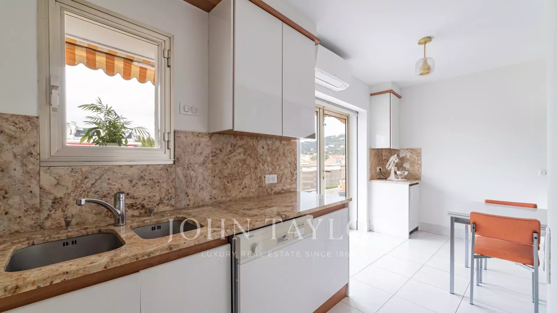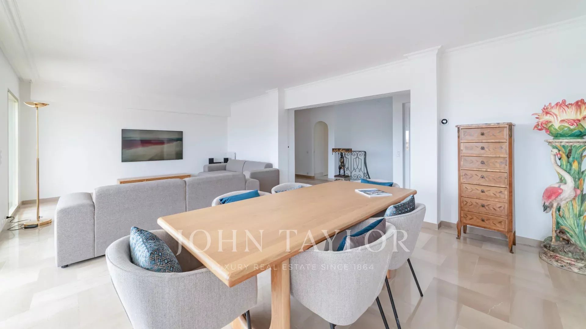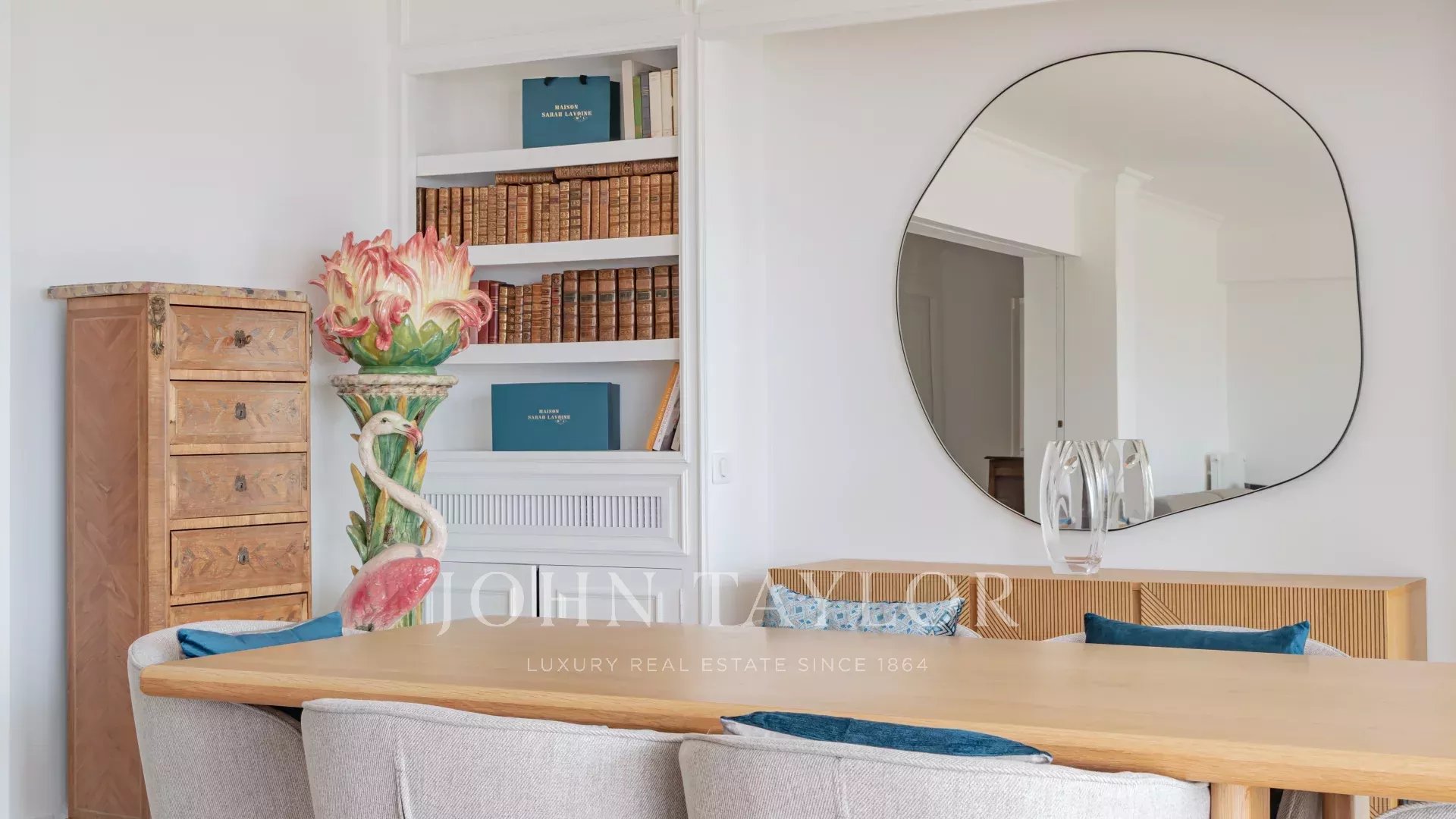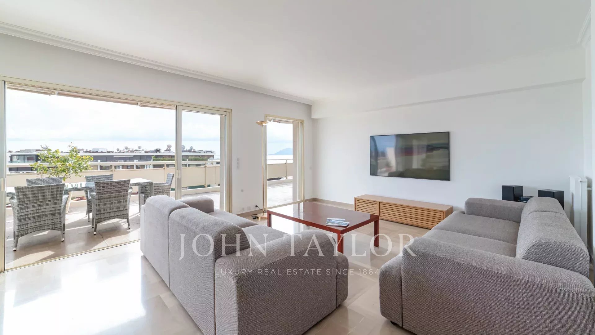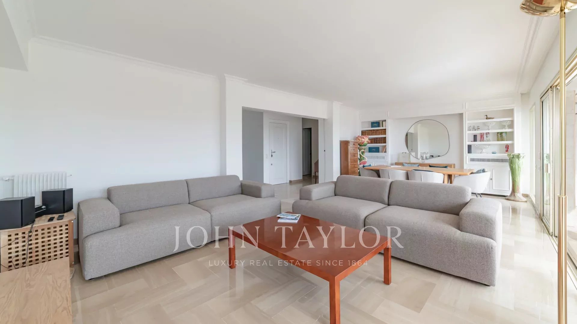 Este apartamento de 140 m2, virado a sul e totalmente climatizado, situa-se no último andar (8º) de uma residência no centro da cidade, a poucos minutos a pé das praias e do Palais des Festivals.