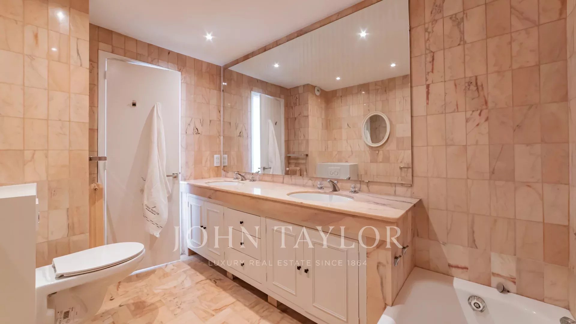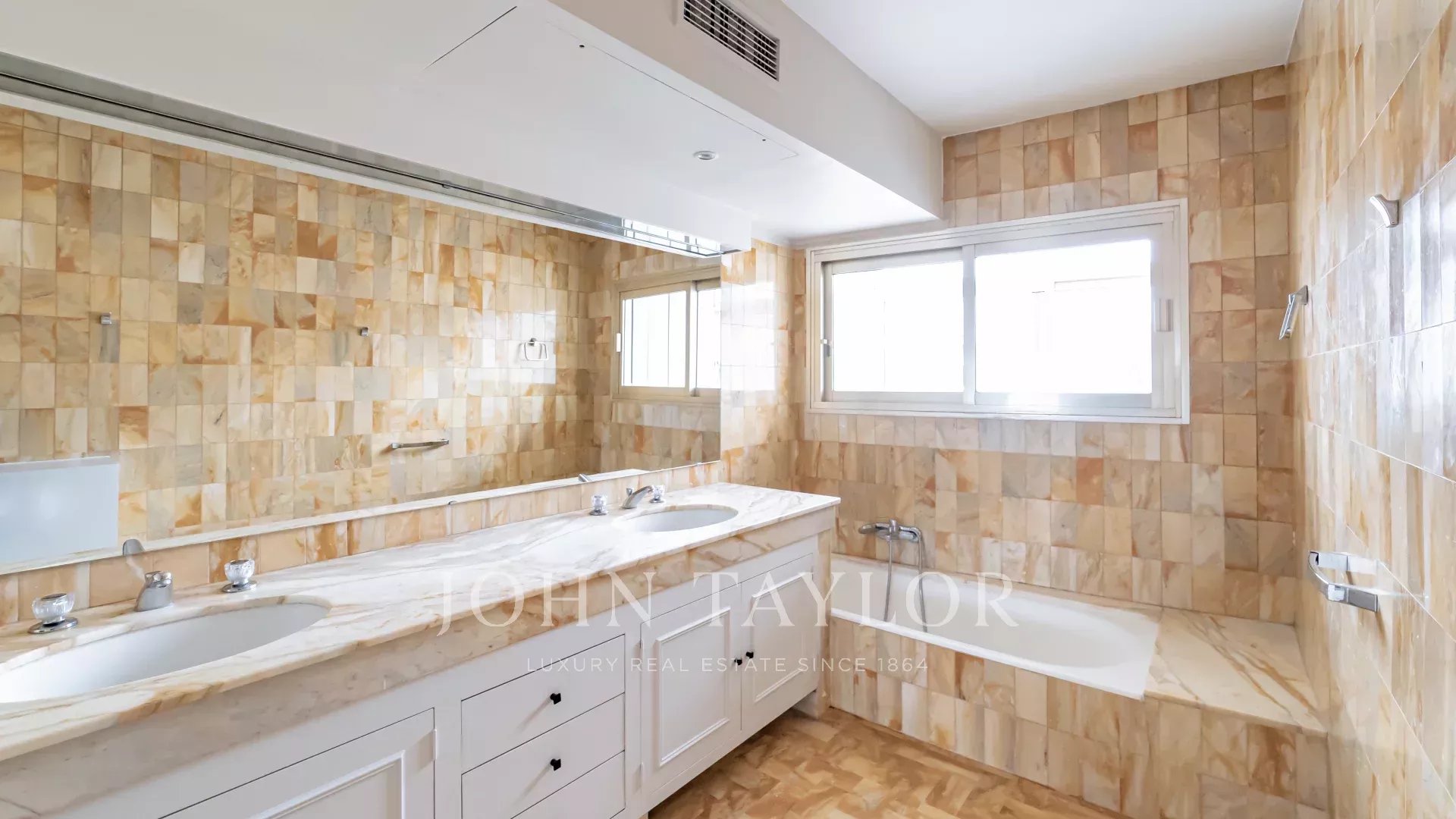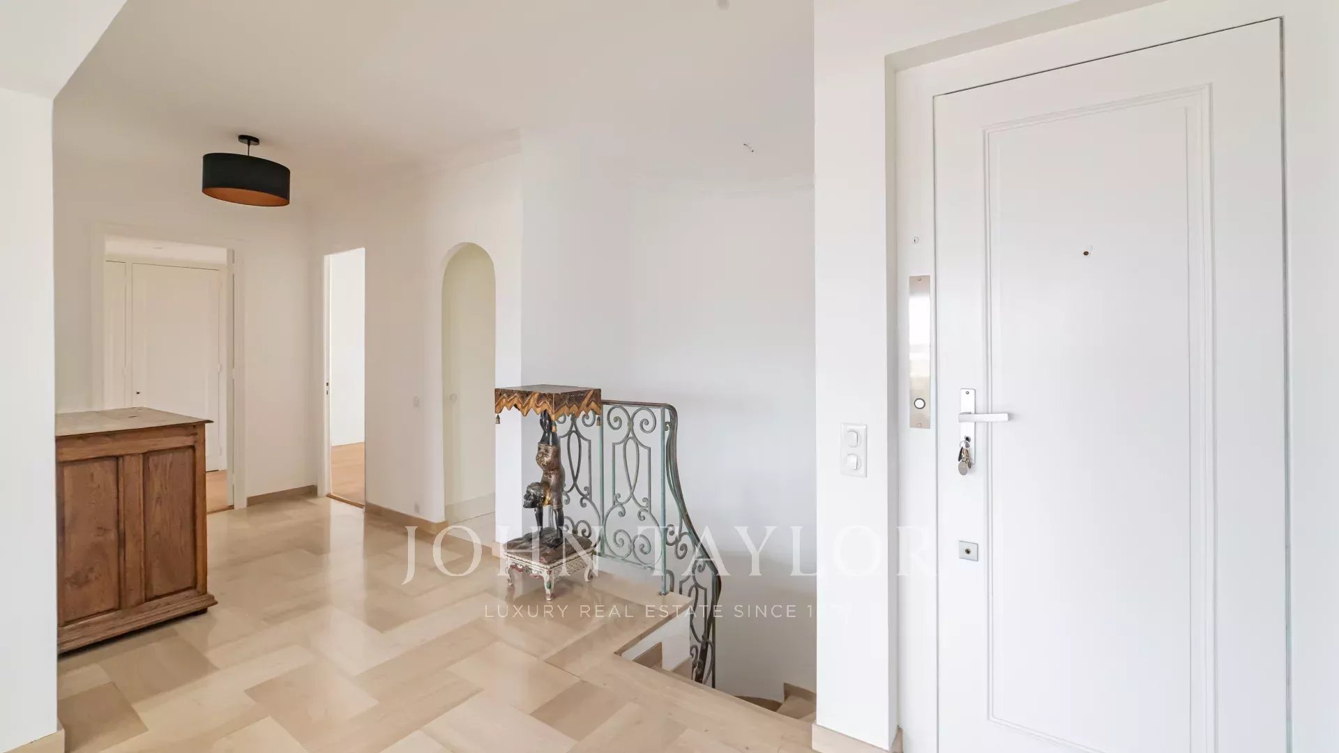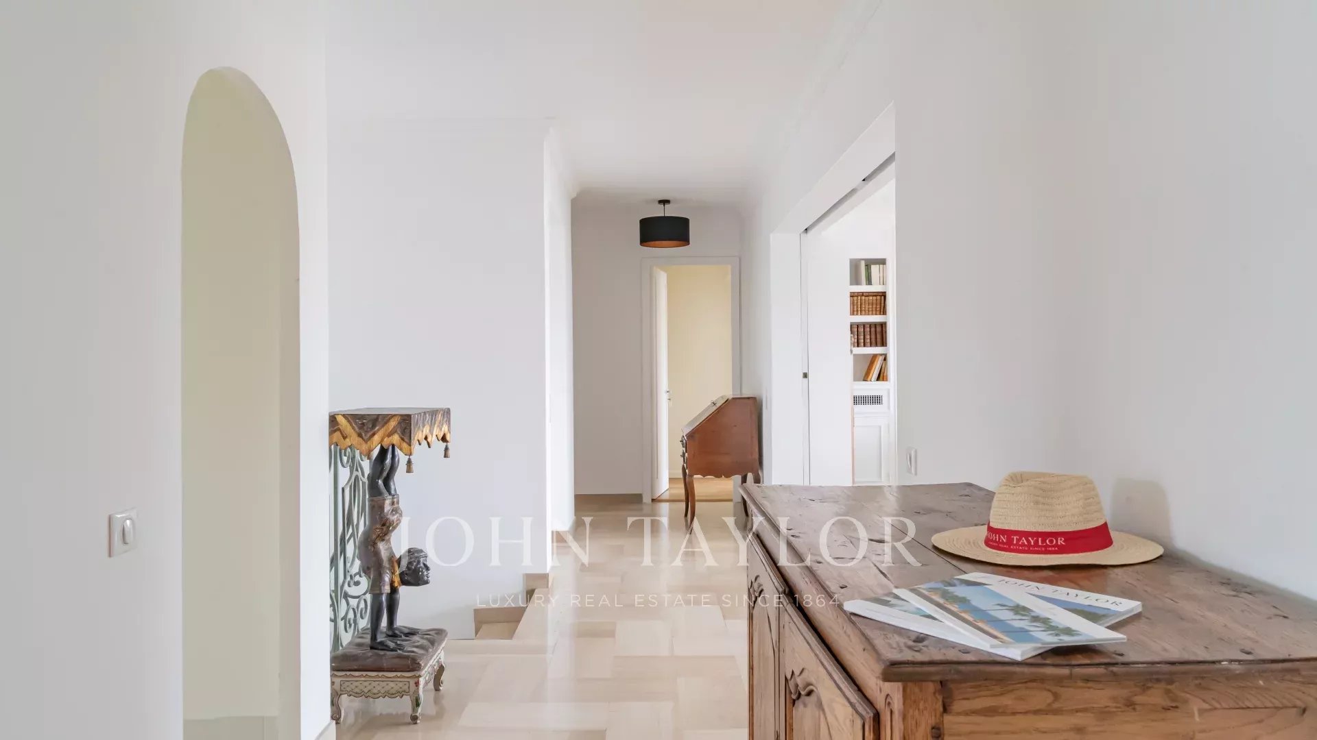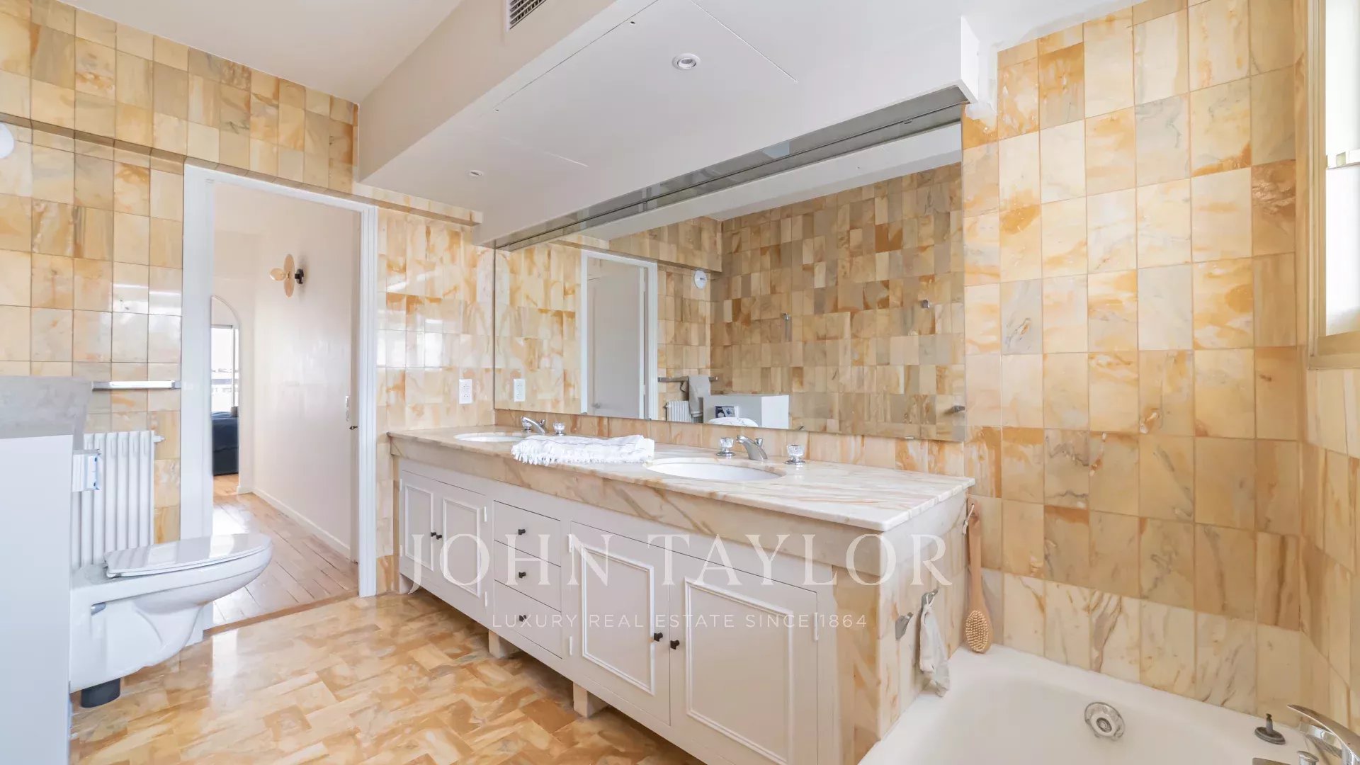 Este apartamento de 140 m2, virado a sul e totalmente climatizado, situa-se no último andar (8º) de uma residência no centro da cidade, a poucos minutos a pé das praias e do Palais des Festivals.