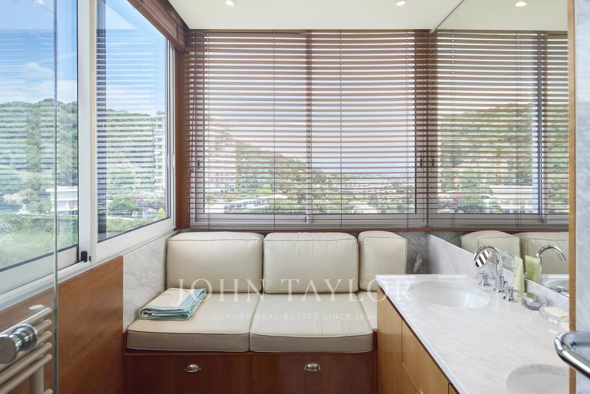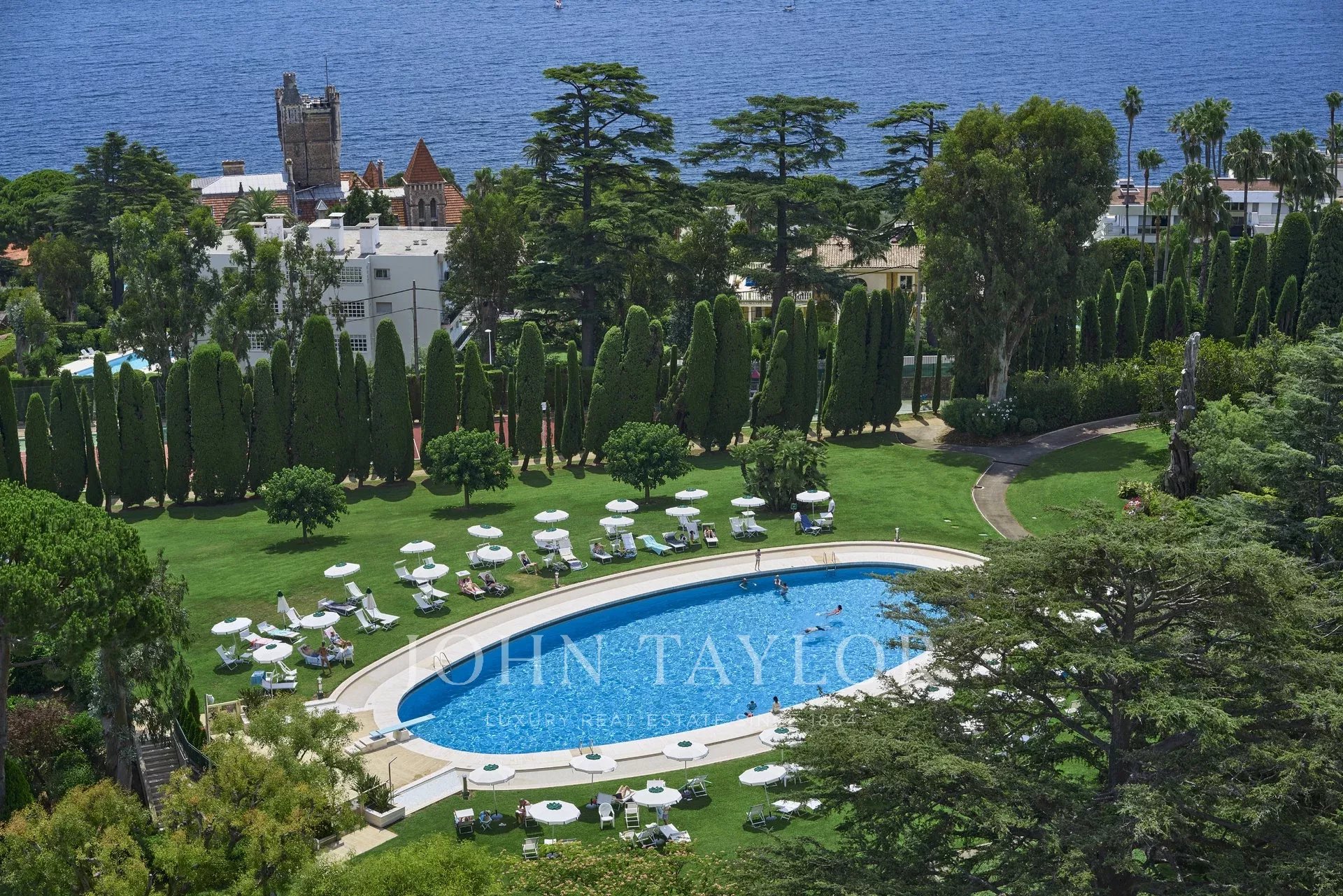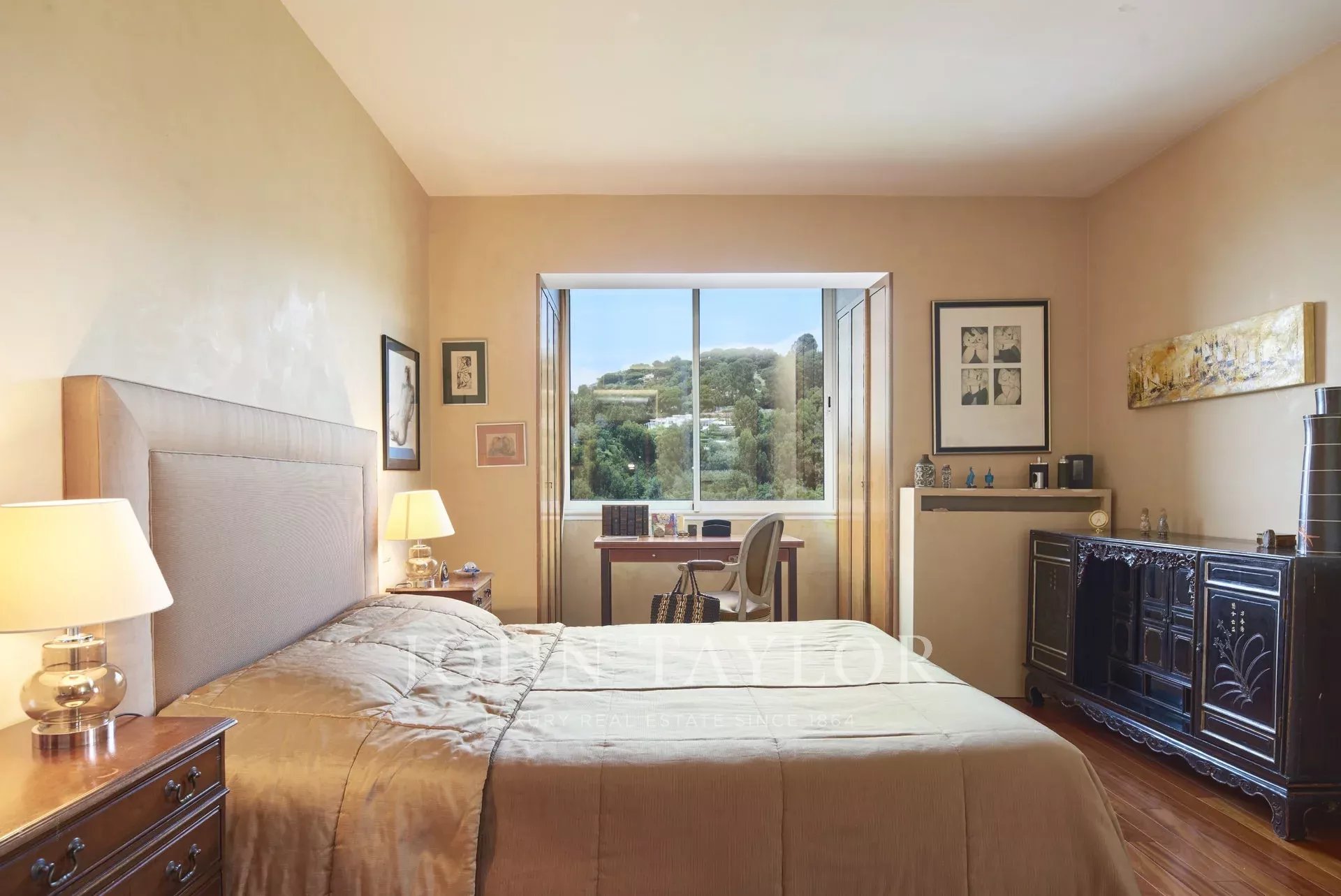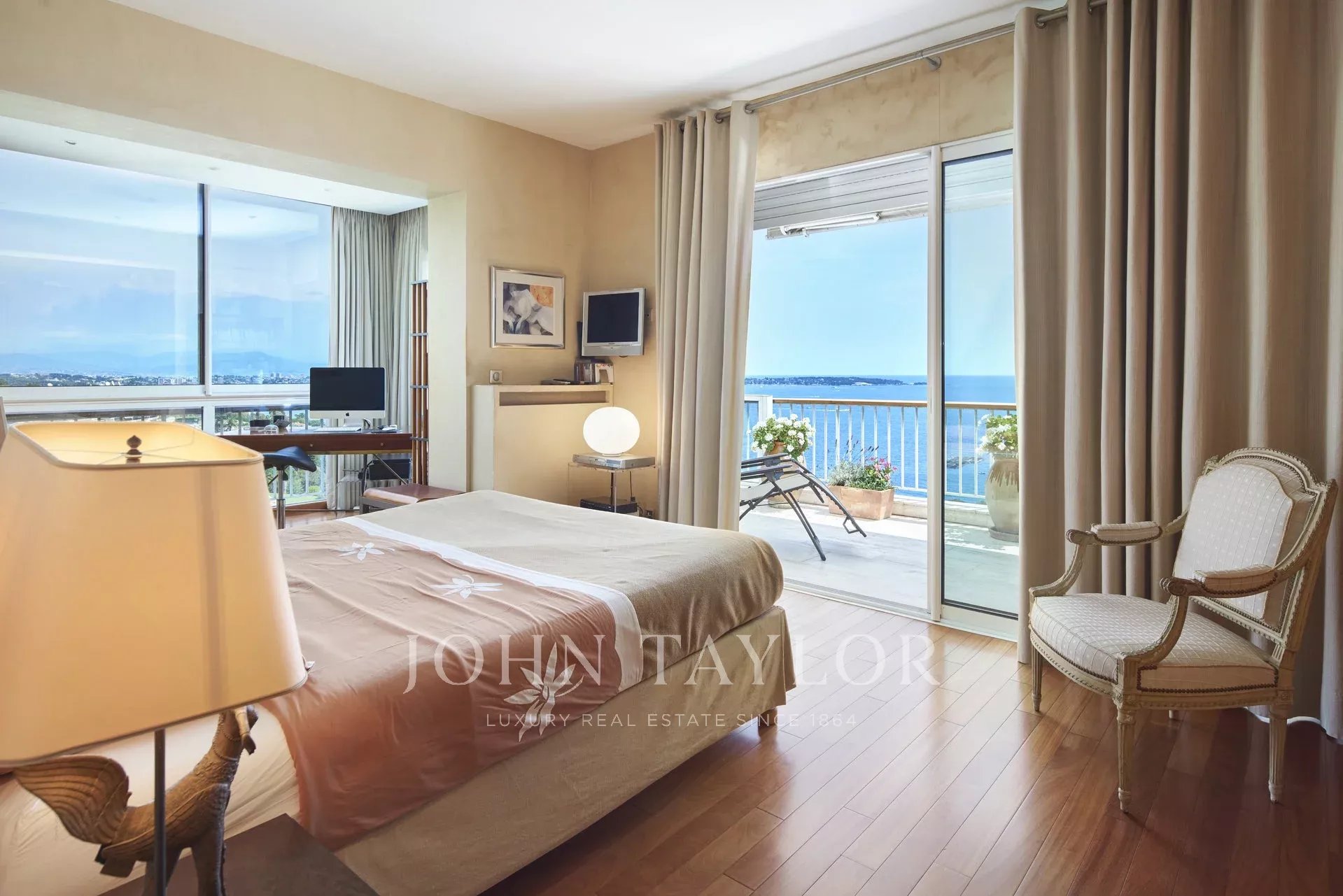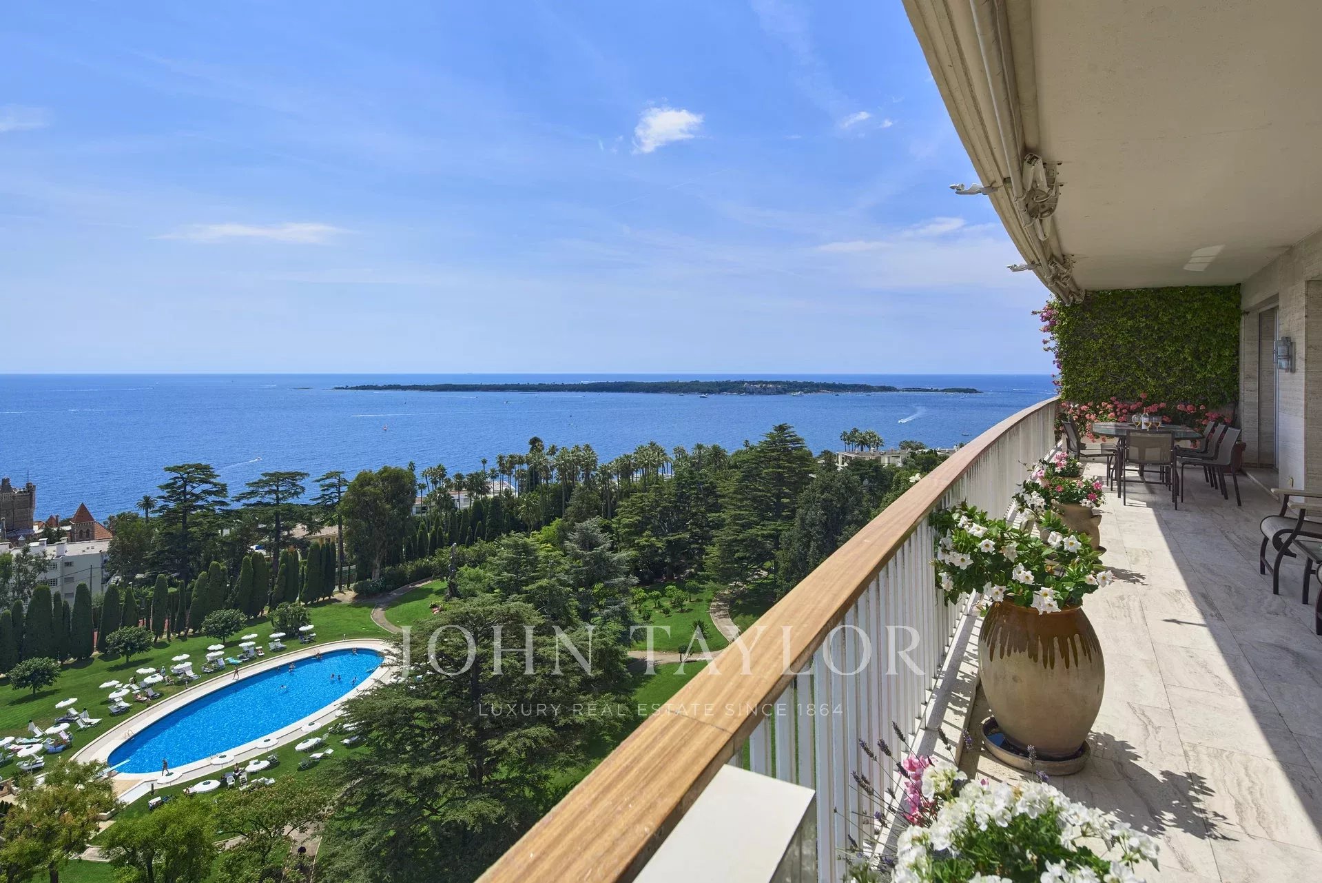 Nas alturas de Cannes, numa residência de luxo situada em 11 hectares de parque, este apartamento com ar condicionado oferece vistas soberbas para o mar, para as Ilhas Lérins e para o Cap d'Antibes.