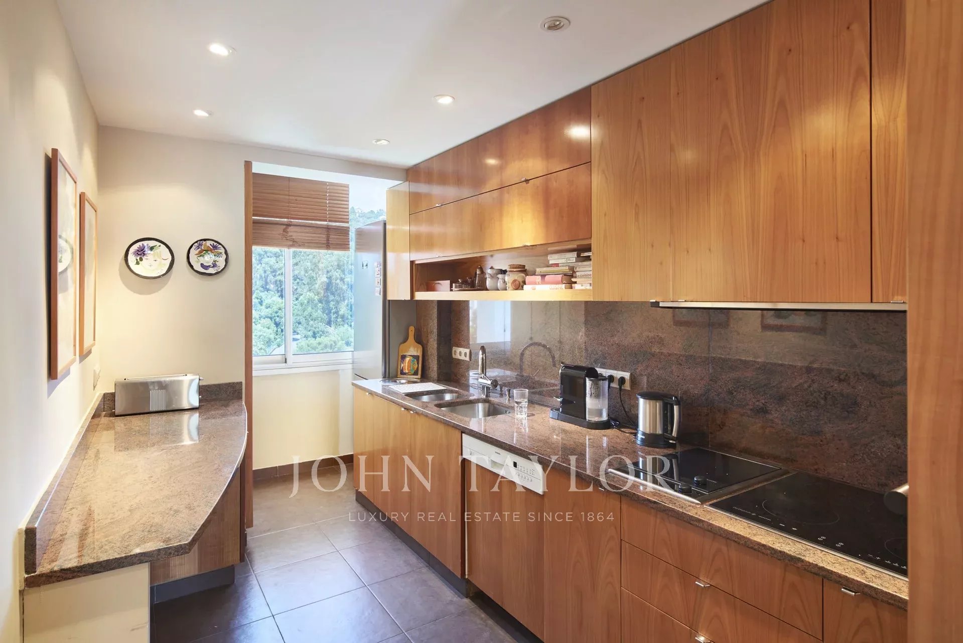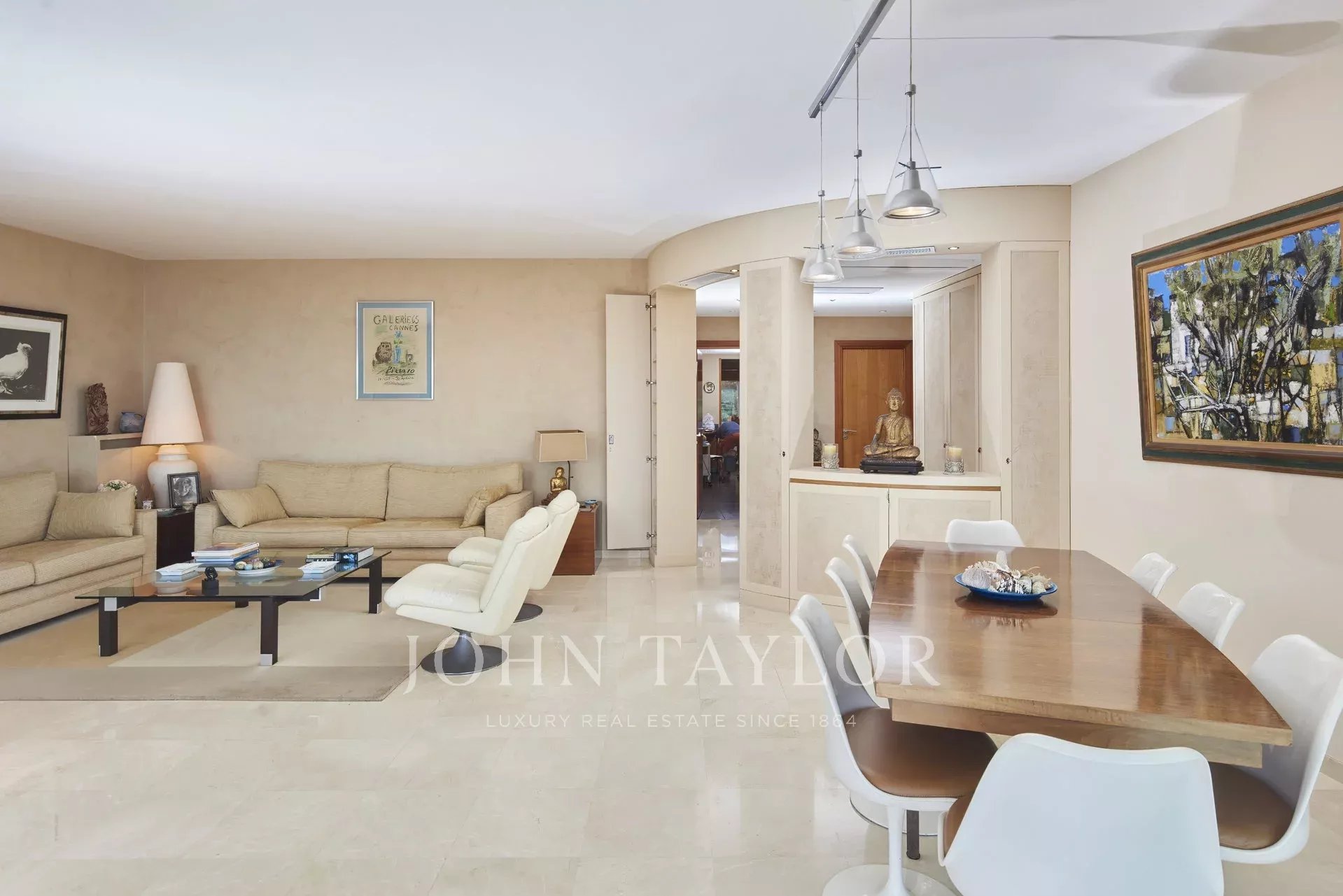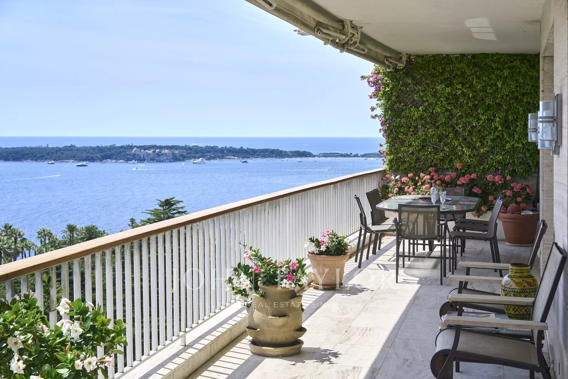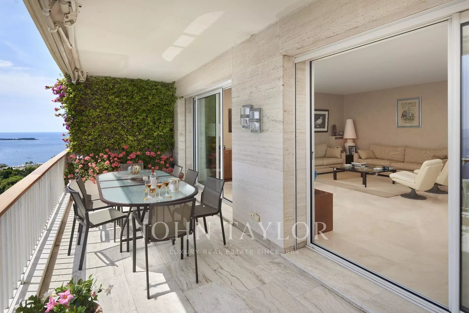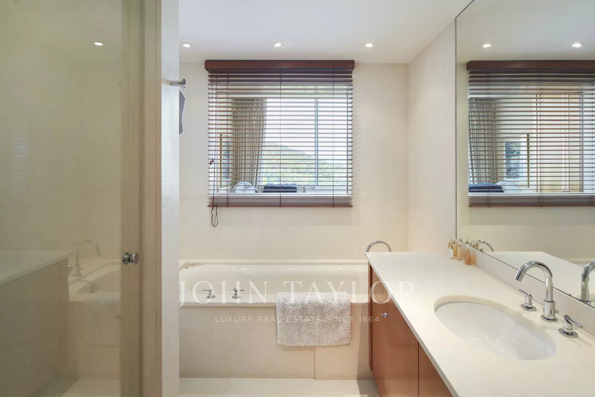 Nas alturas de Cannes, numa residência de luxo situada em 11 hectares de parque, este apartamento com ar condicionado oferece vistas soberbas para o mar, para as Ilhas Lérins e para o Cap d'Antibes.