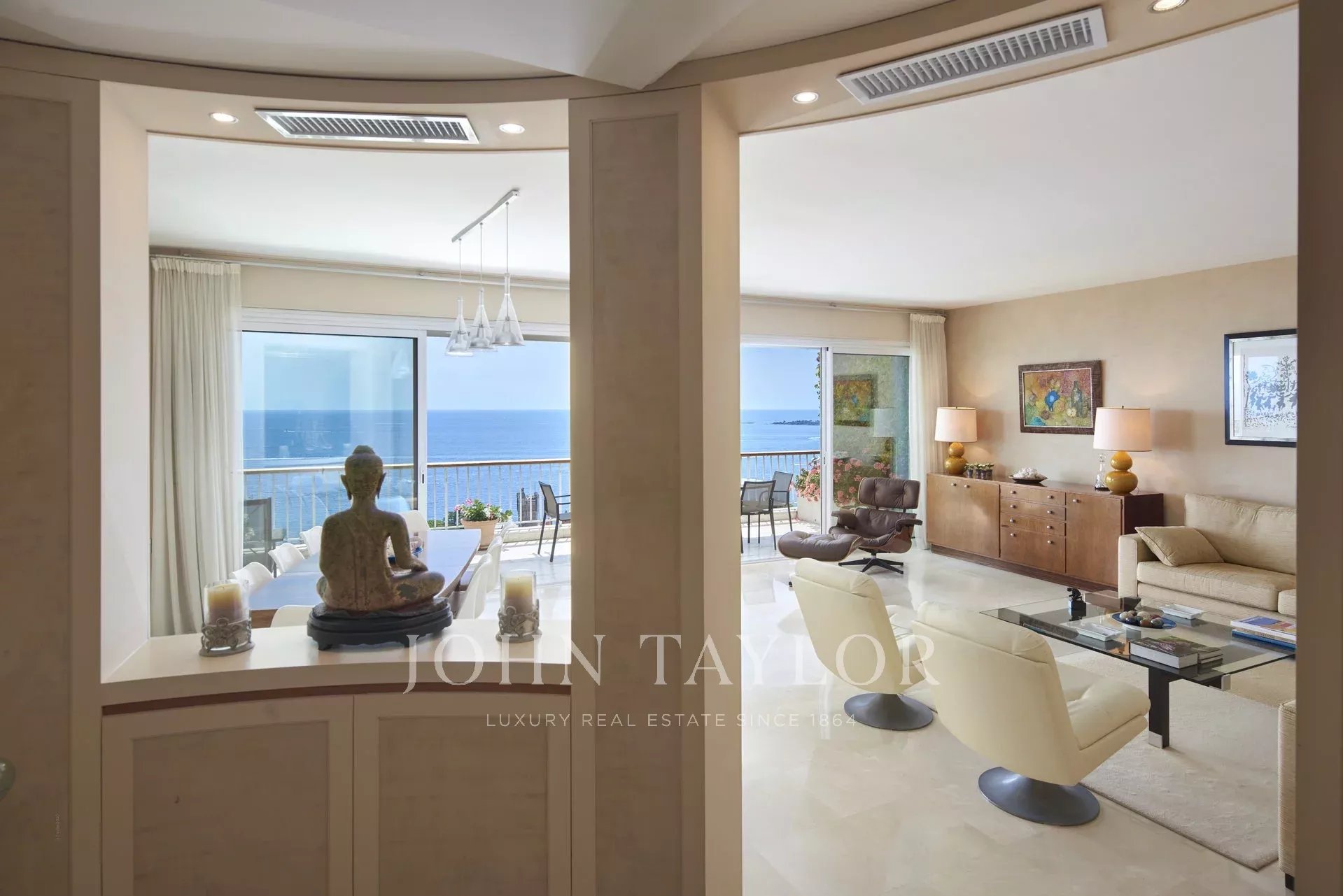 Entrada que abre para uma sala de estar/jantar dupla que abre para um terraço com vista para o mar