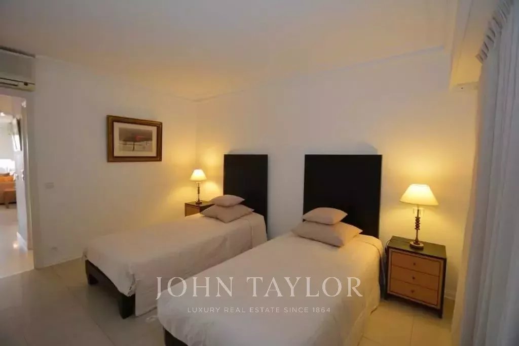 Quarto principal (2 camas individuais lado a lado) que se abre para o terraço virado para o Palais des Festivals