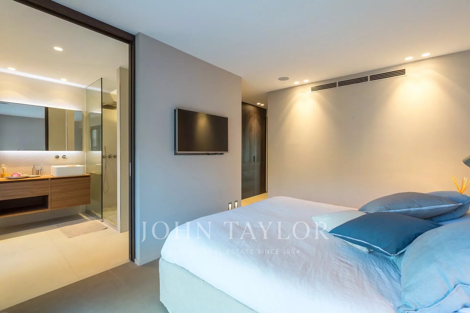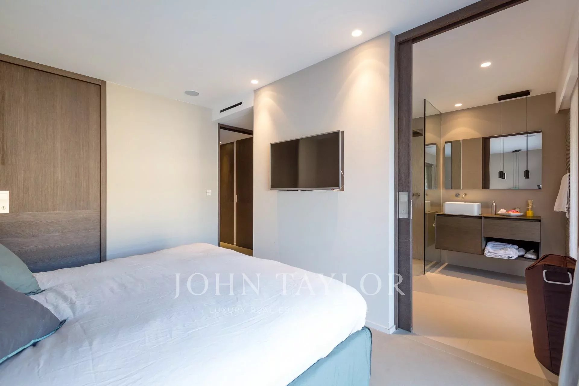 Virado a sul: quarto principal (cama king-size) que se abre para o terraço, vista mar, casa de banho completa, quarto de vestir e TV.