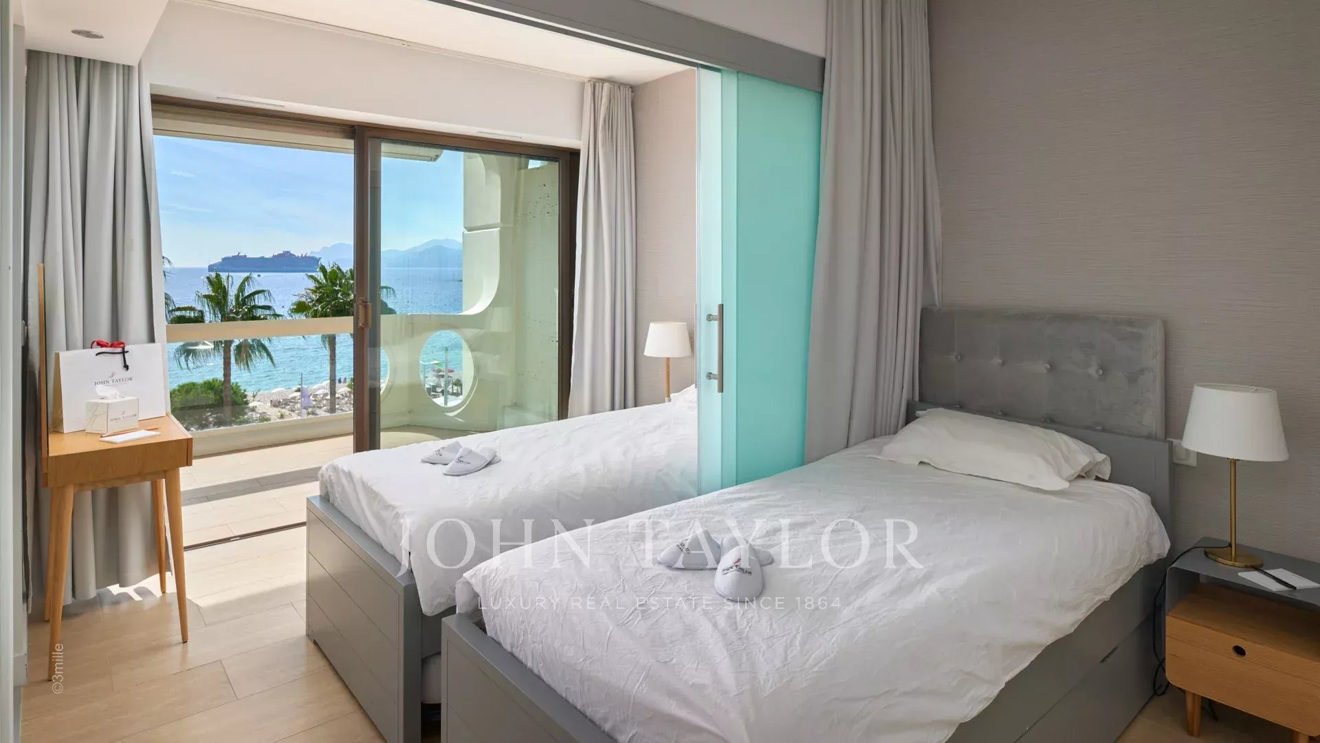 Quarto, duas camas individuais (podem ser separadas por uma divisória), vista para o mar. Casa de banho / WC