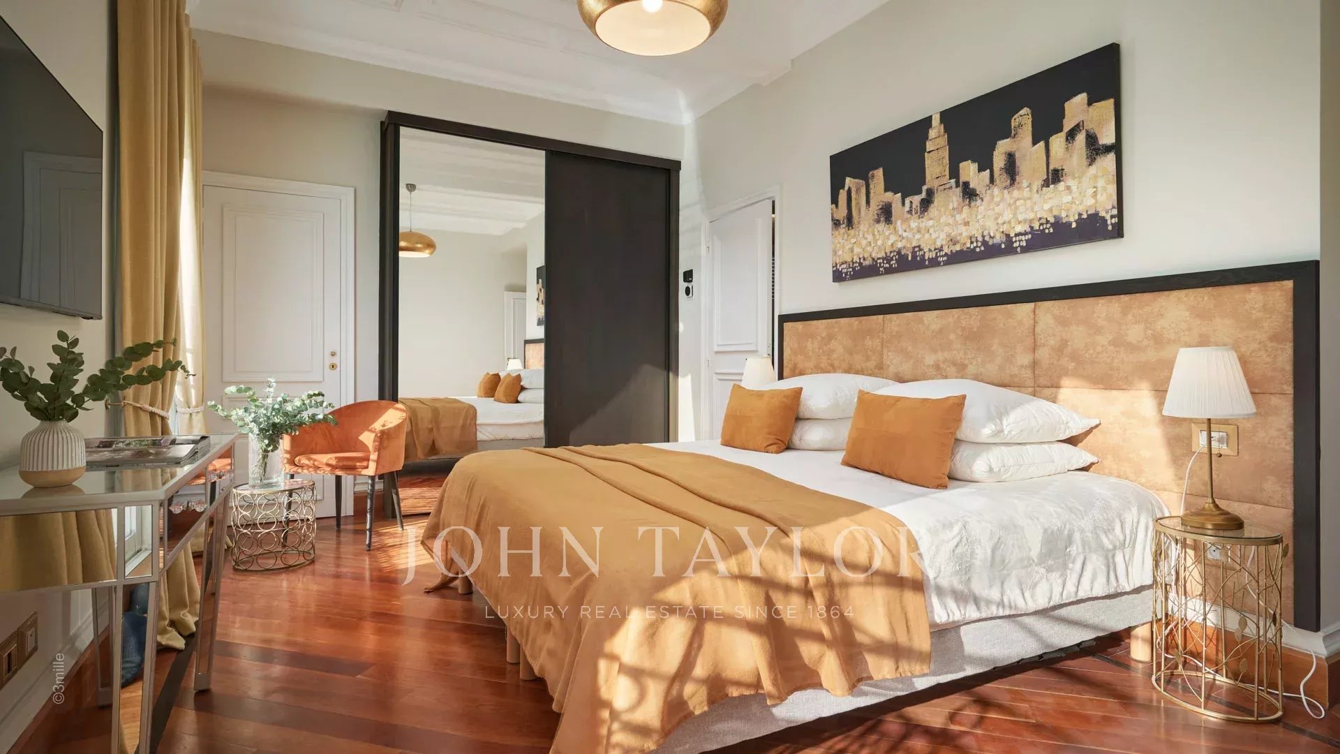 - Um quarto principal com uma cama king-size, com uma vista deslumbrante sobre o Palais des Festivals, e uma casa de banho privativa com WC.