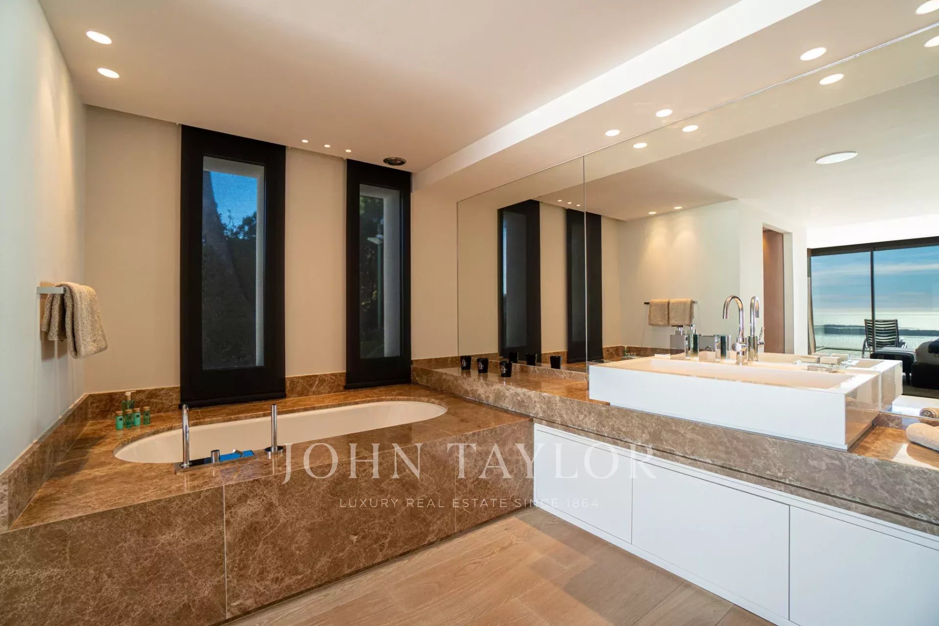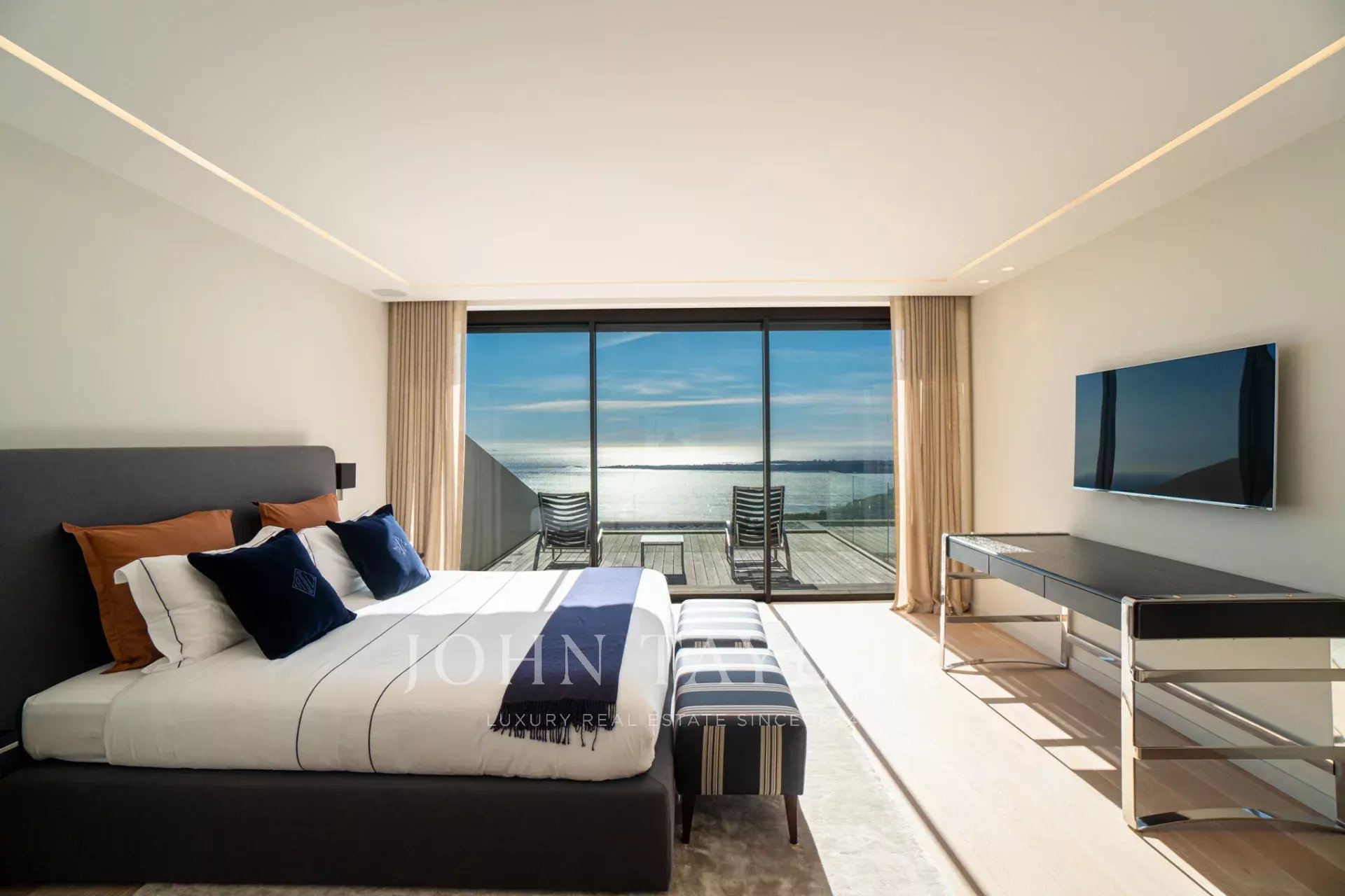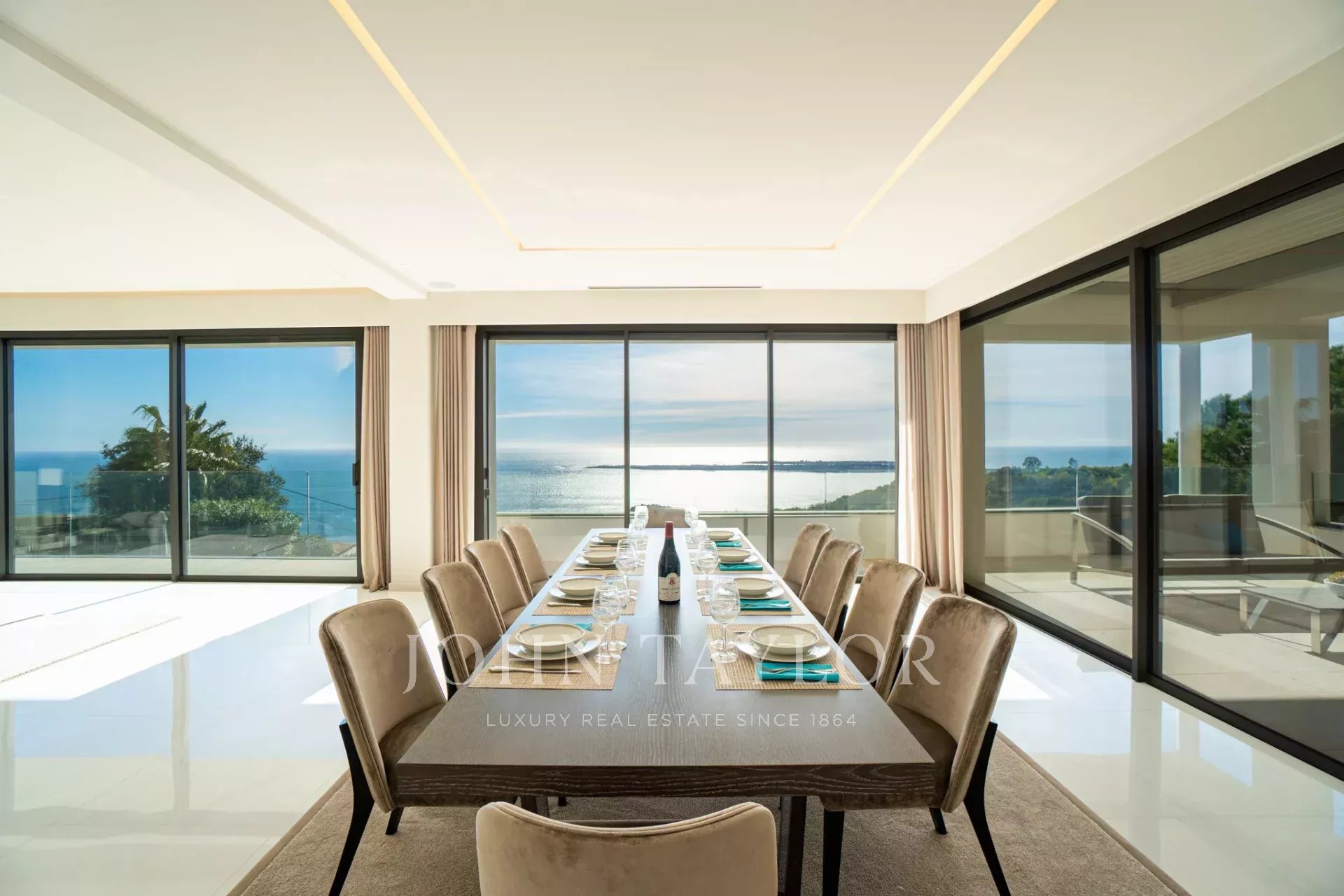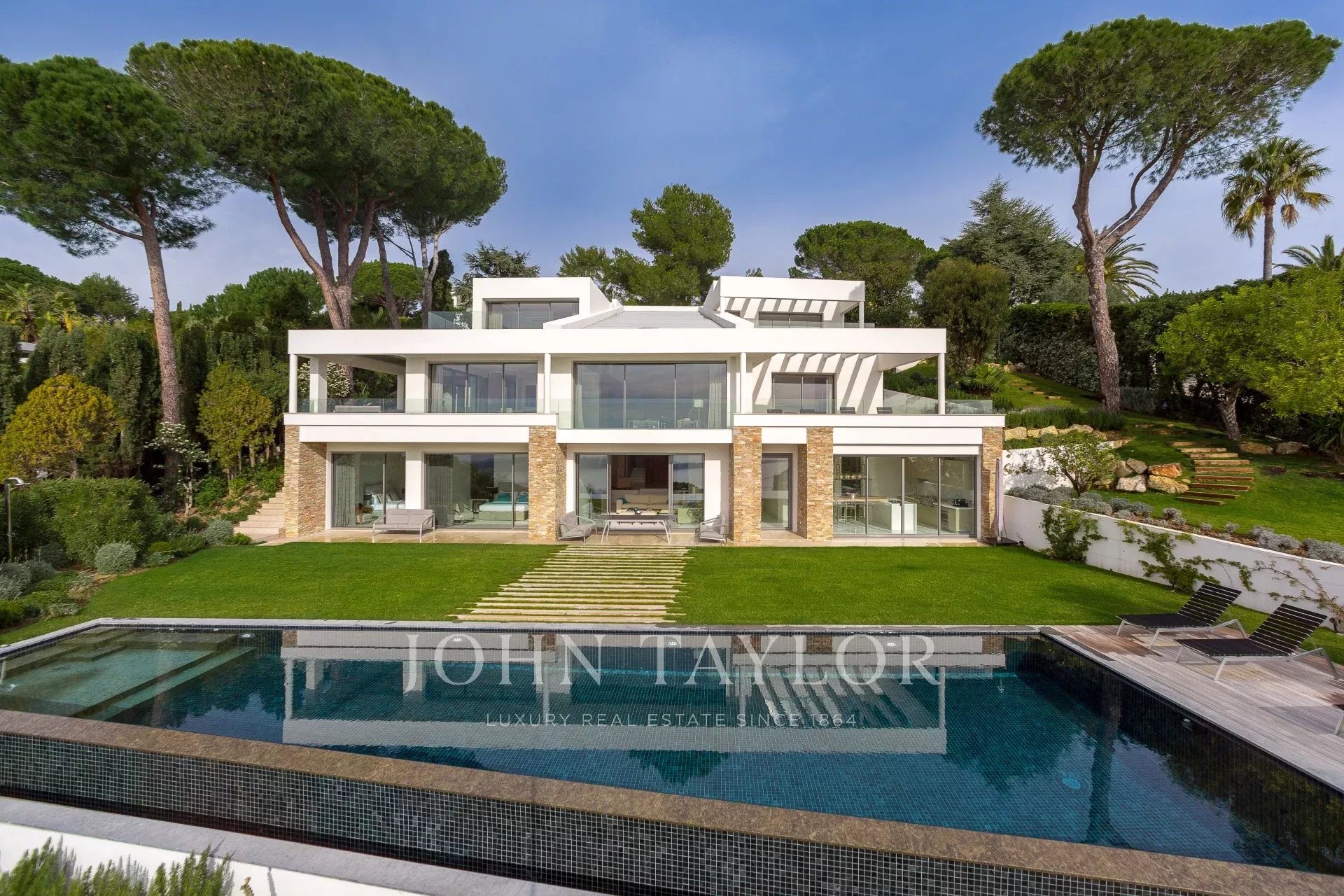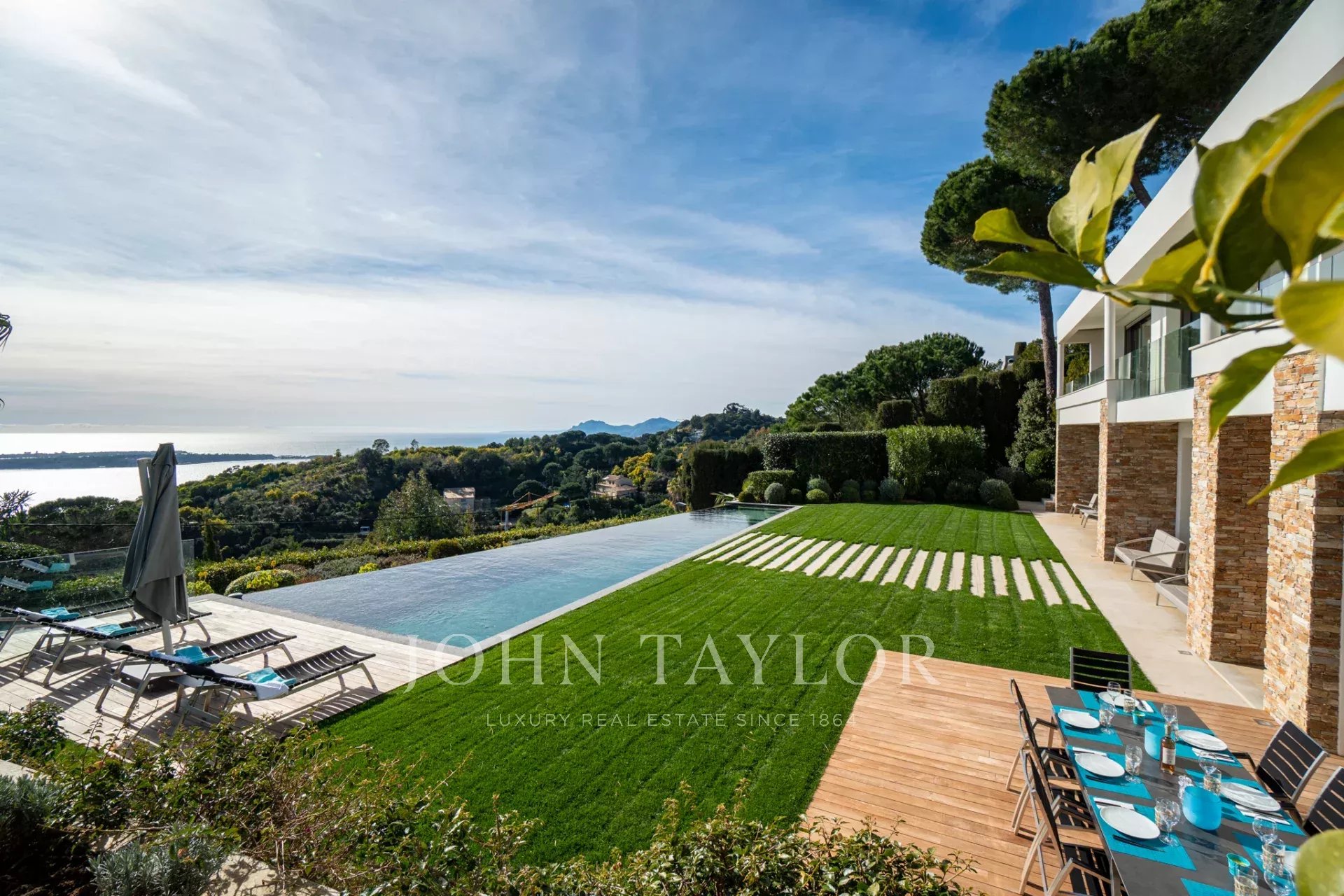 Nas alturas de Cannes, numa posição dominante com vista panorâmica para o mar, as ilhas Lérins, Cap d'Antibes e o maciço de Estérel, uma bela moradia nova de estilo contemporâneo com ar condicionado e caraterísticas de alta qualidade, oferecendo cerca de 630 m² de espaço habitacional num belo terreno de 2.000 m².