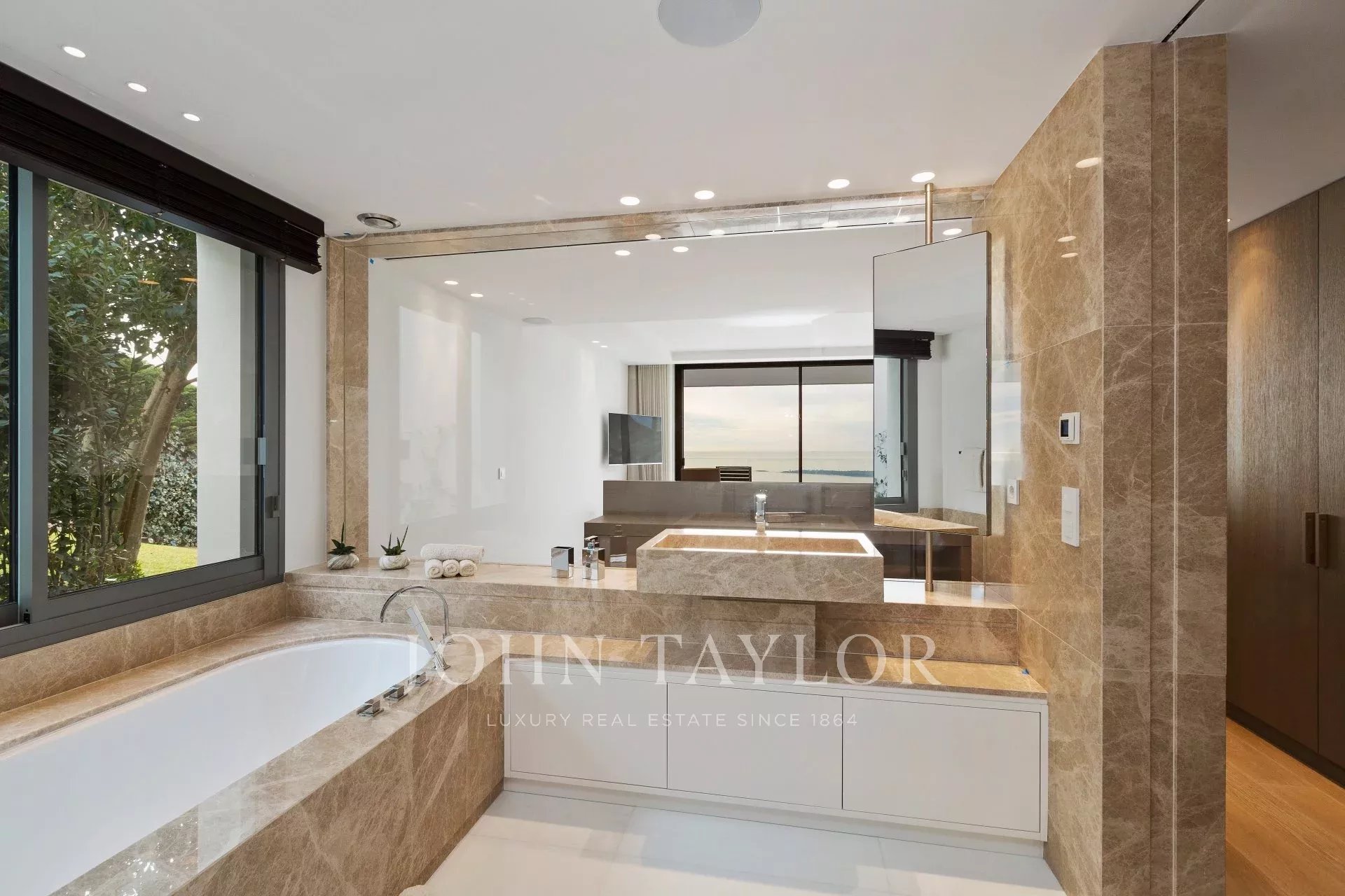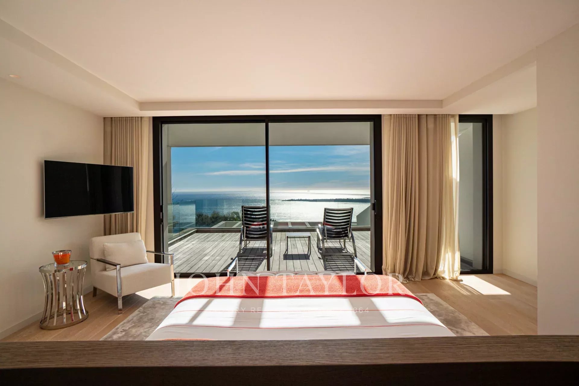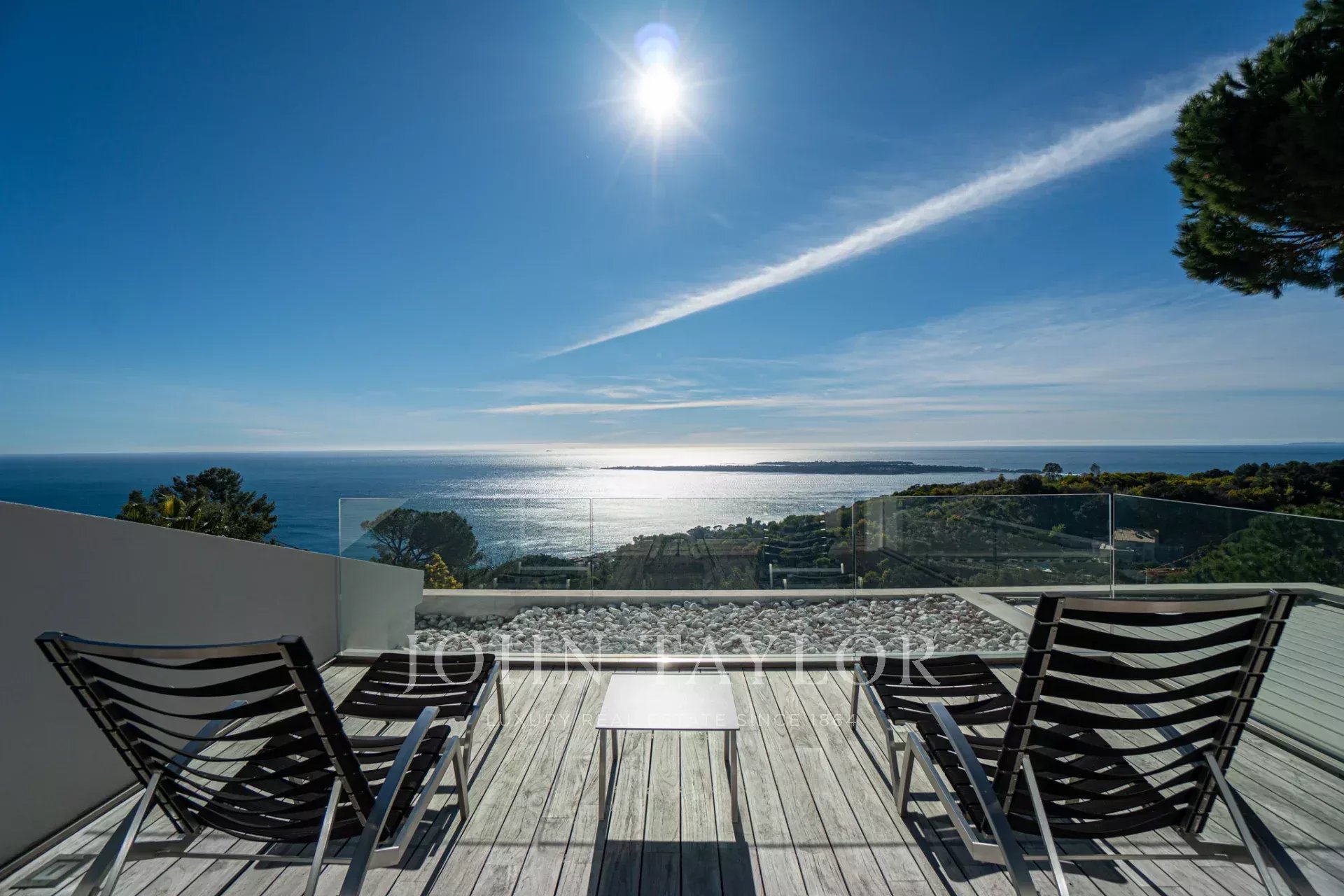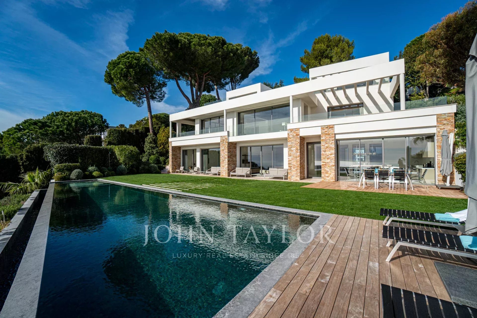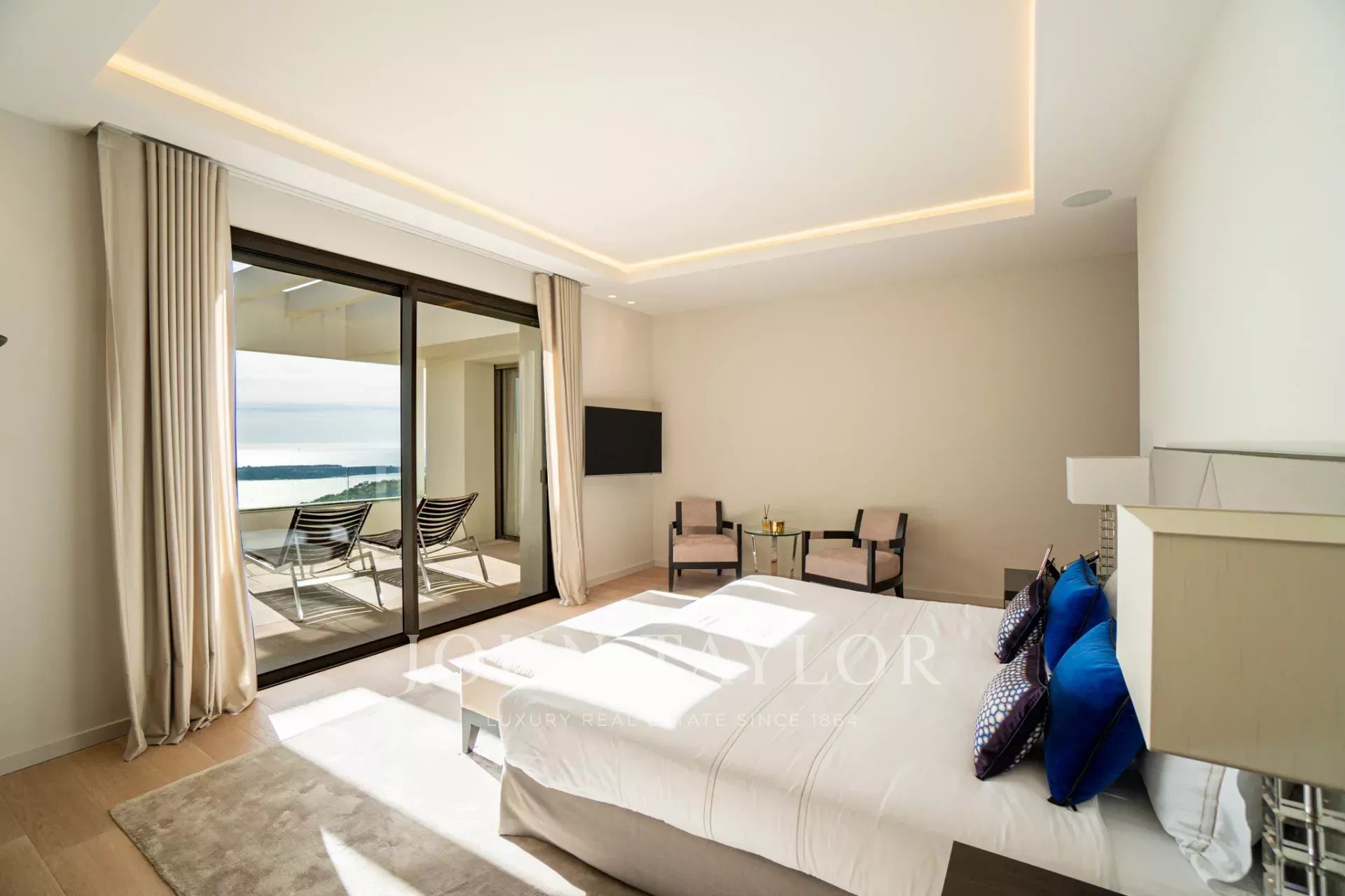 Nas alturas de Cannes, numa posição dominante com vista panorâmica para o mar, as ilhas Lérins, Cap d'Antibes e o maciço de Estérel, uma bela moradia nova de estilo contemporâneo com ar condicionado e caraterísticas de alta qualidade, oferecendo cerca de 630 m² de espaço habitacional num belo terreno de 2.000 m².
