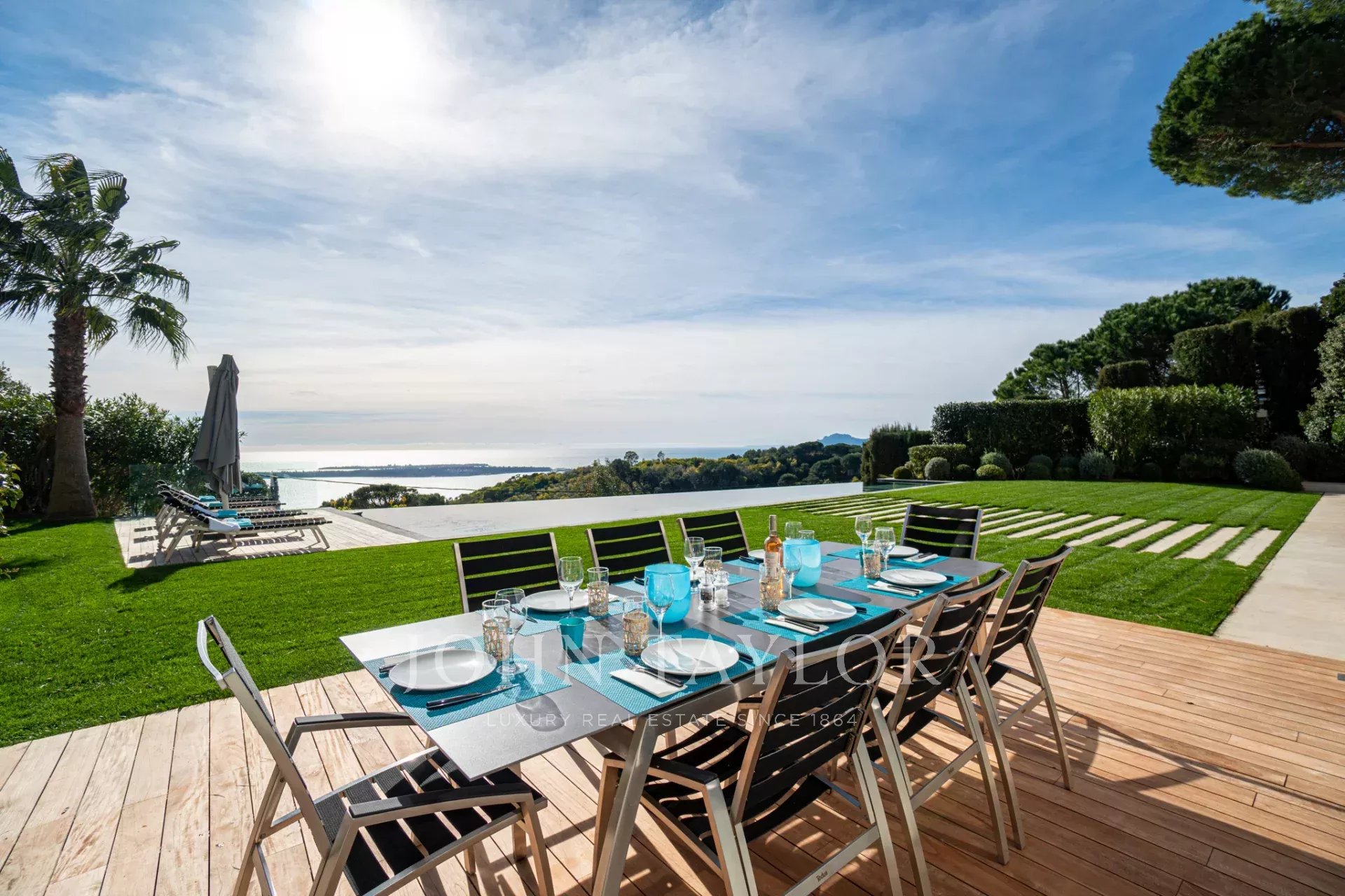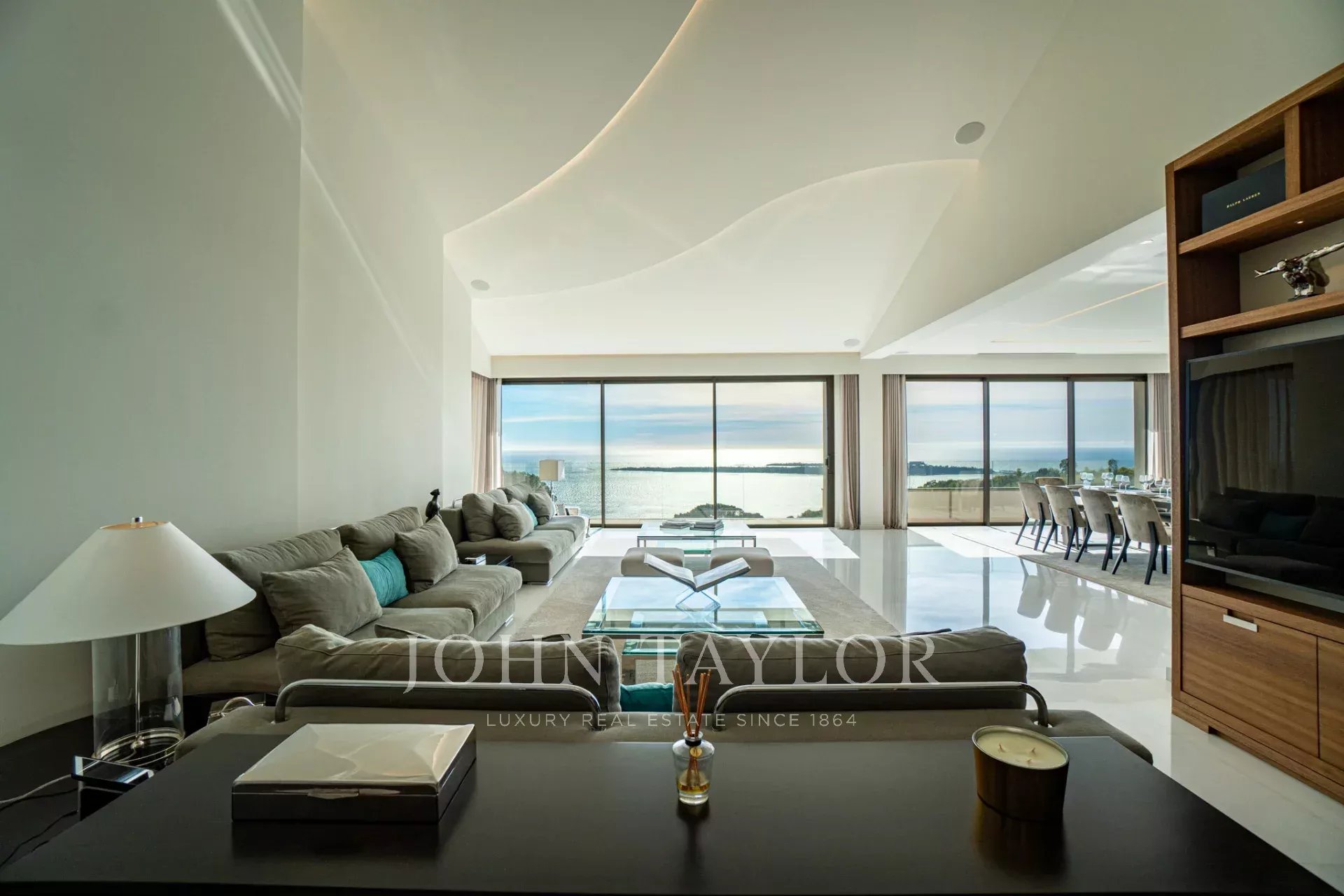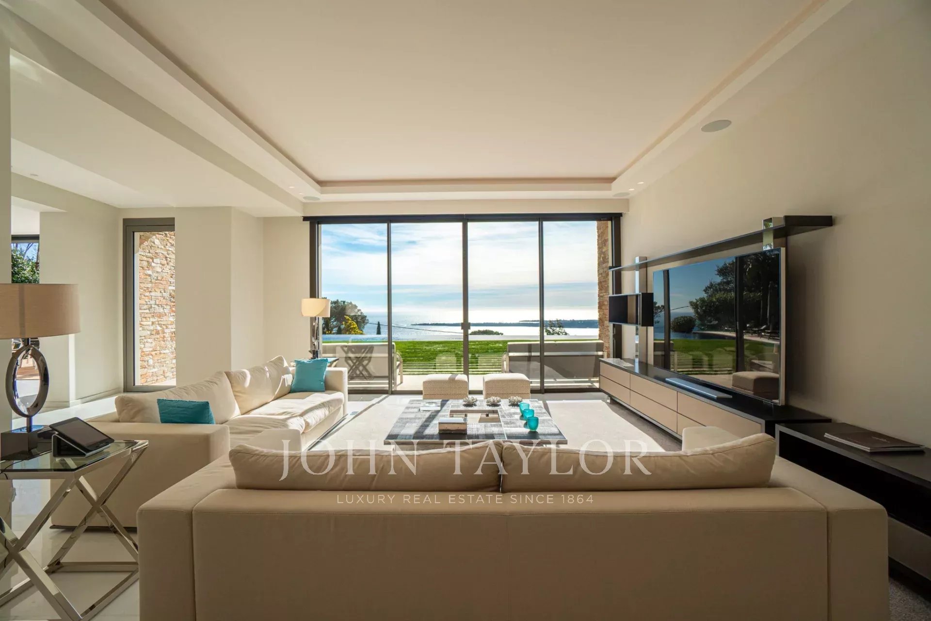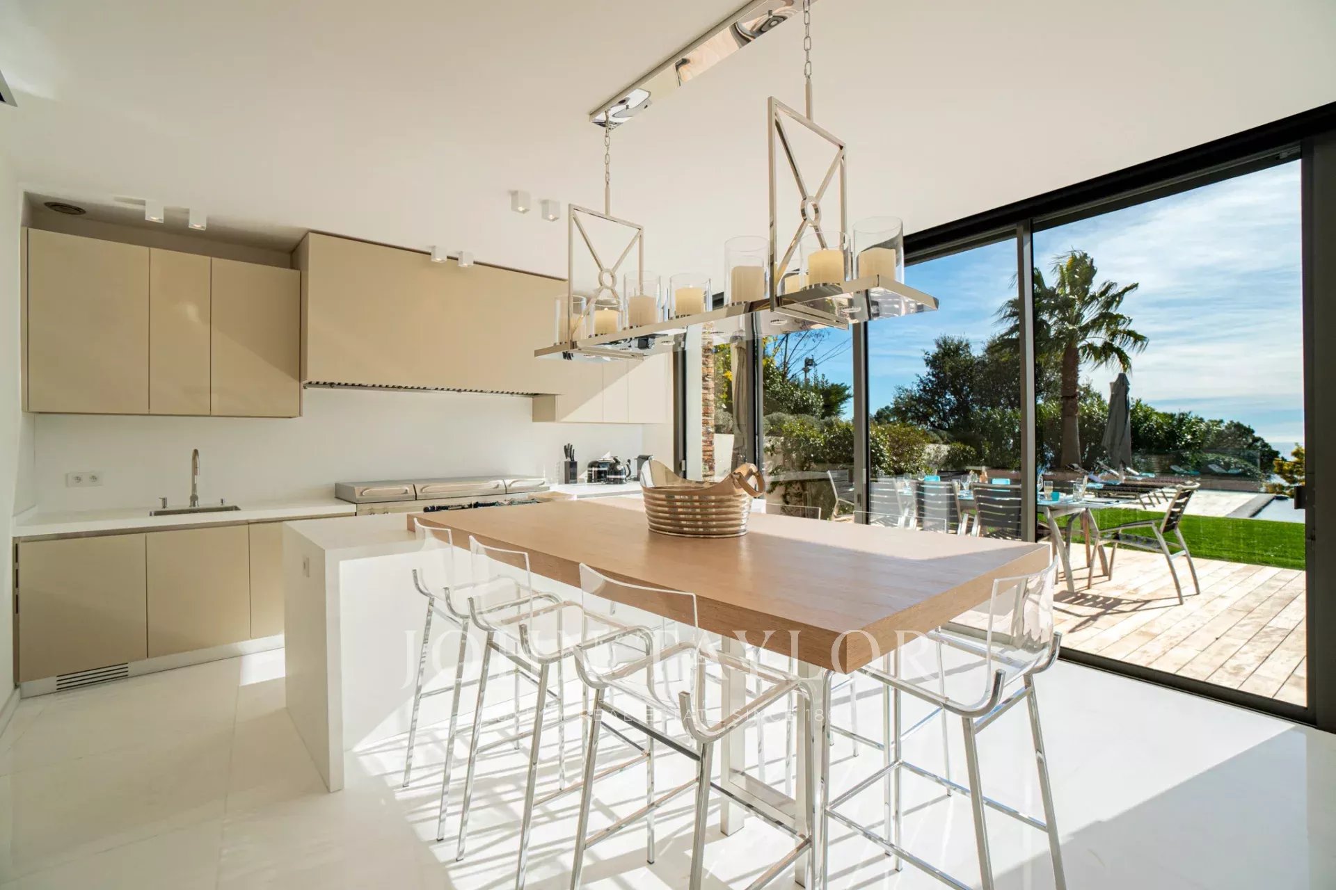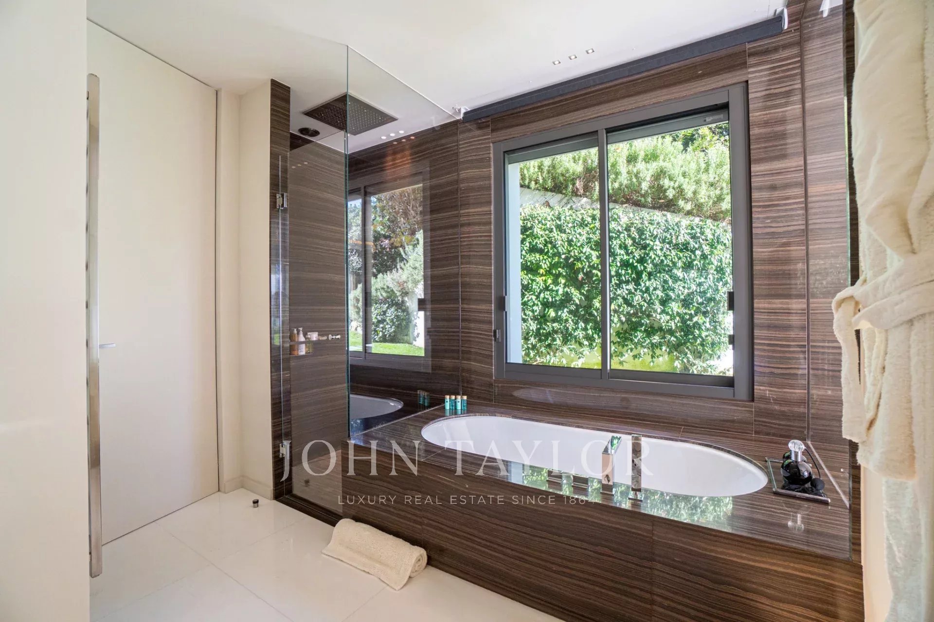 Nas alturas de Cannes, numa posição dominante com vista panorâmica para o mar, as ilhas Lérins, Cap d'Antibes e o maciço de Estérel, uma bela moradia nova de estilo contemporâneo com ar condicionado e caraterísticas de alta qualidade, oferecendo cerca de 630 m² de espaço habitacional num belo terreno de 2.000 m².
