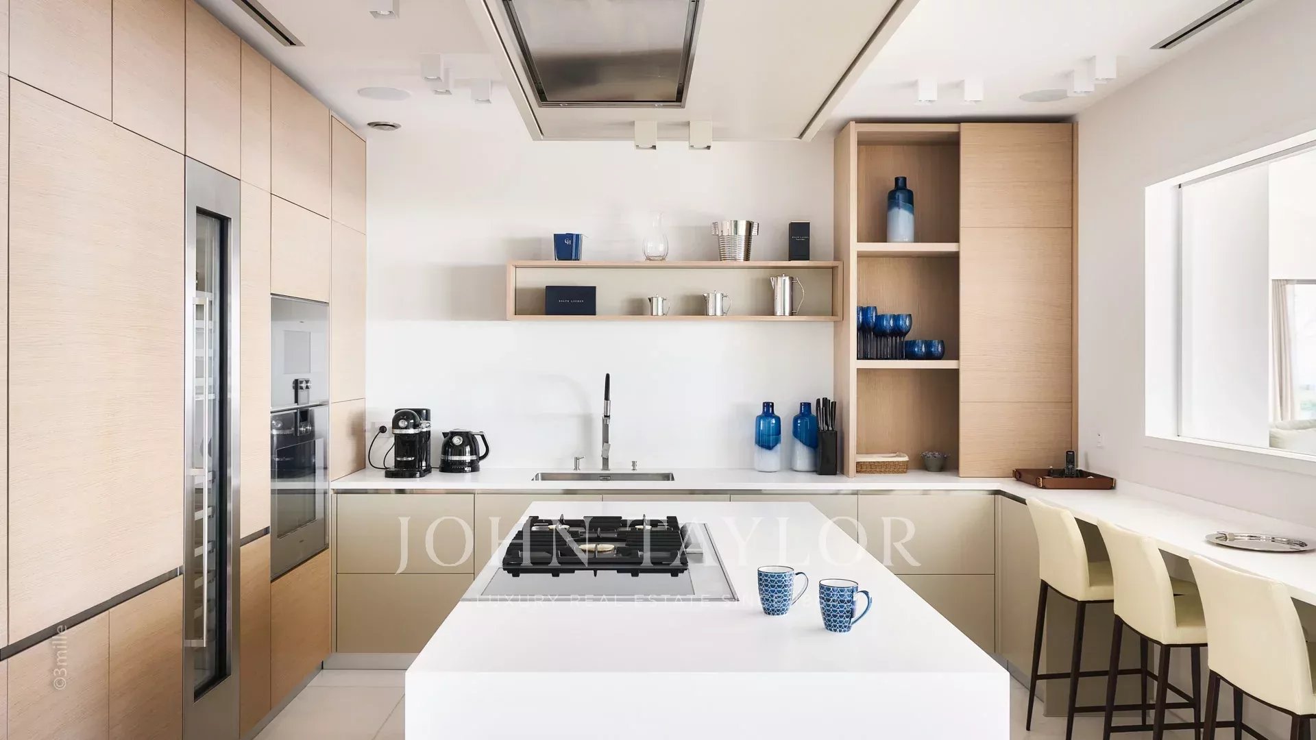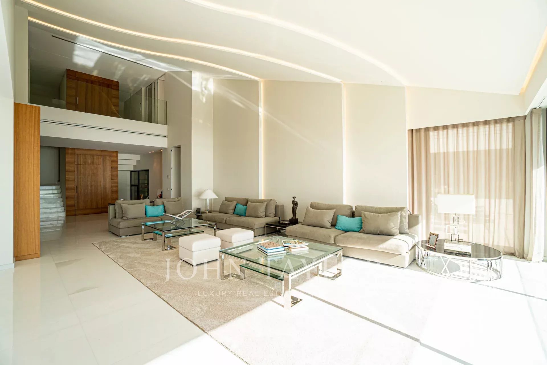 Grande e atraente sala de receção com cozinha equipada, sala de jantar e grande sala de estar que se abre para grandes terraços com vista para o mar