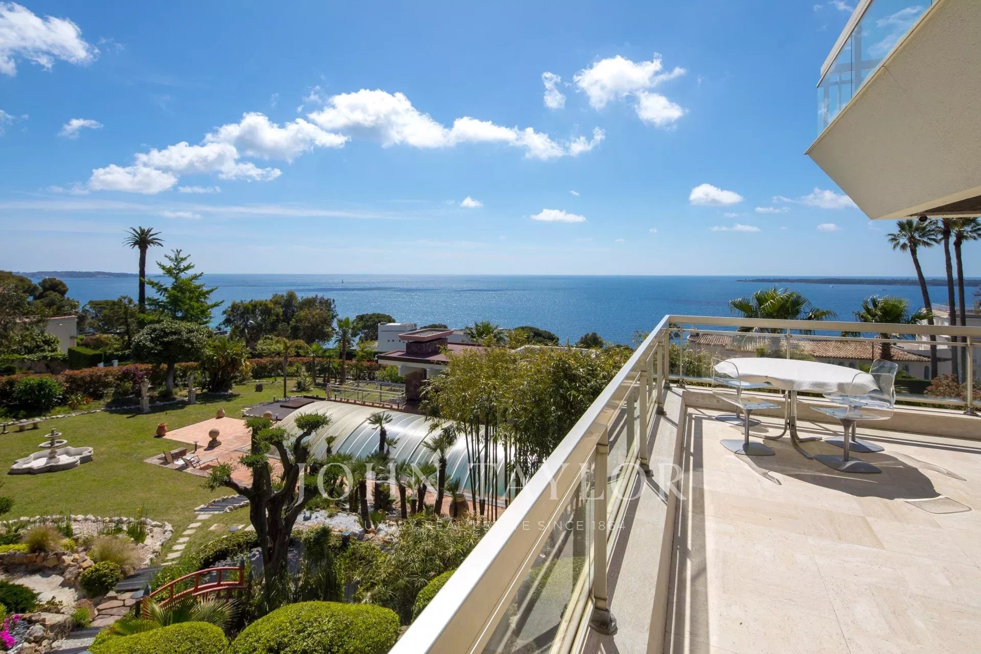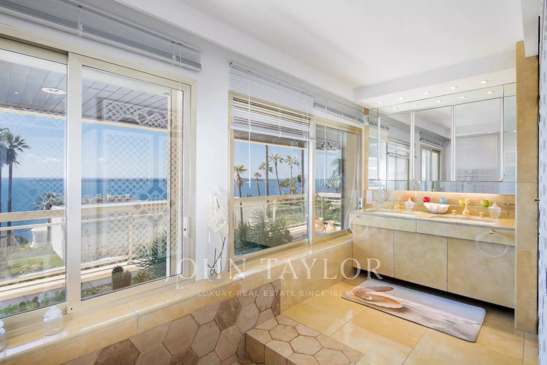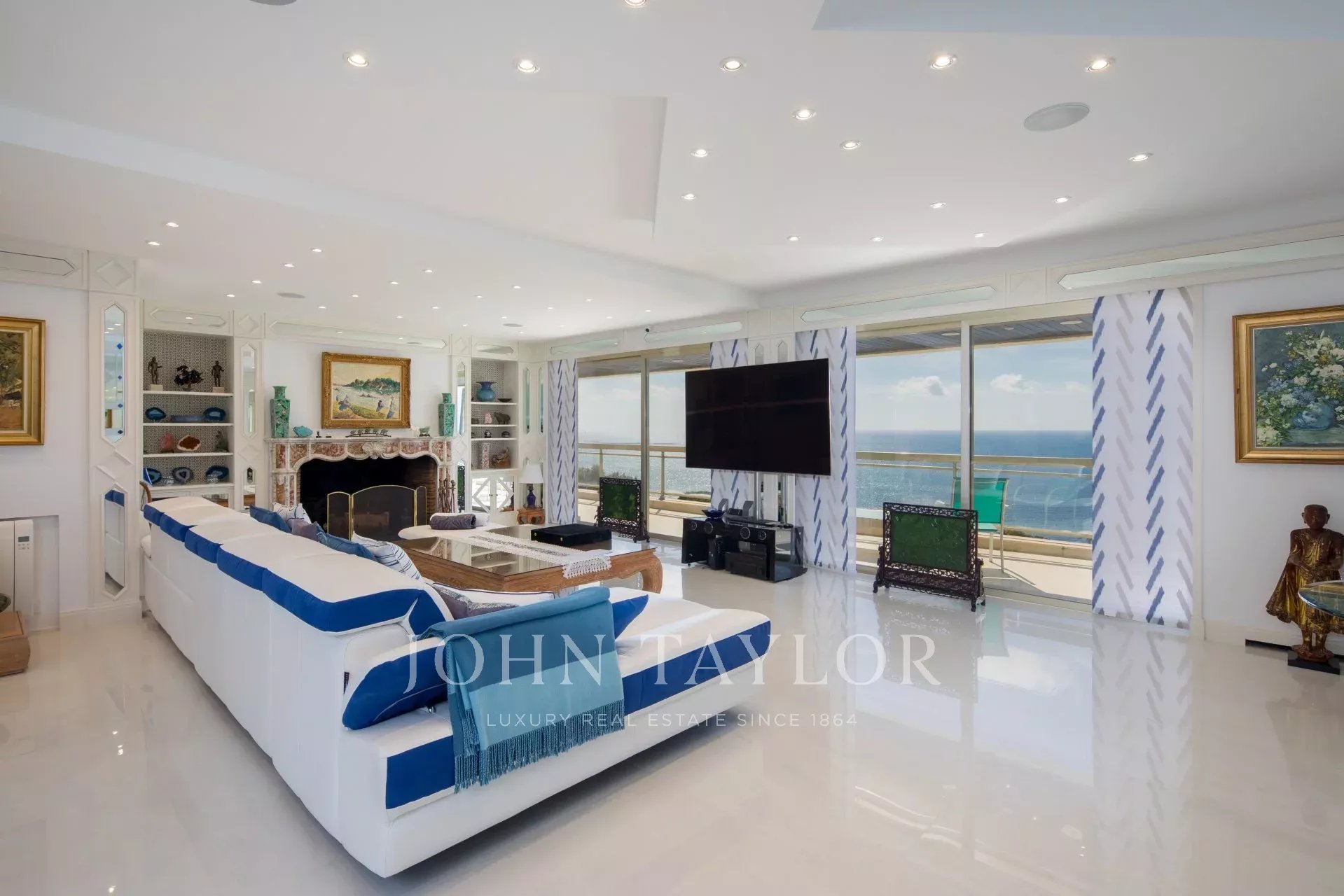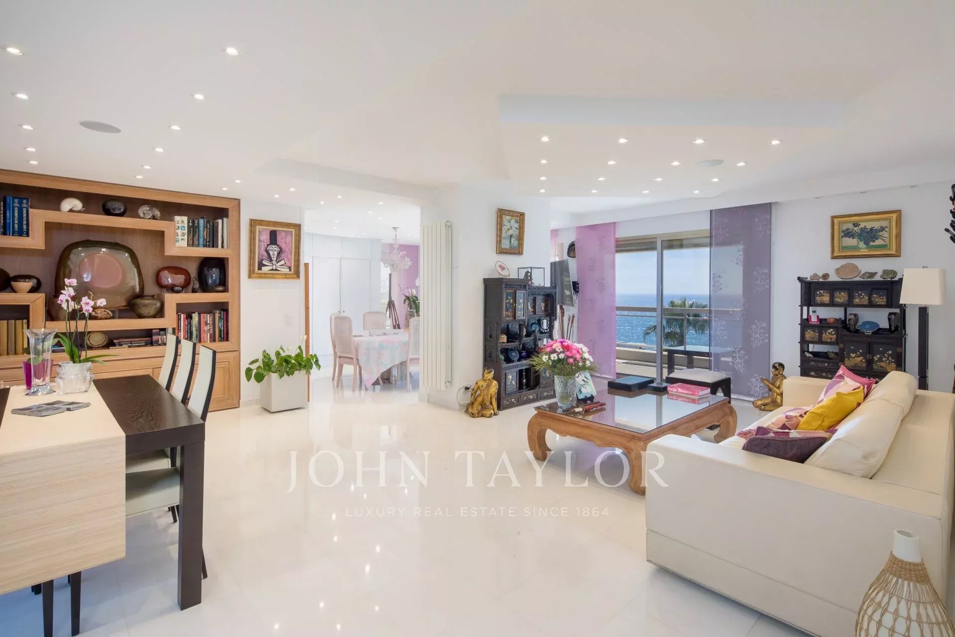 Hall de entrada que conduz a uma sala de estar/jantar dupla que se abre para um terraço com vista para a Baía de Cannes e as Ilhas de Lérins.