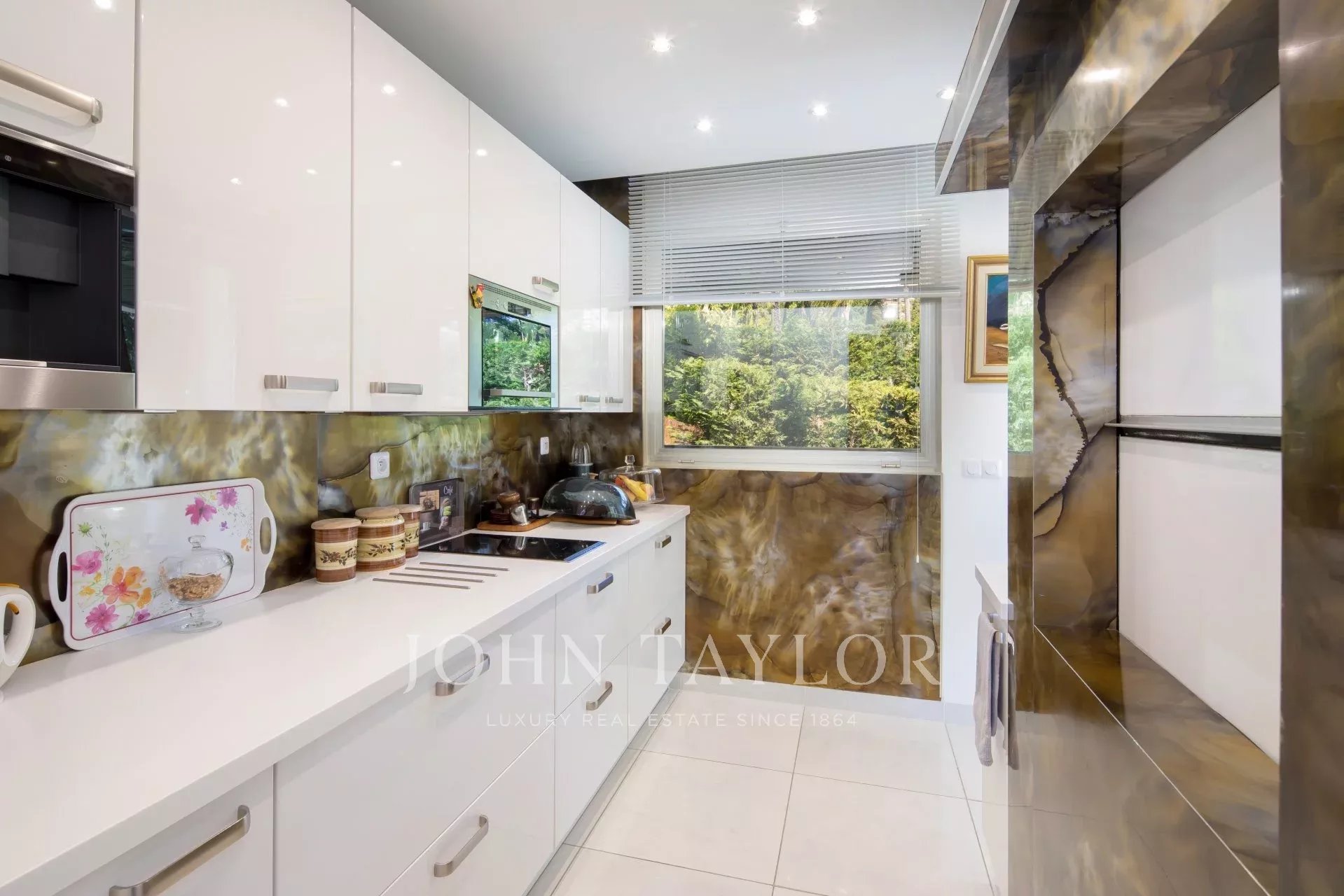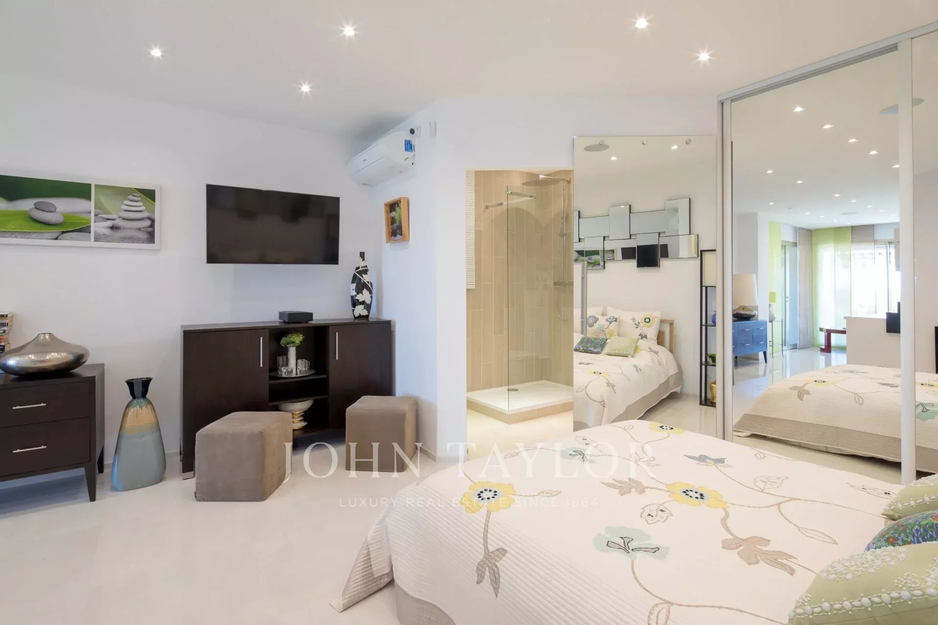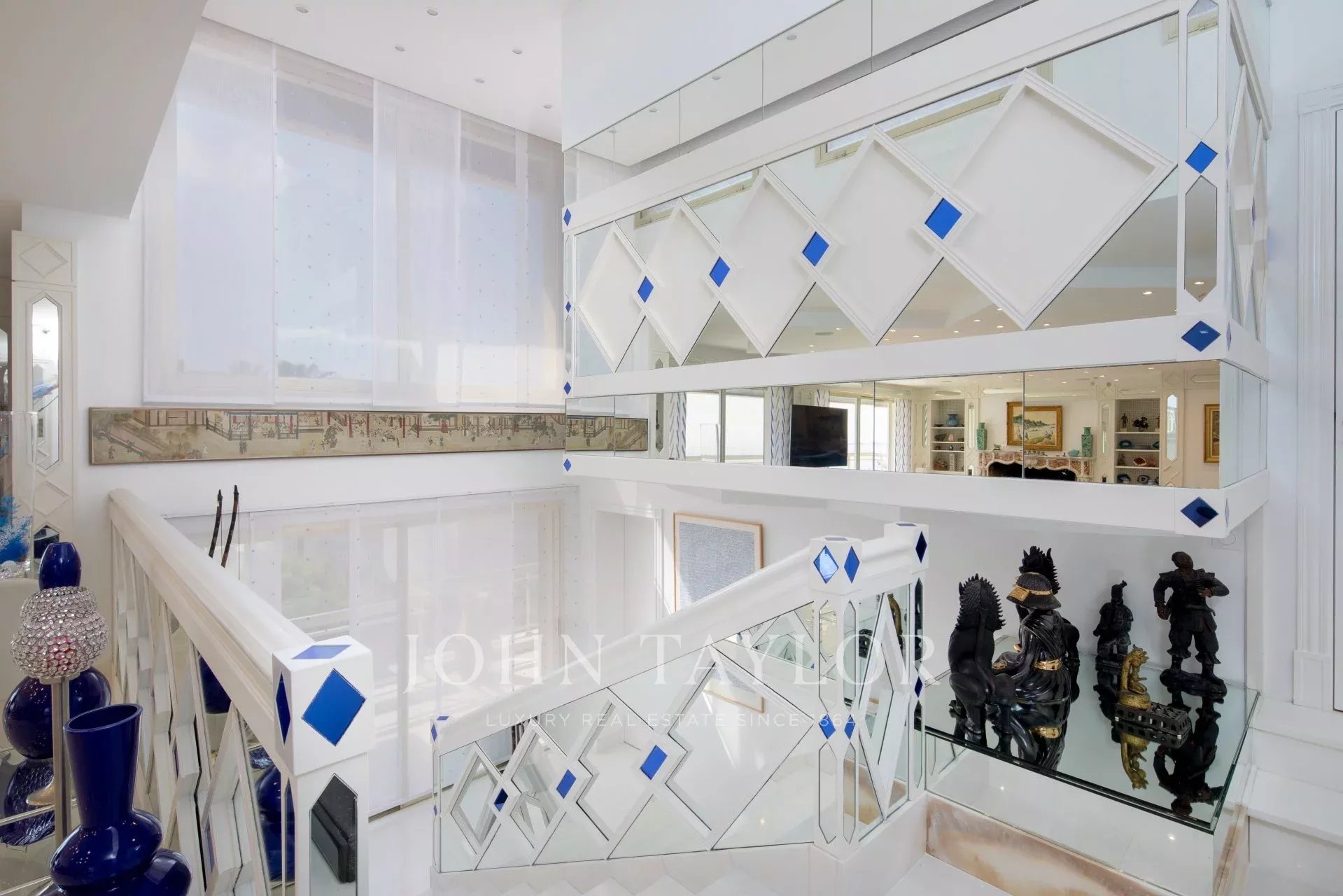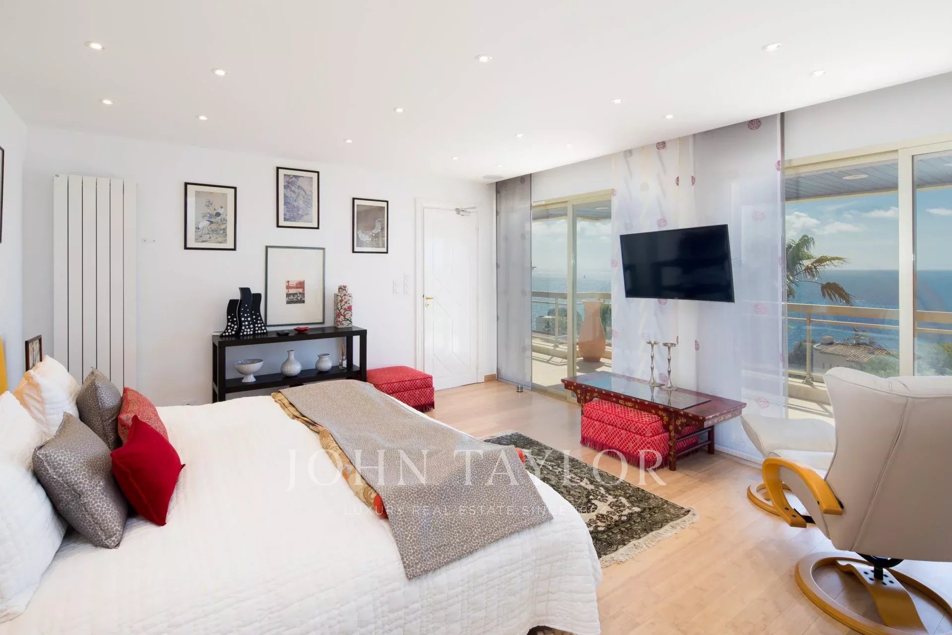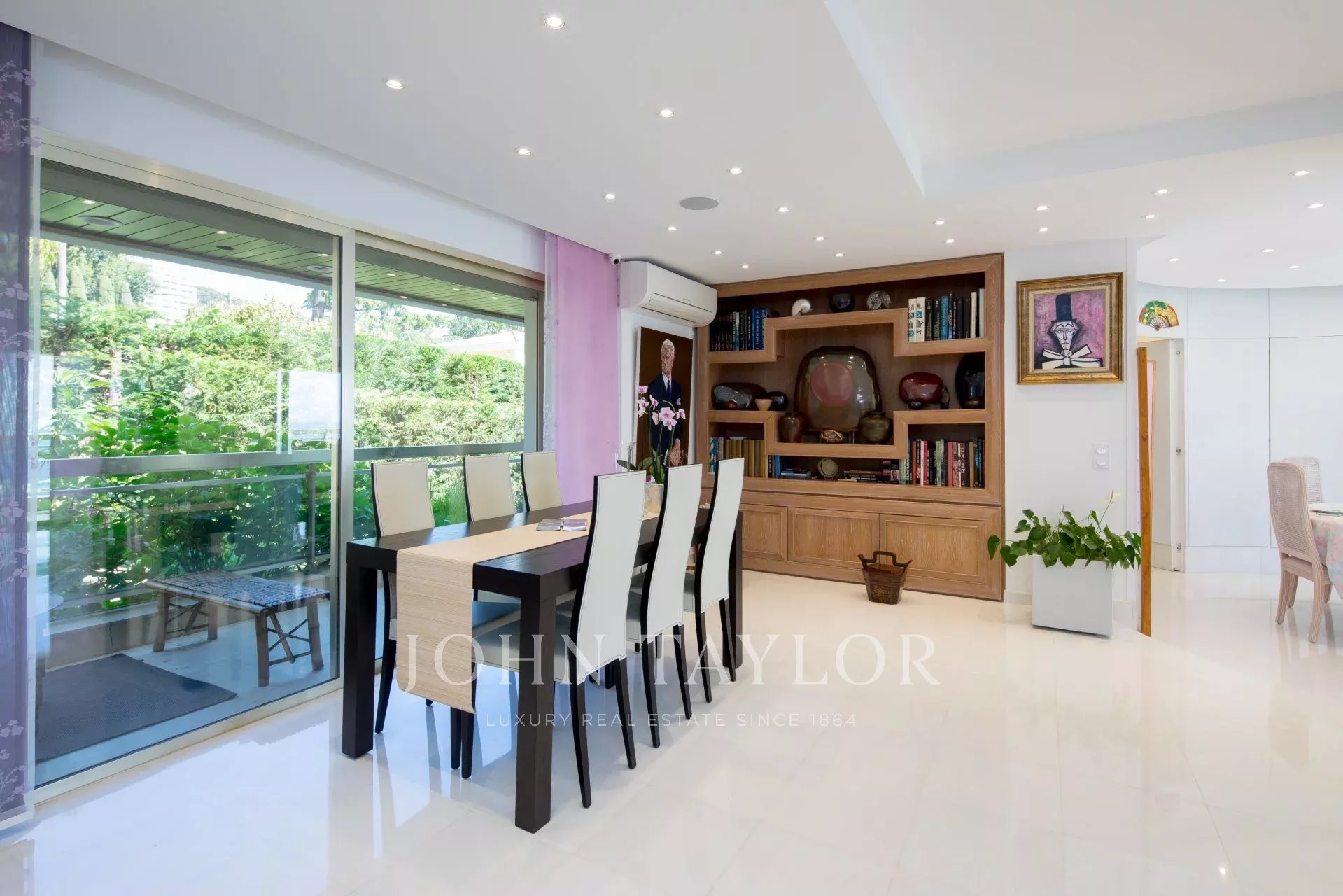 Hall de entrada que conduz a uma sala de estar/jantar dupla que se abre para um terraço com vista para a Baía de Cannes e as Ilhas de Lérins.