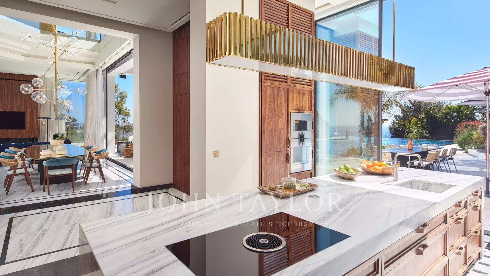 As áreas exteriores são igualmente sumptuosas, com um terraço no piso térreo com um deck junto à piscina com vista panorâmica para o mar, braseiro, churrasqueira e zona de refeições, com vista para a piscina aquecida e duas cascatas. Os pisos superiores oferecem terraços panorâmicos equipados com espreguiçadeiras e um braseiro, enquanto o jardim mediterrânico em socalcos inclui um campo de petanca e uma horta.