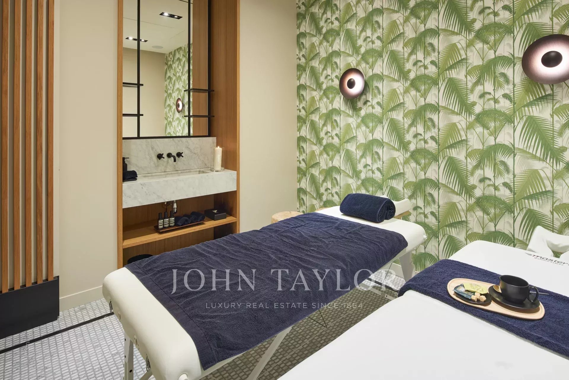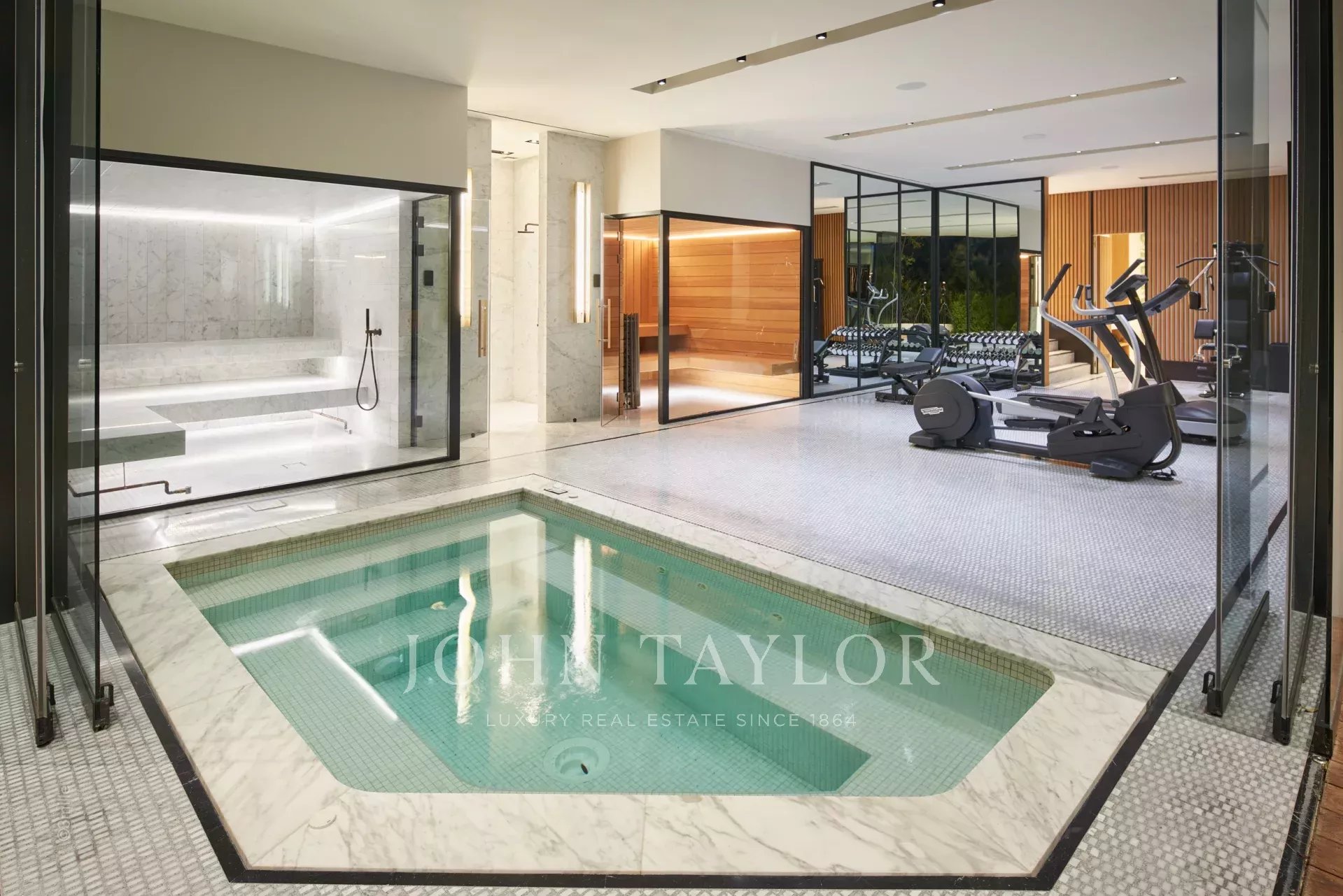 - O piso do jardim inclui dois quartos em suite, dois quartos que partilham uma casa de banho, uma sala de cinema e um spa completo com banho turco, sauna, sala de massagens e jacuzzi, bem como uma sala de fitness para os entusiastas do bem-estar.