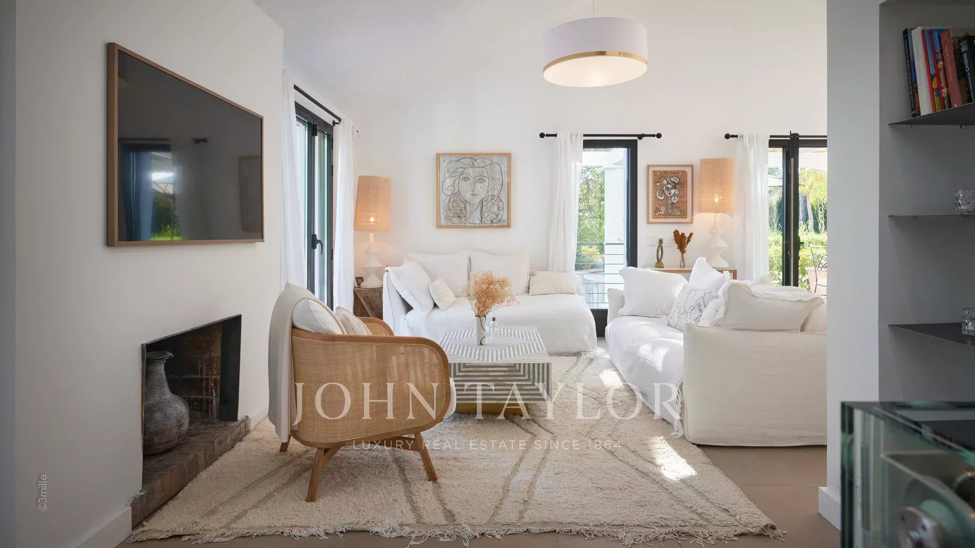 Sala de receção composta por sala de estar com cozinha equipada em plano aberto, televisão, lareira, sala de jantar, tudo com acesso a um terraço e ao jardim