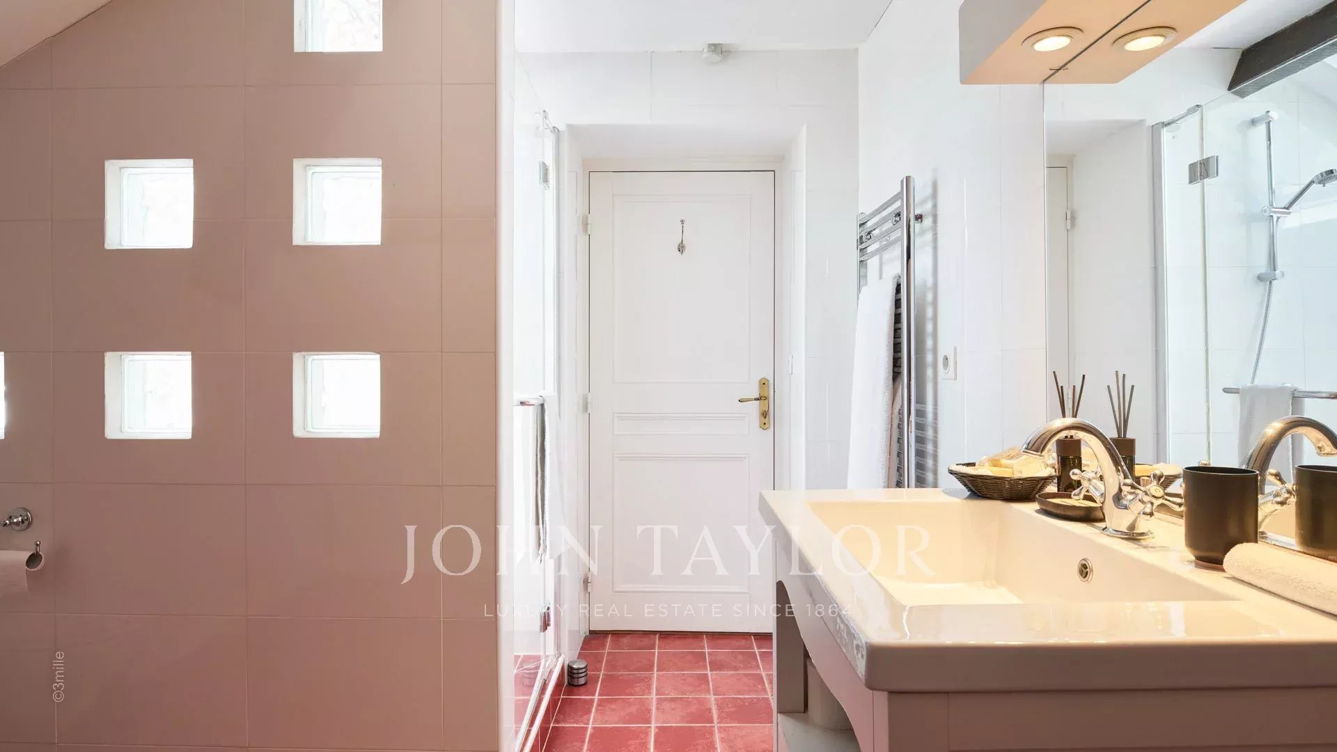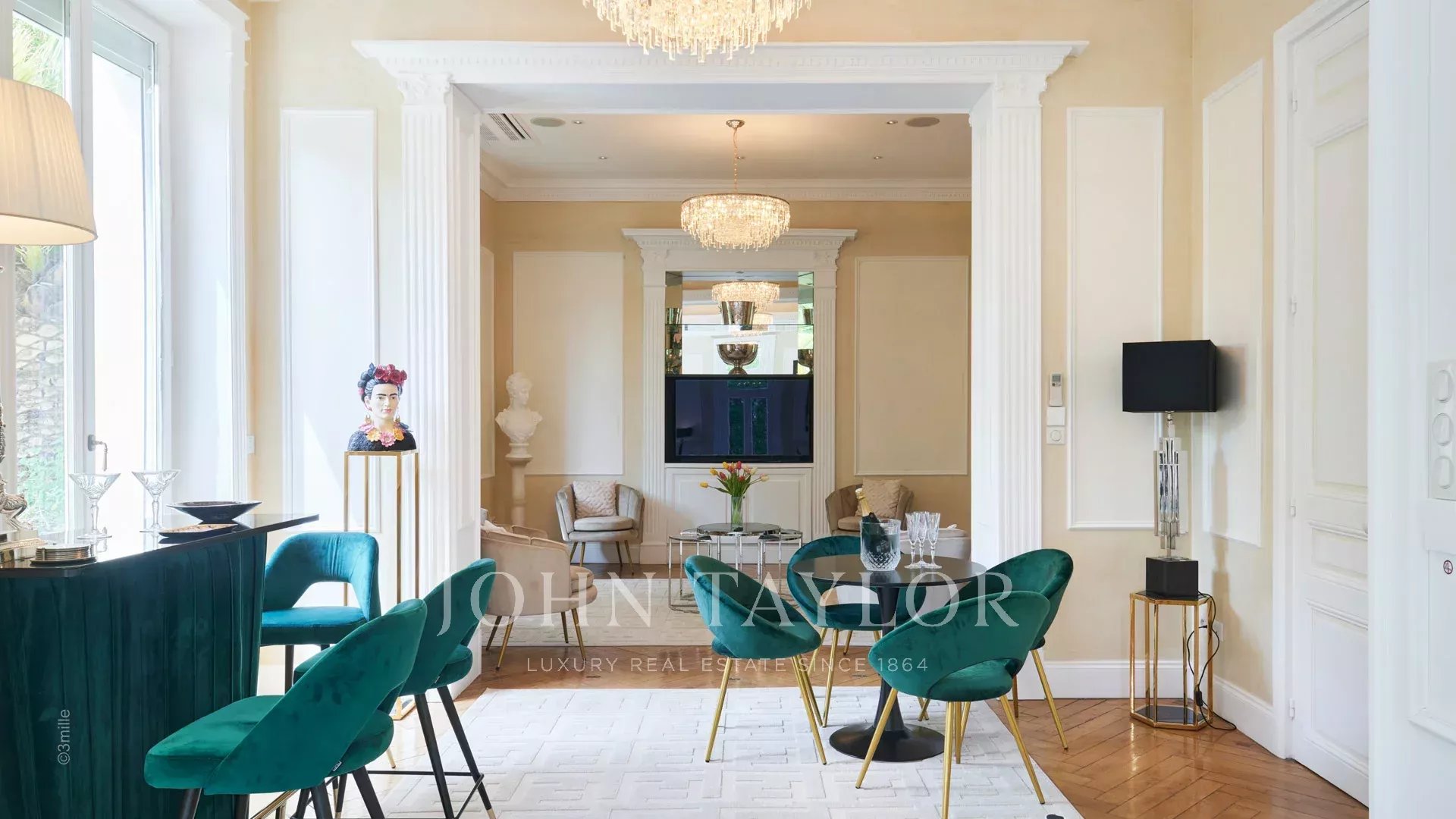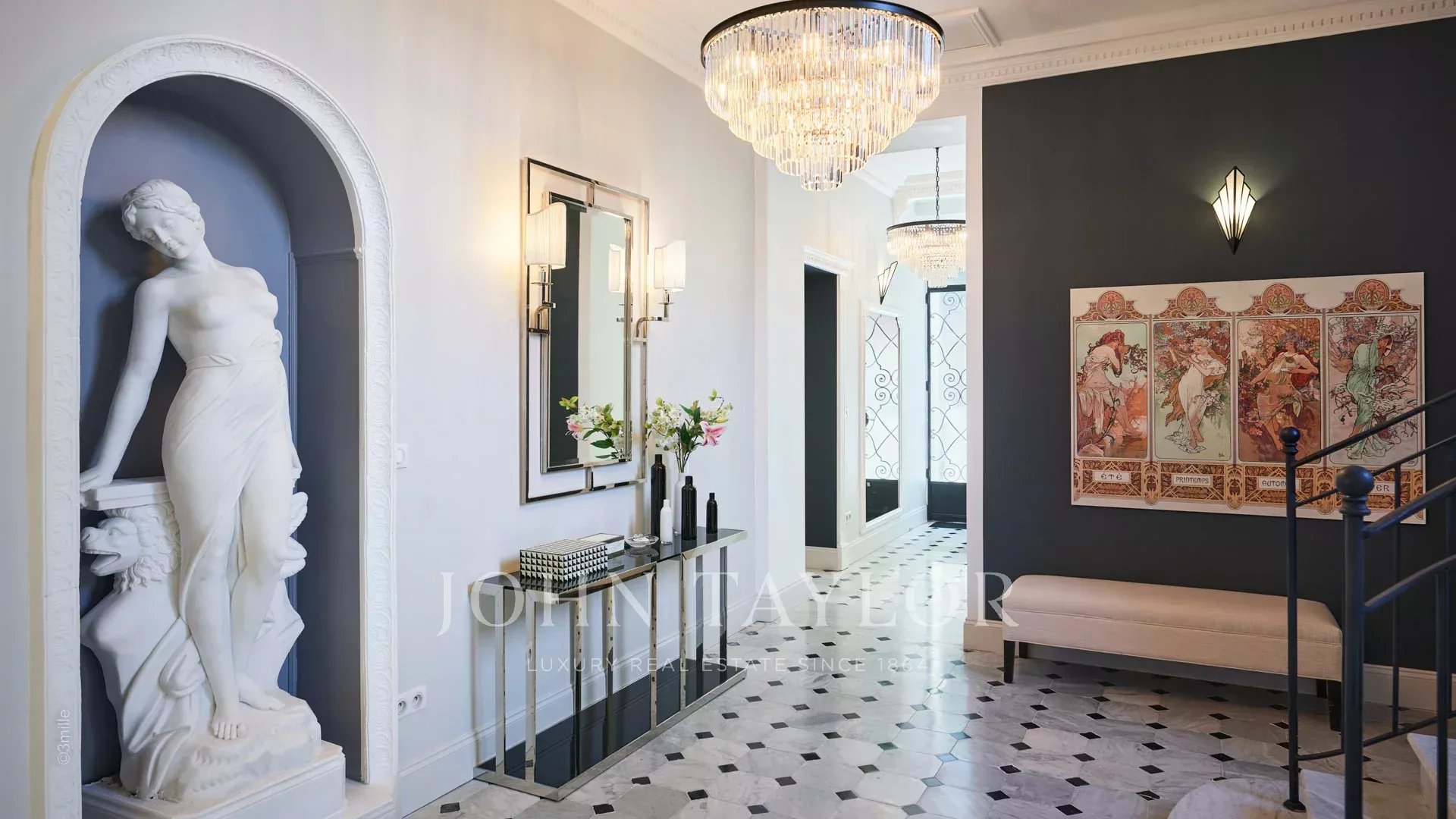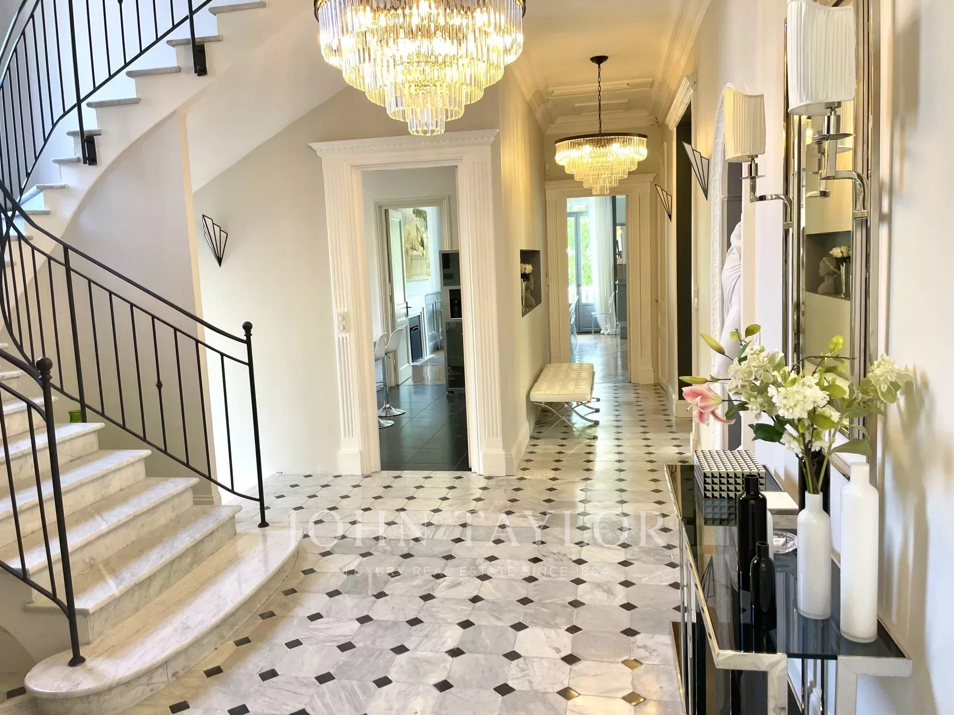 Hall de entrada elegante que conduz à sala de receção tripla, abrindo para o terraço de 60 m2 com vista para a piscina.