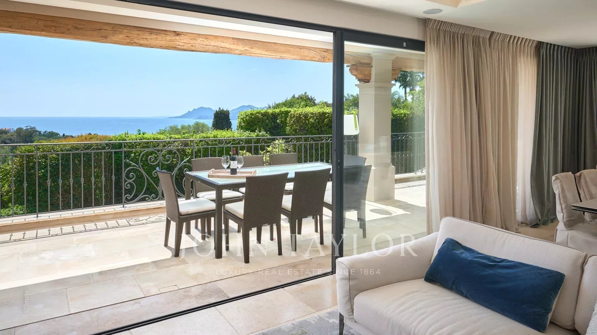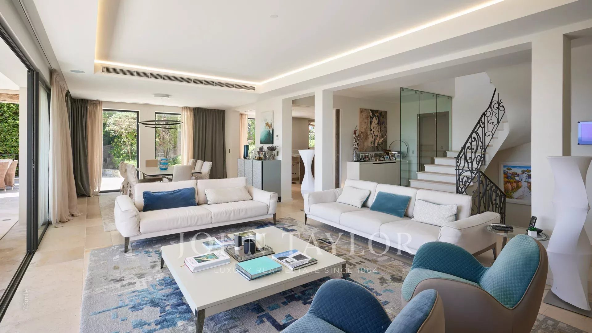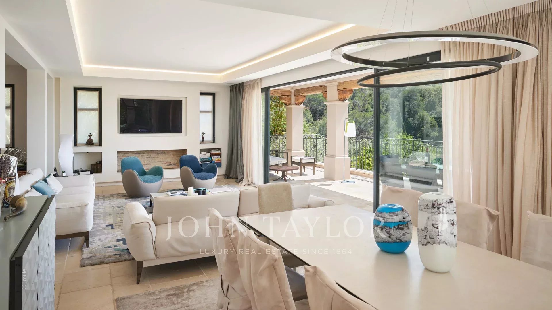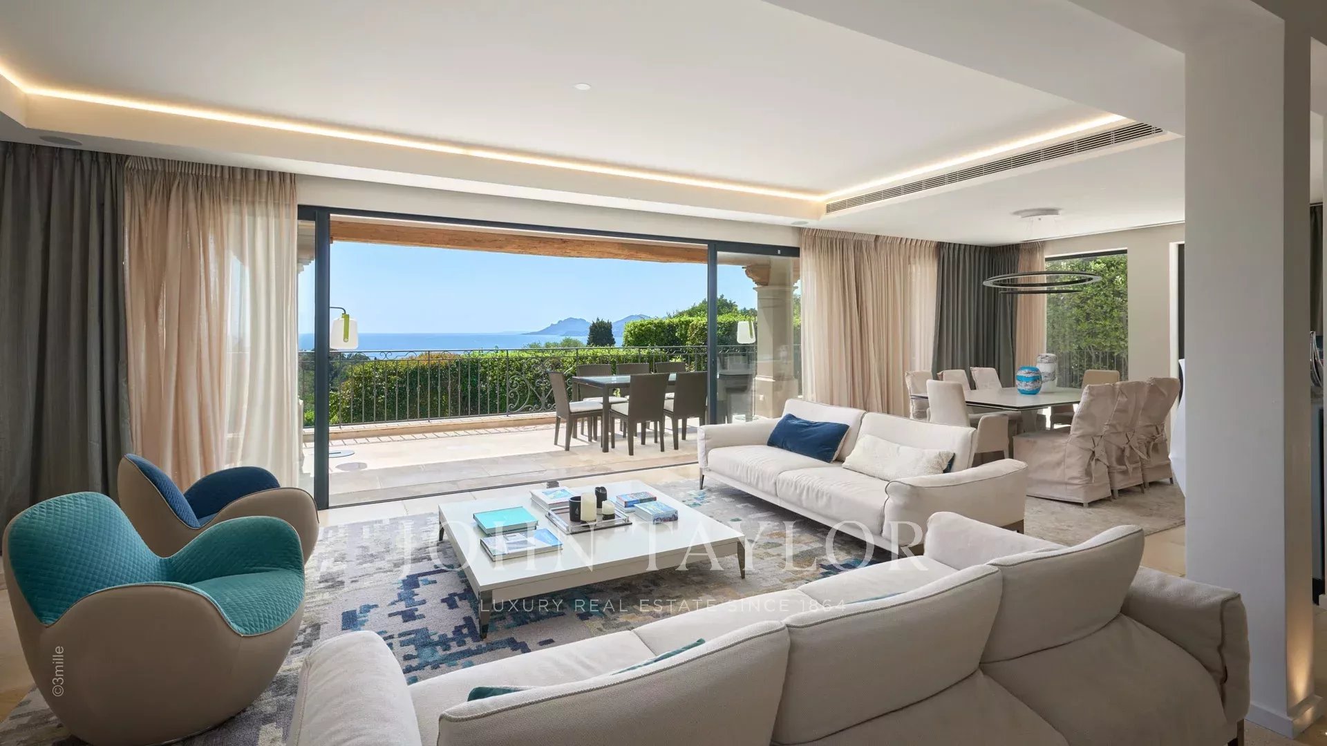 Hall de entrada que dá acesso à sala de receção composta por sala de estar, sala de jantar e cozinha em plano aberto, todas abertas para o terraço com vista panorâmica sobre a baía de Cannes.