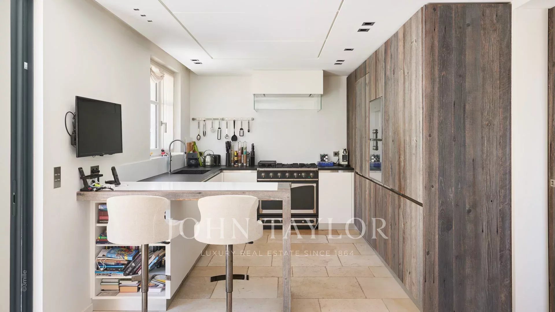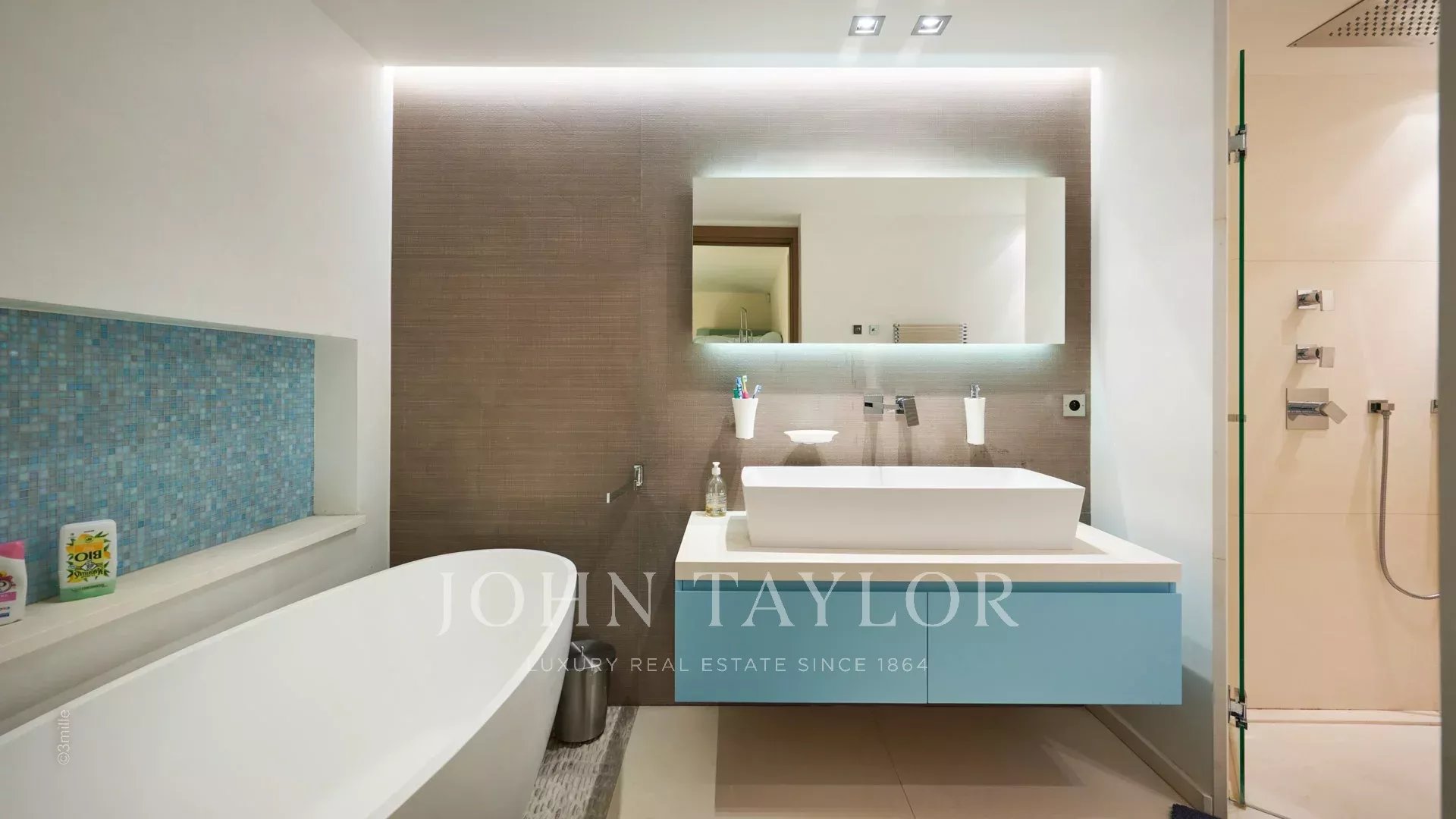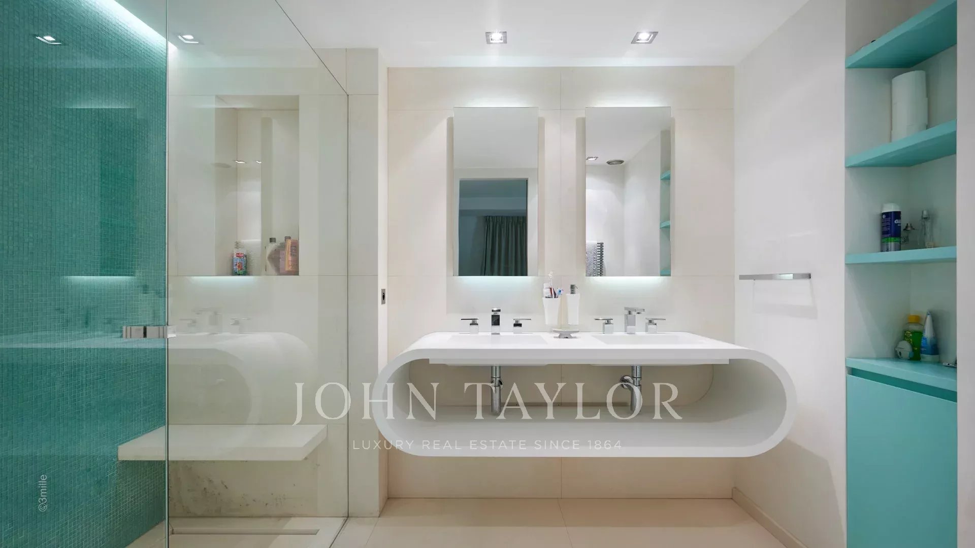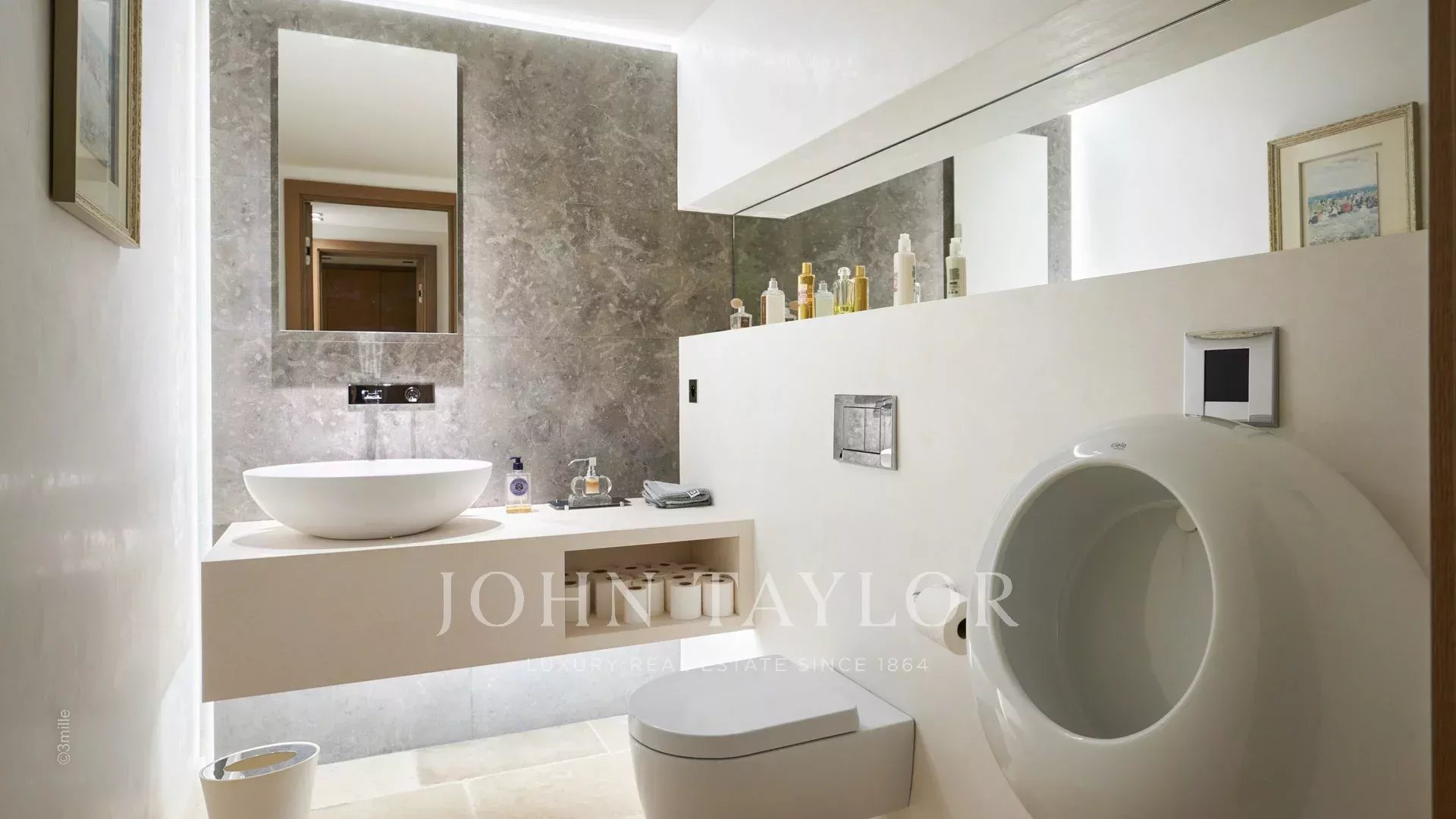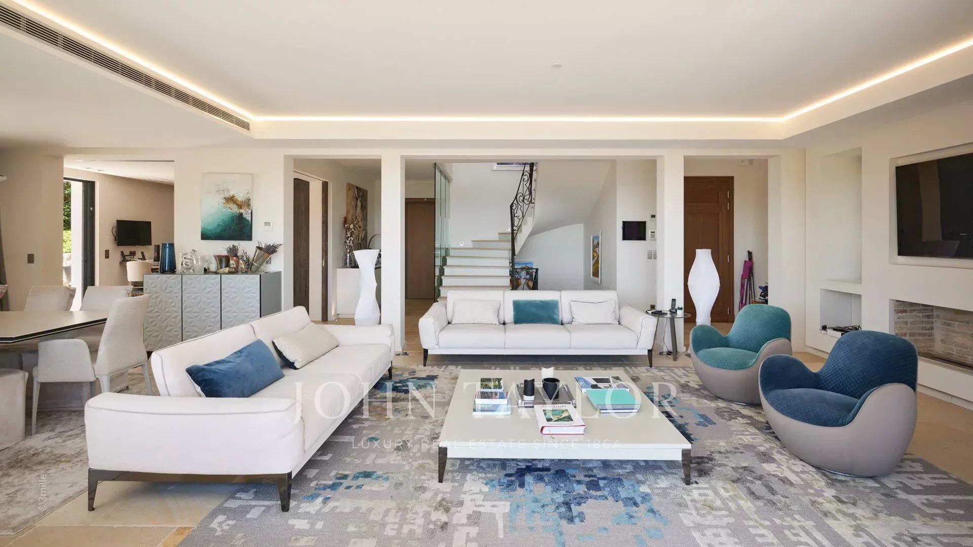 Hall de entrada que dá acesso à sala de receção composta por sala de estar, sala de jantar e cozinha em plano aberto, todas abertas para o terraço com vista panorâmica sobre a baía de Cannes.