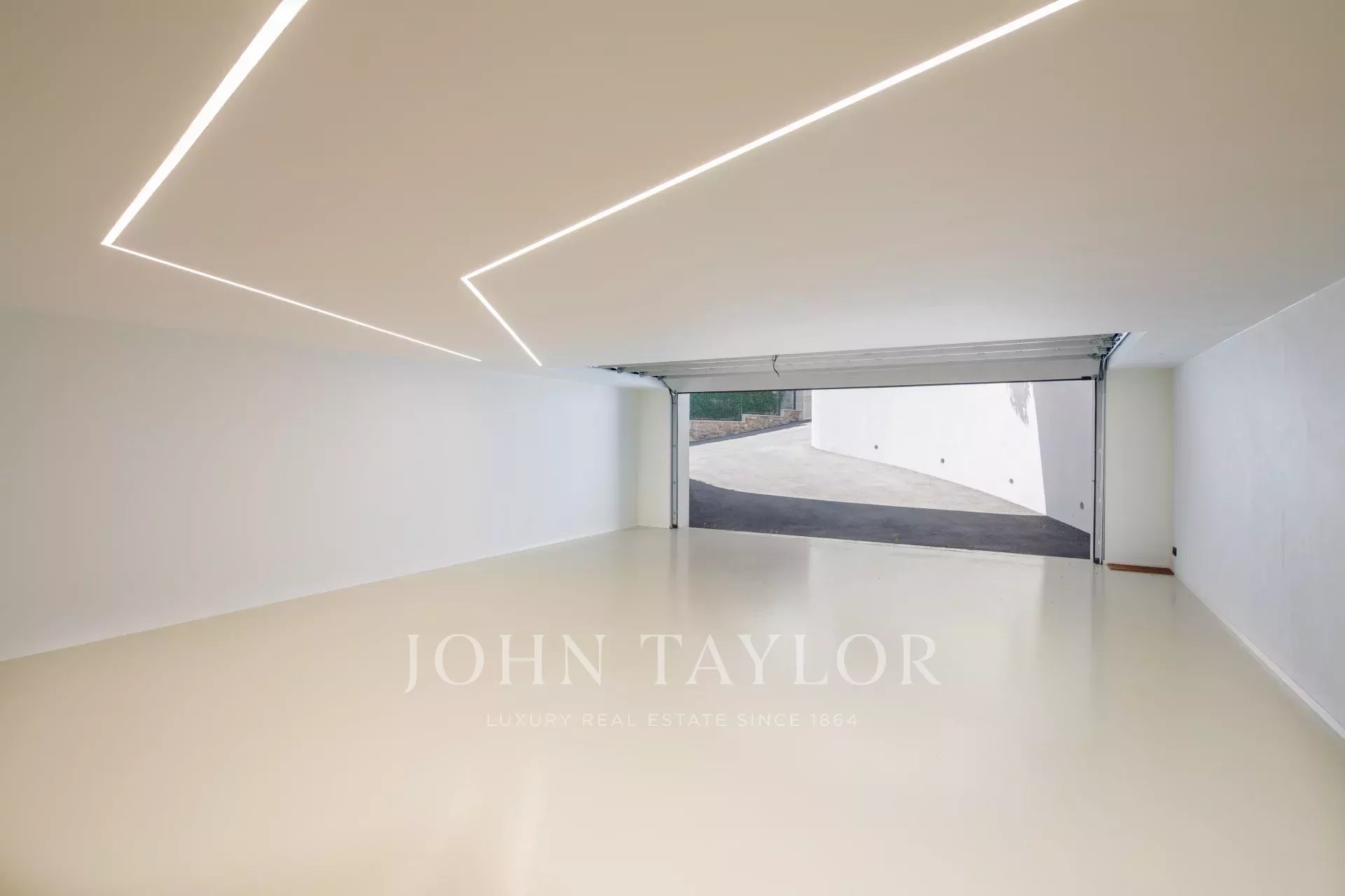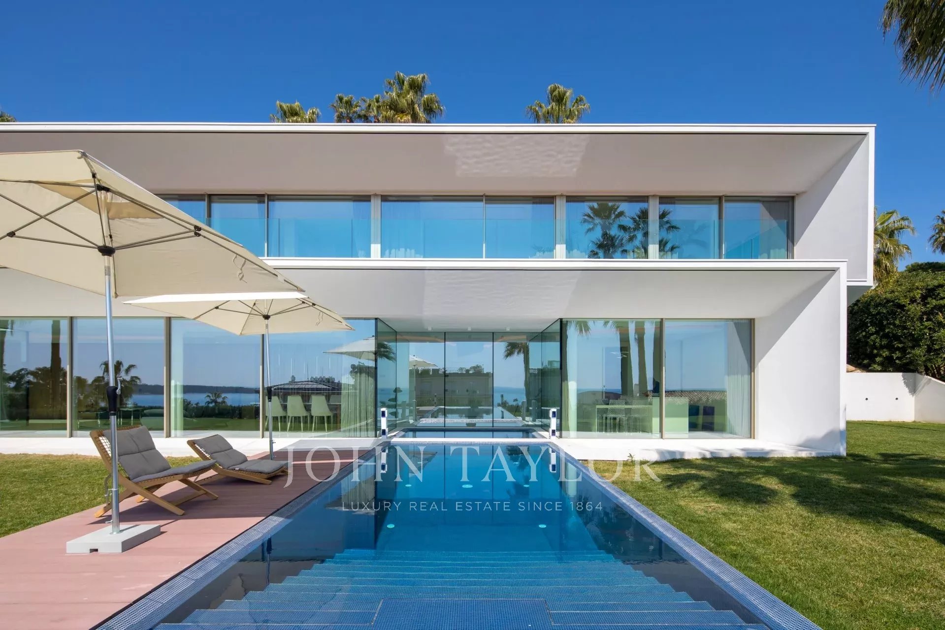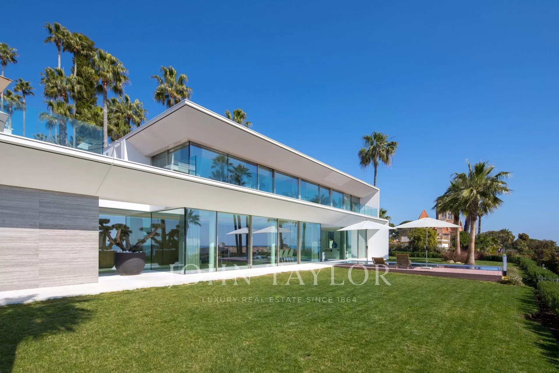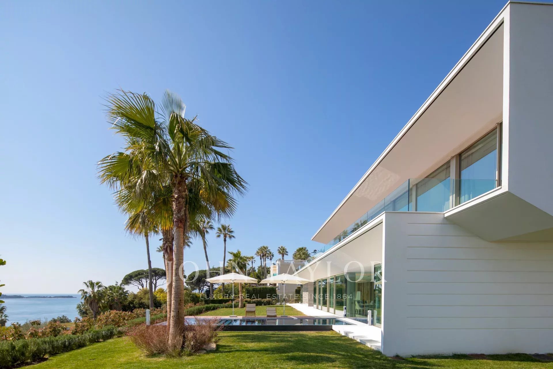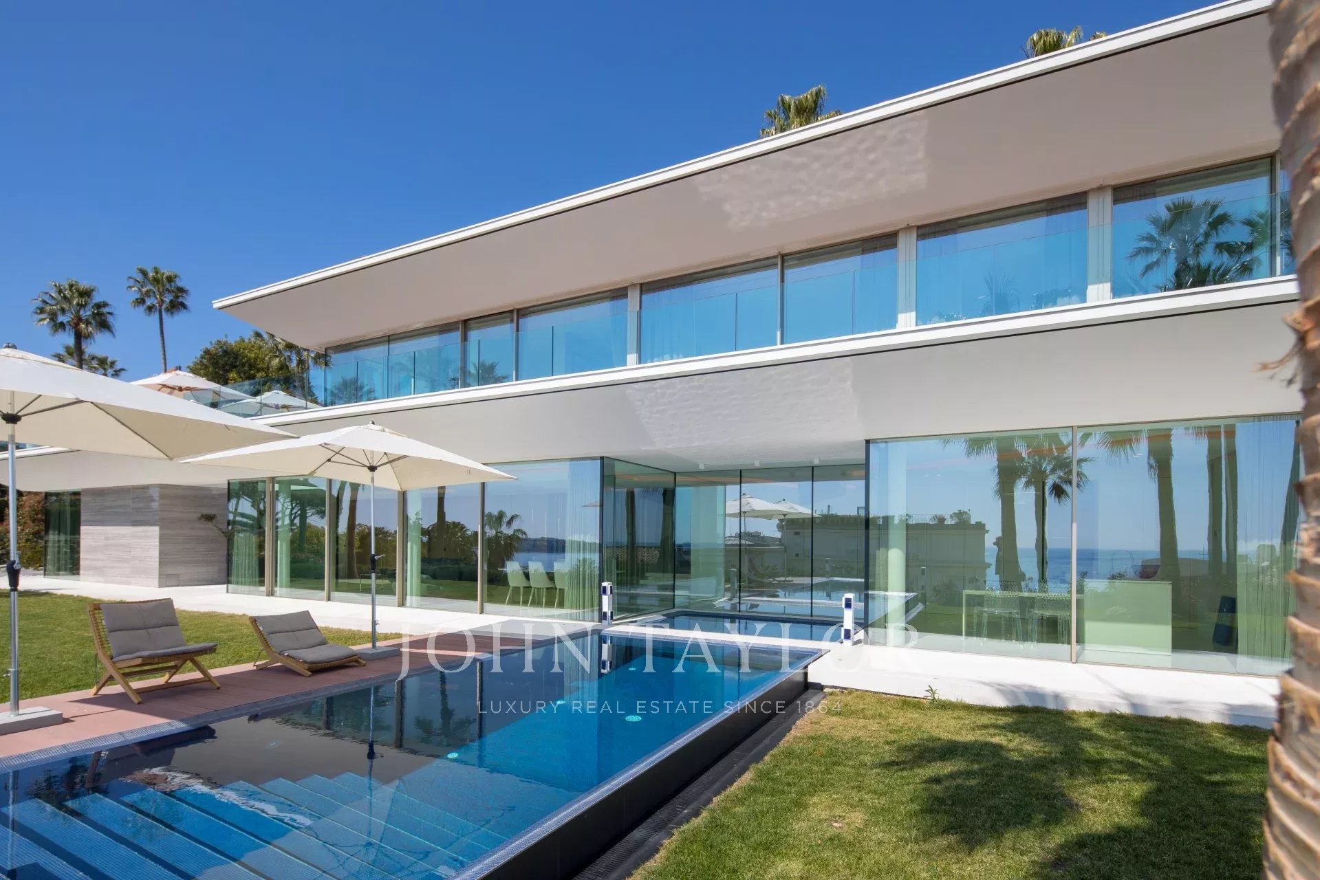 Situada numa propriedade fechada perto do mar e do centro da cidade, esta esplêndida moradia contemporânea nova é totalmente climatizada e oferece vistas soberbas sobre a Baía de Cannes.