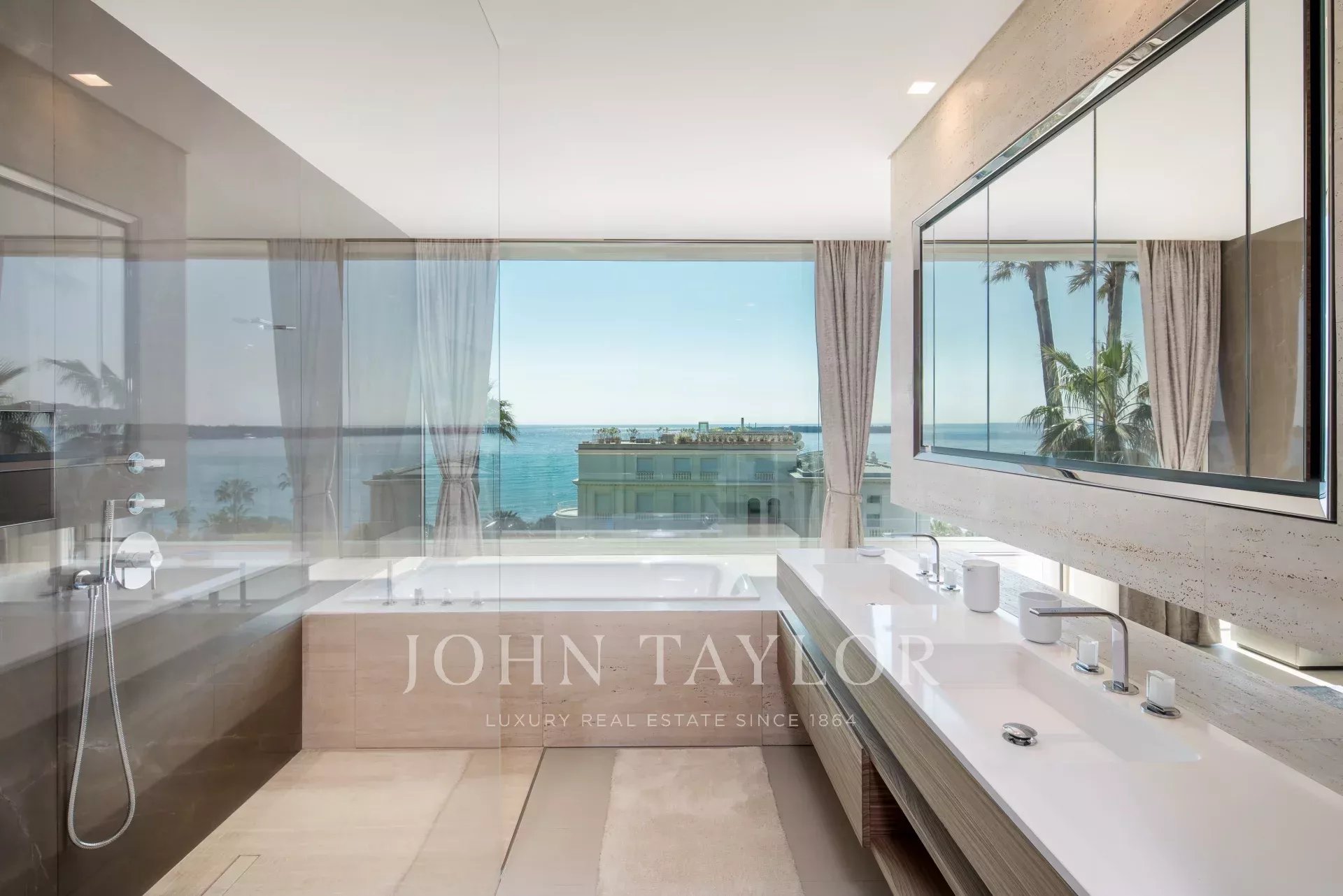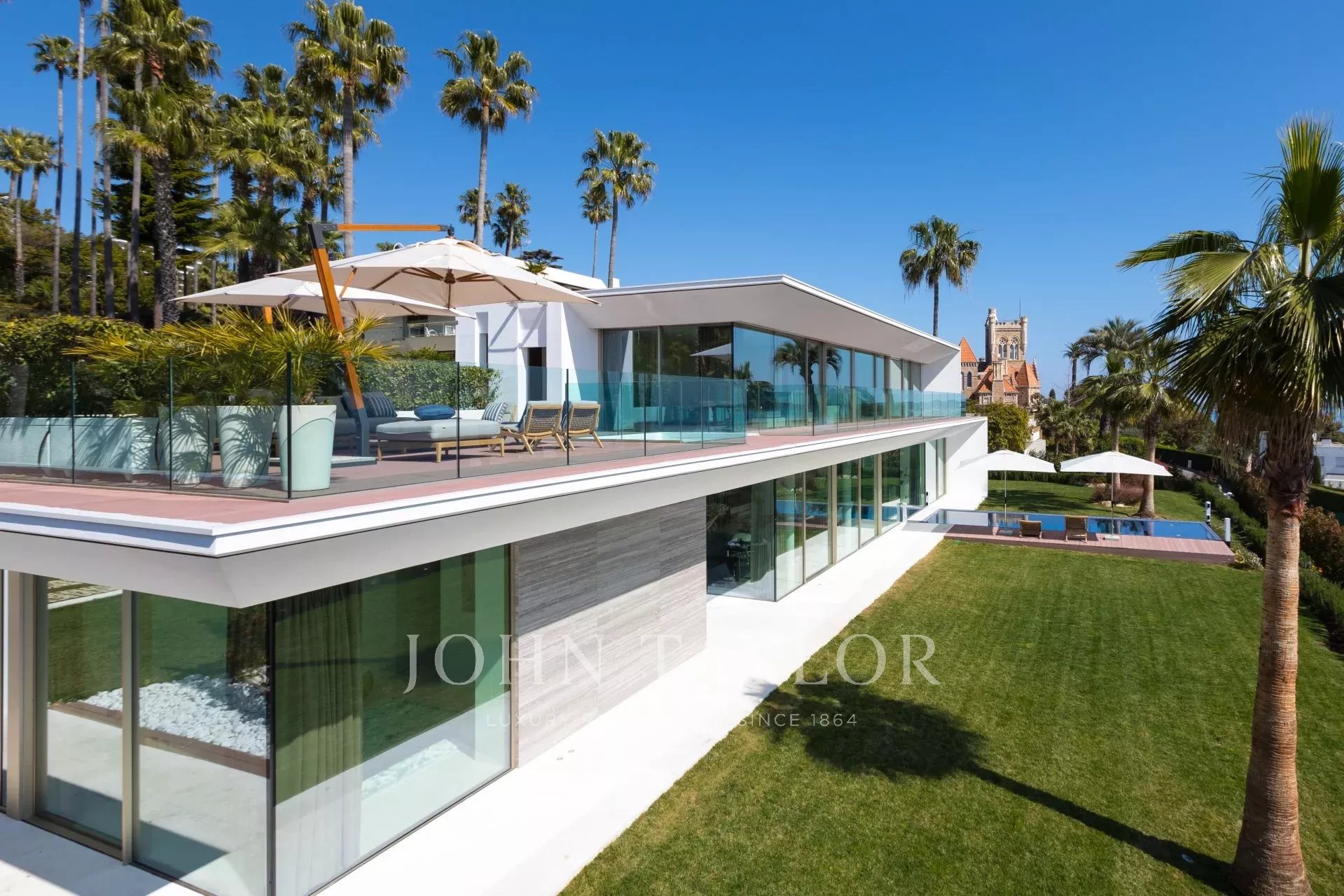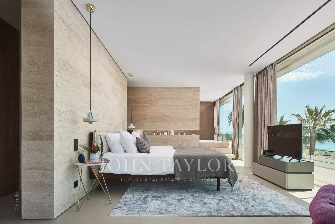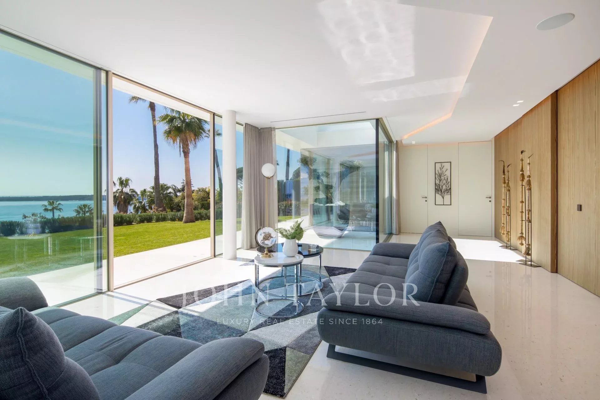 Situada numa propriedade fechada perto do mar e do centro da cidade, esta esplêndida moradia contemporânea nova é totalmente climatizada e oferece vistas soberbas sobre a Baía de Cannes.