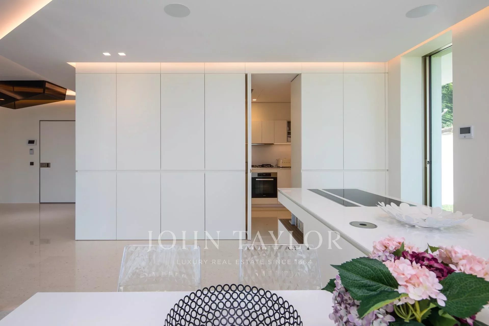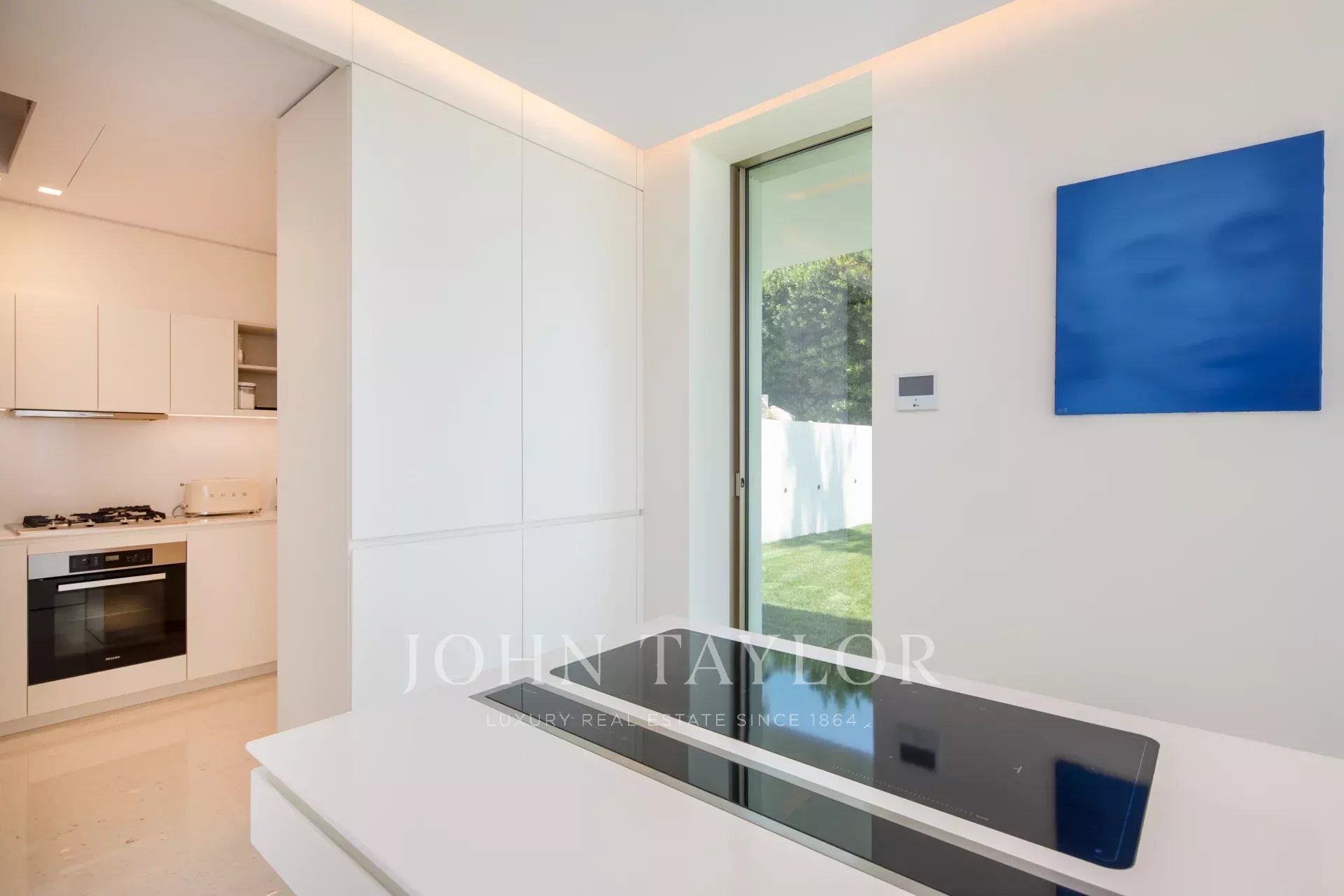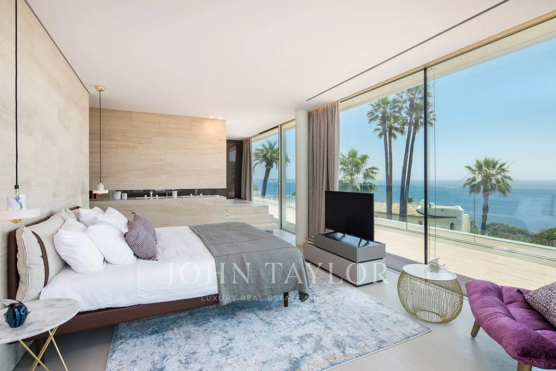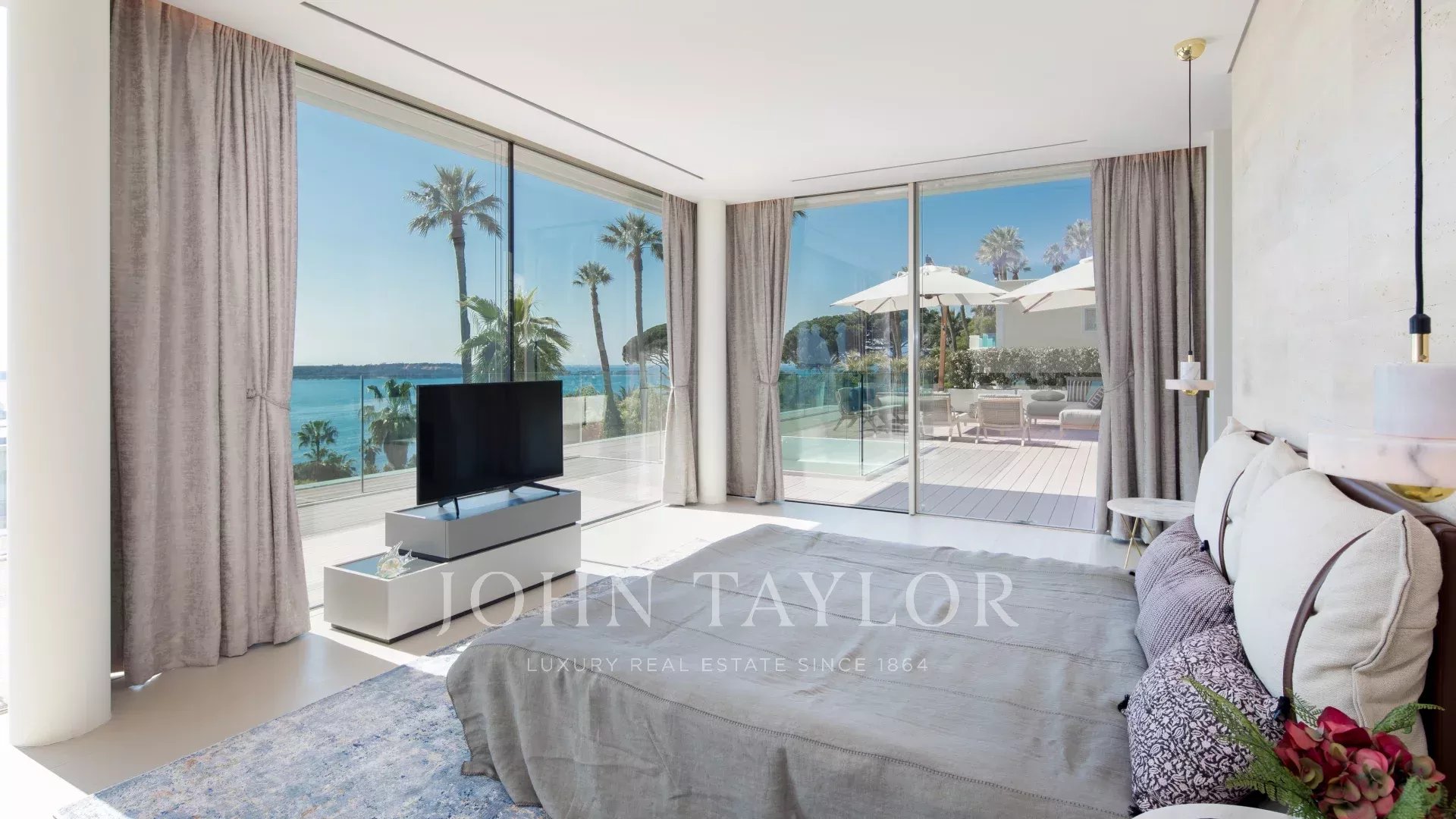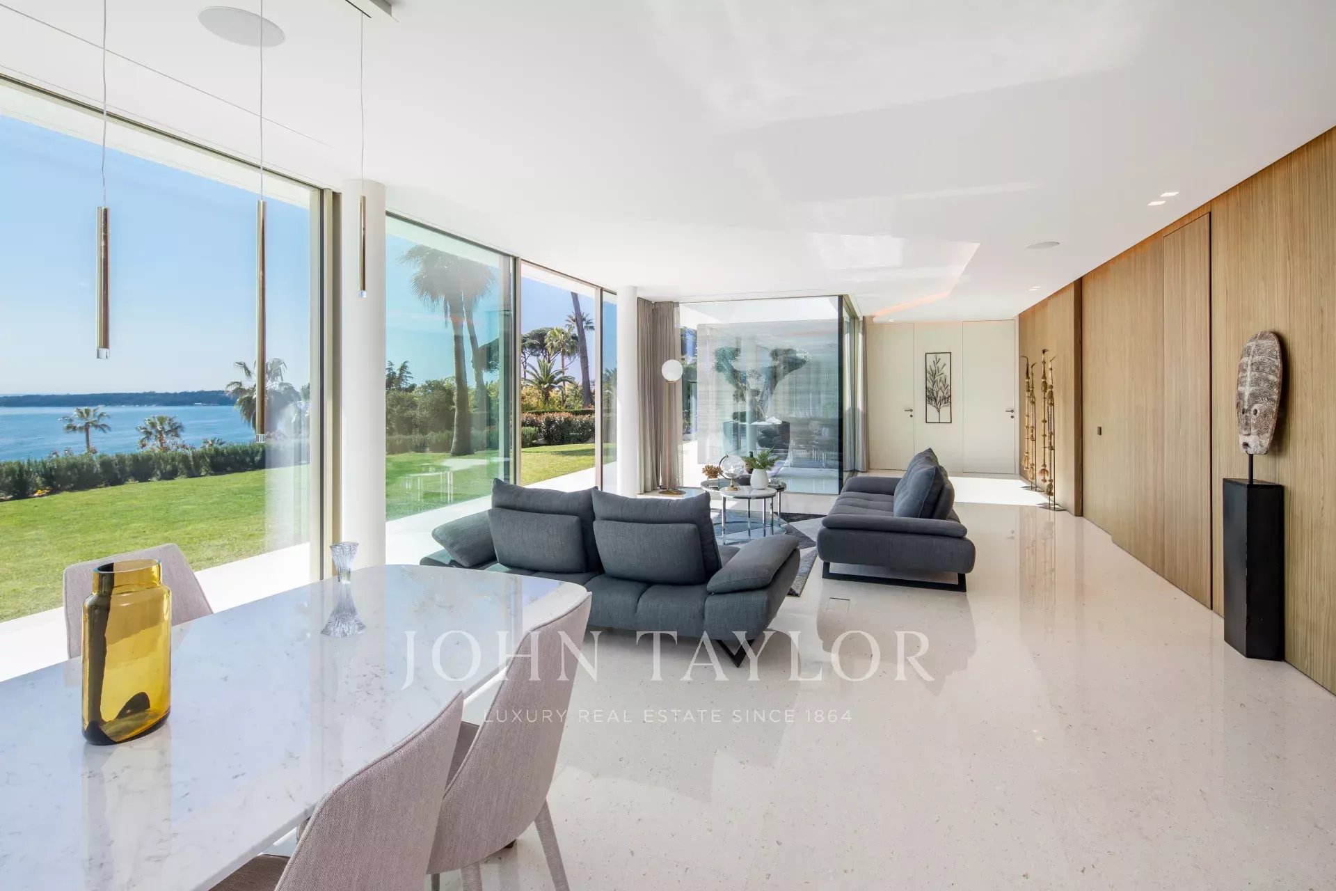 Situada numa propriedade fechada perto do mar e do centro da cidade, esta esplêndida moradia contemporânea nova é totalmente climatizada e oferece vistas soberbas sobre a Baía de Cannes.