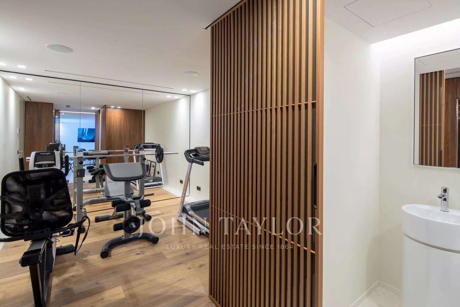 Distribuída por três pisos e equipada com um elevador, a moradia tem 550 m2 de área habitacional no coração de um terreno de 2.245 m2 e está virada a sul: