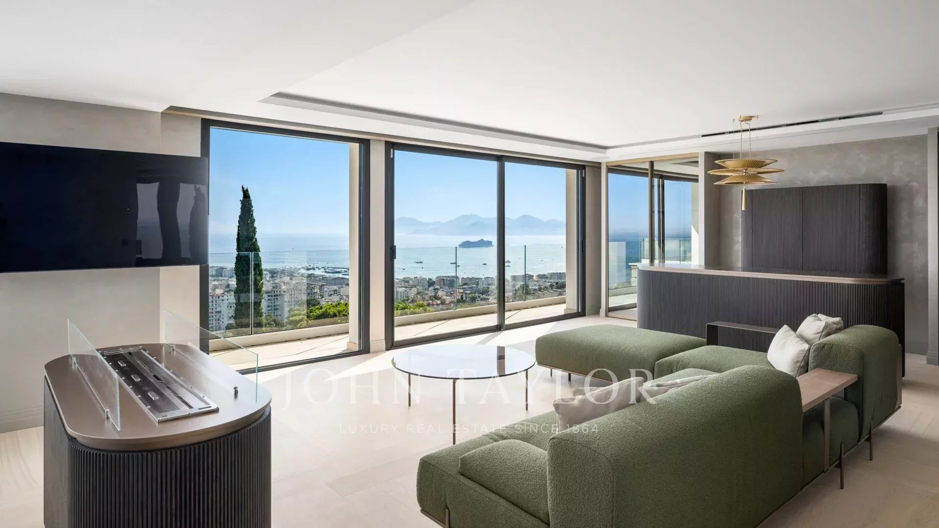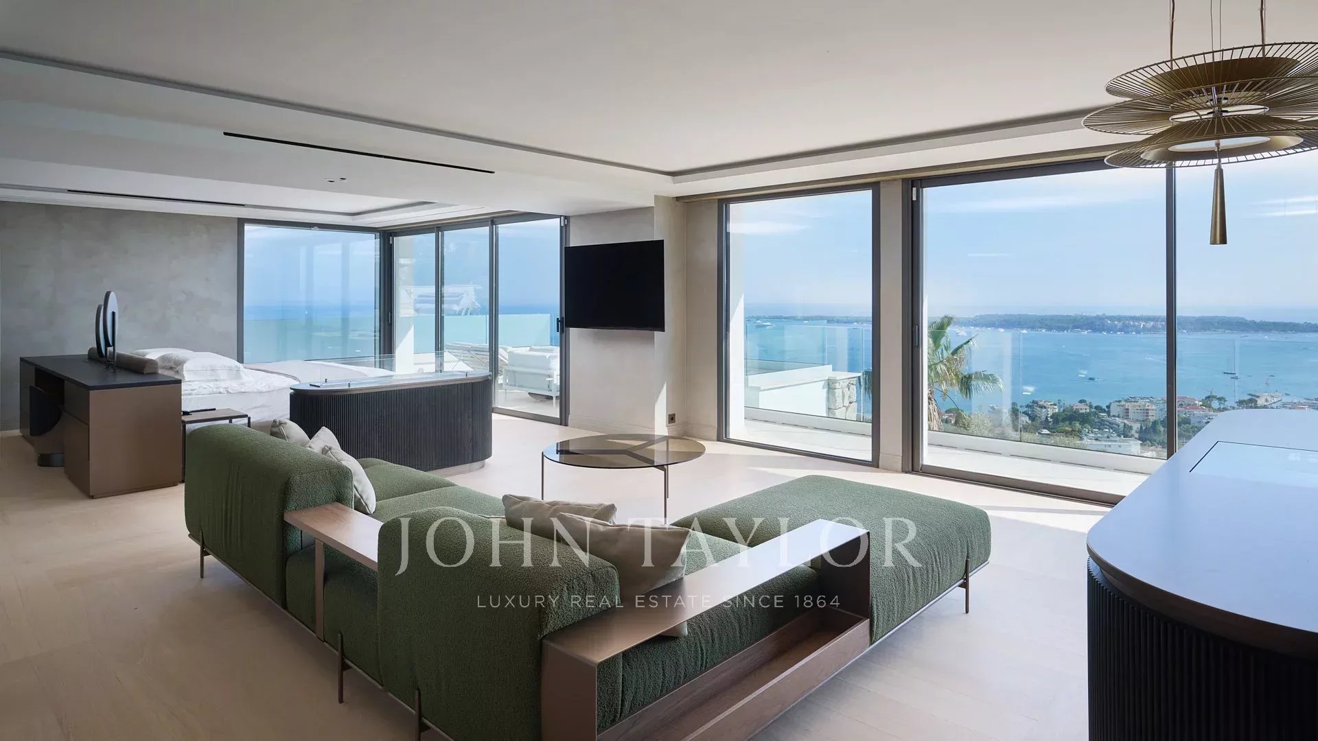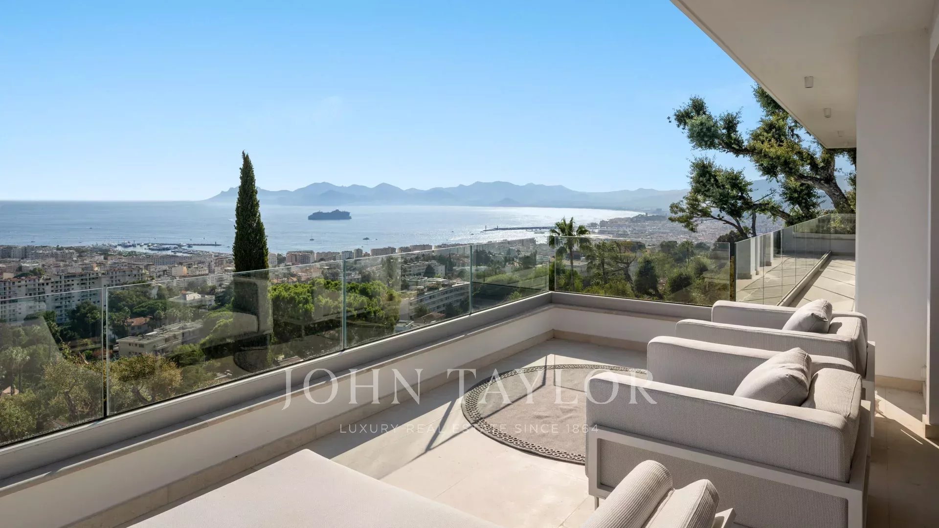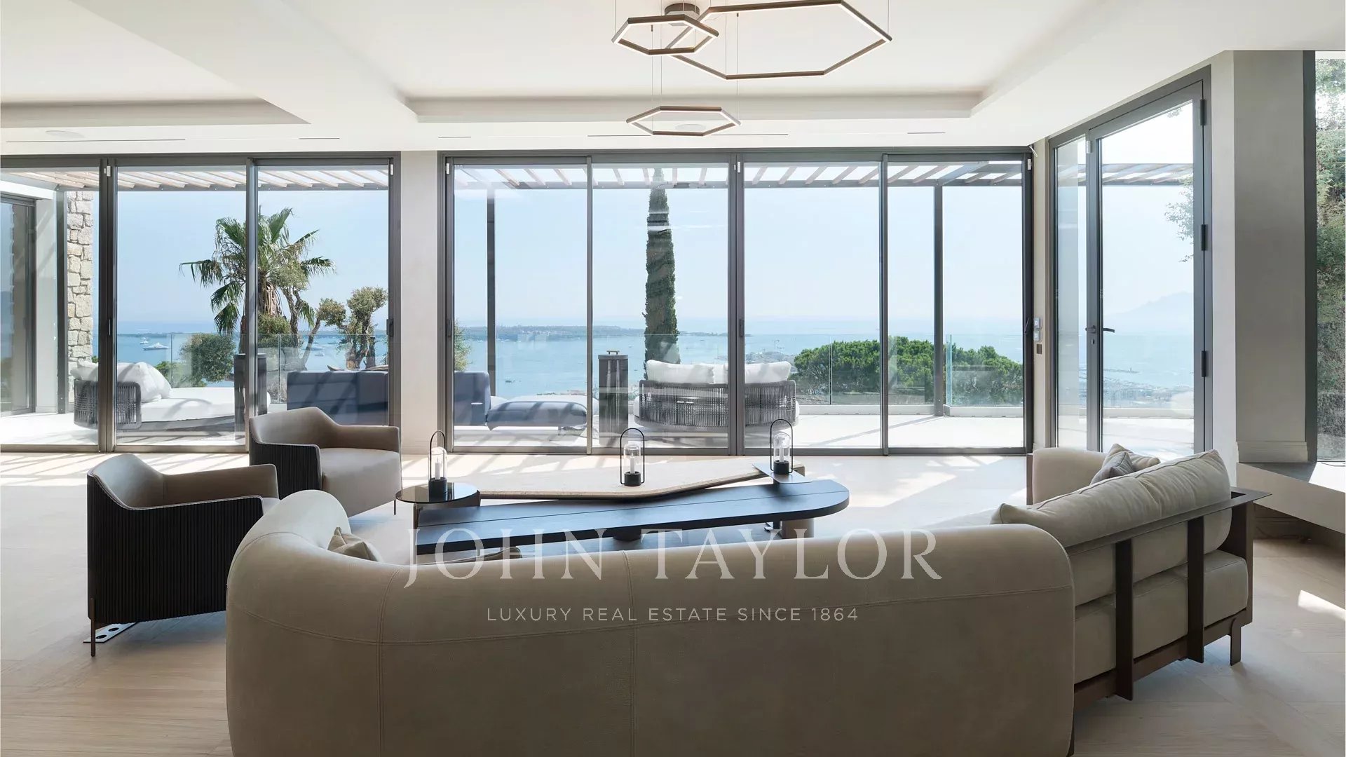 Com 550 m² de área habitacional, a villa apresenta uma decoração sofisticada e vistas ininterruptas sobre a Baía de Cannes e as Ilhas Lérins, garantindo panoramas de cortar a respiração.