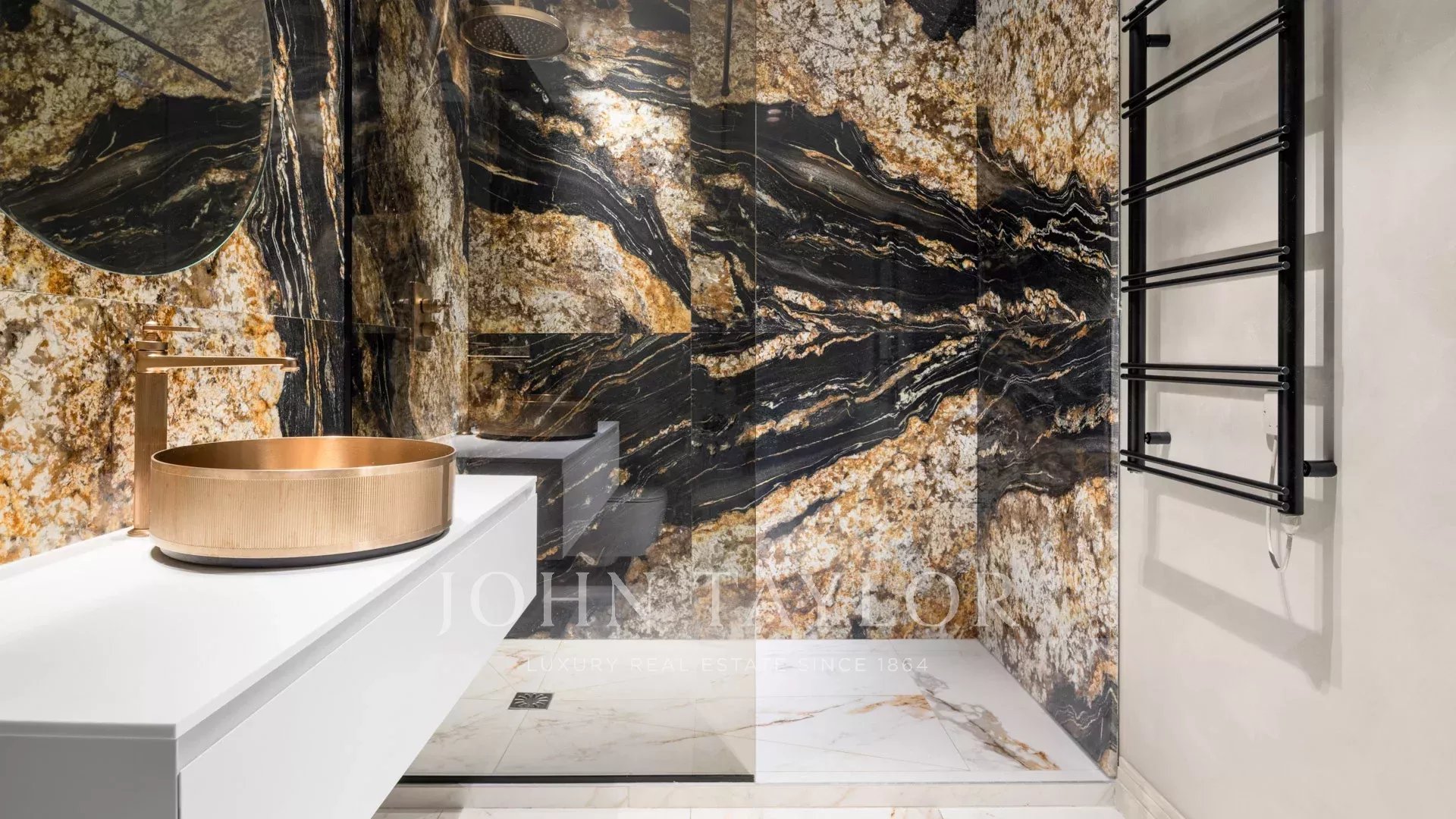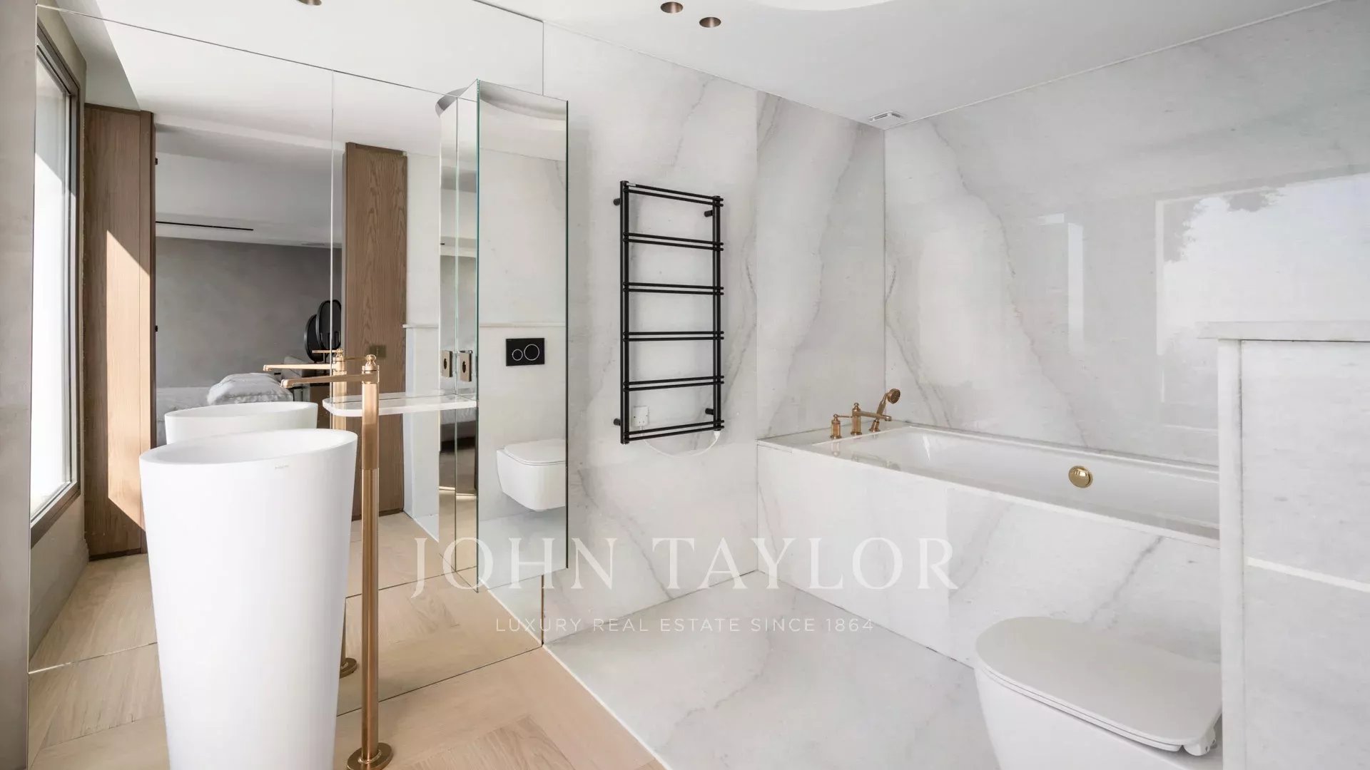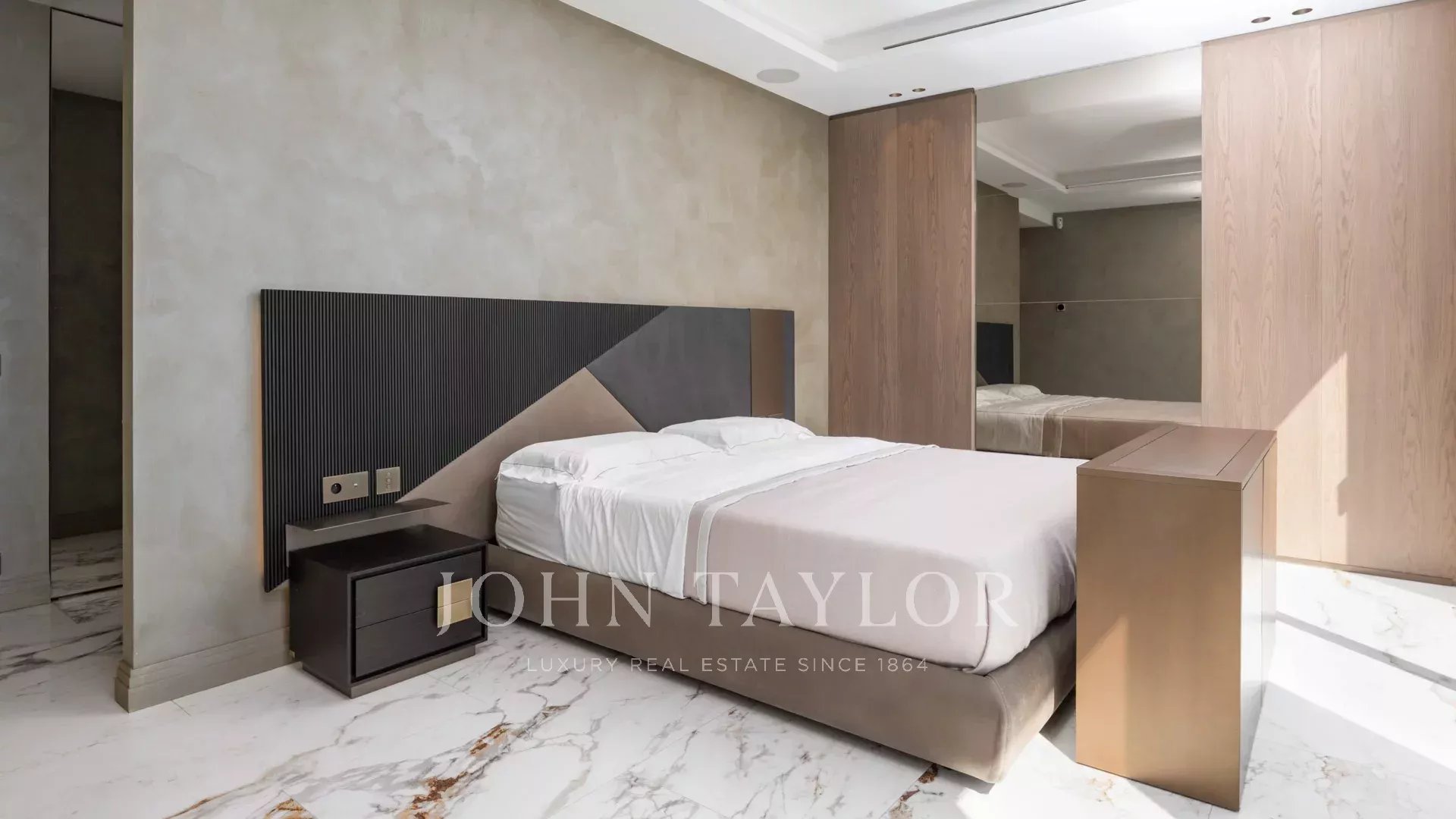 Uma suite principal com cerca de 85m² (cama de casal 200cm) composta por uma sala de estar, um bar, abrindo para um terraço, quarto de vestir e casa de banho com duche.