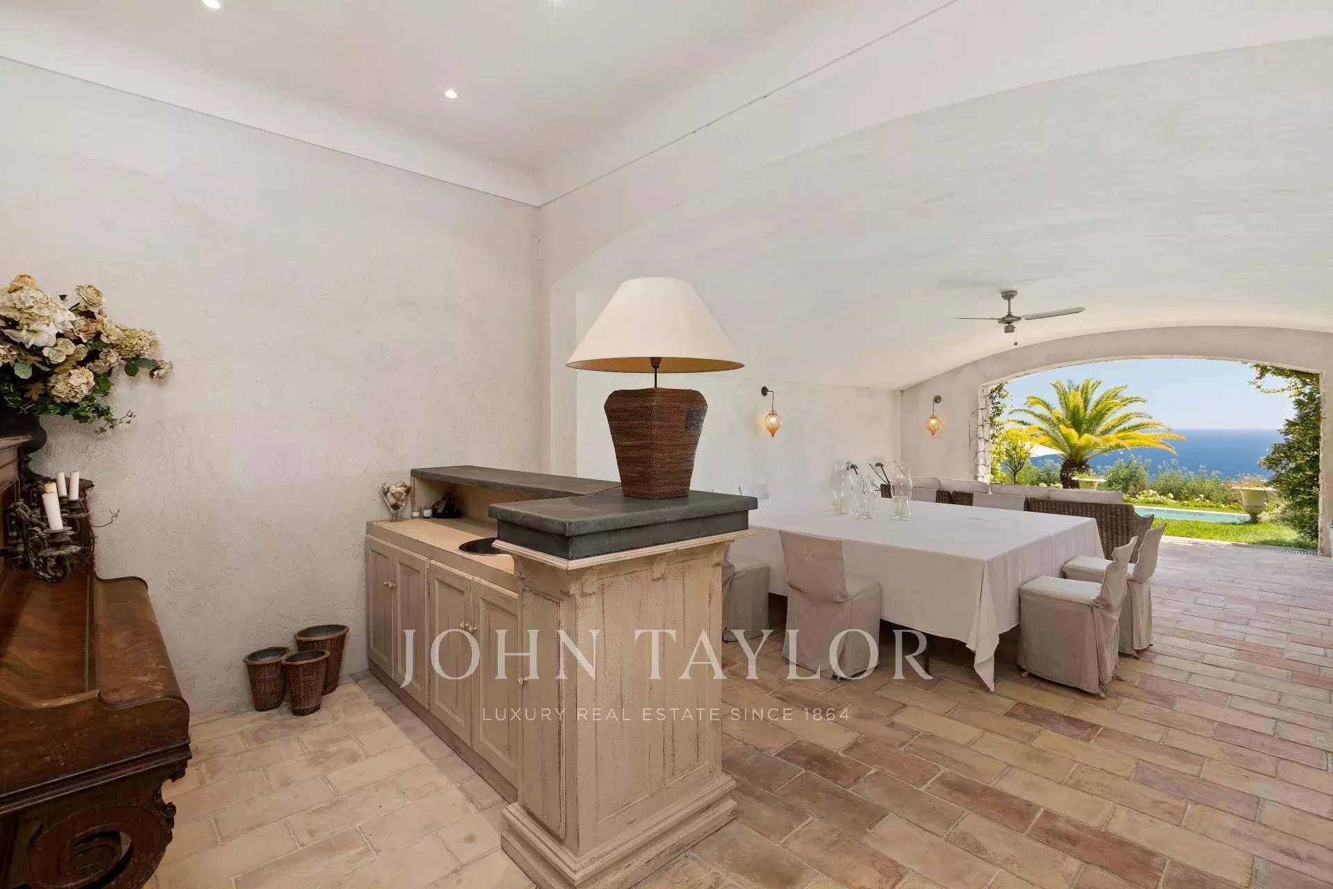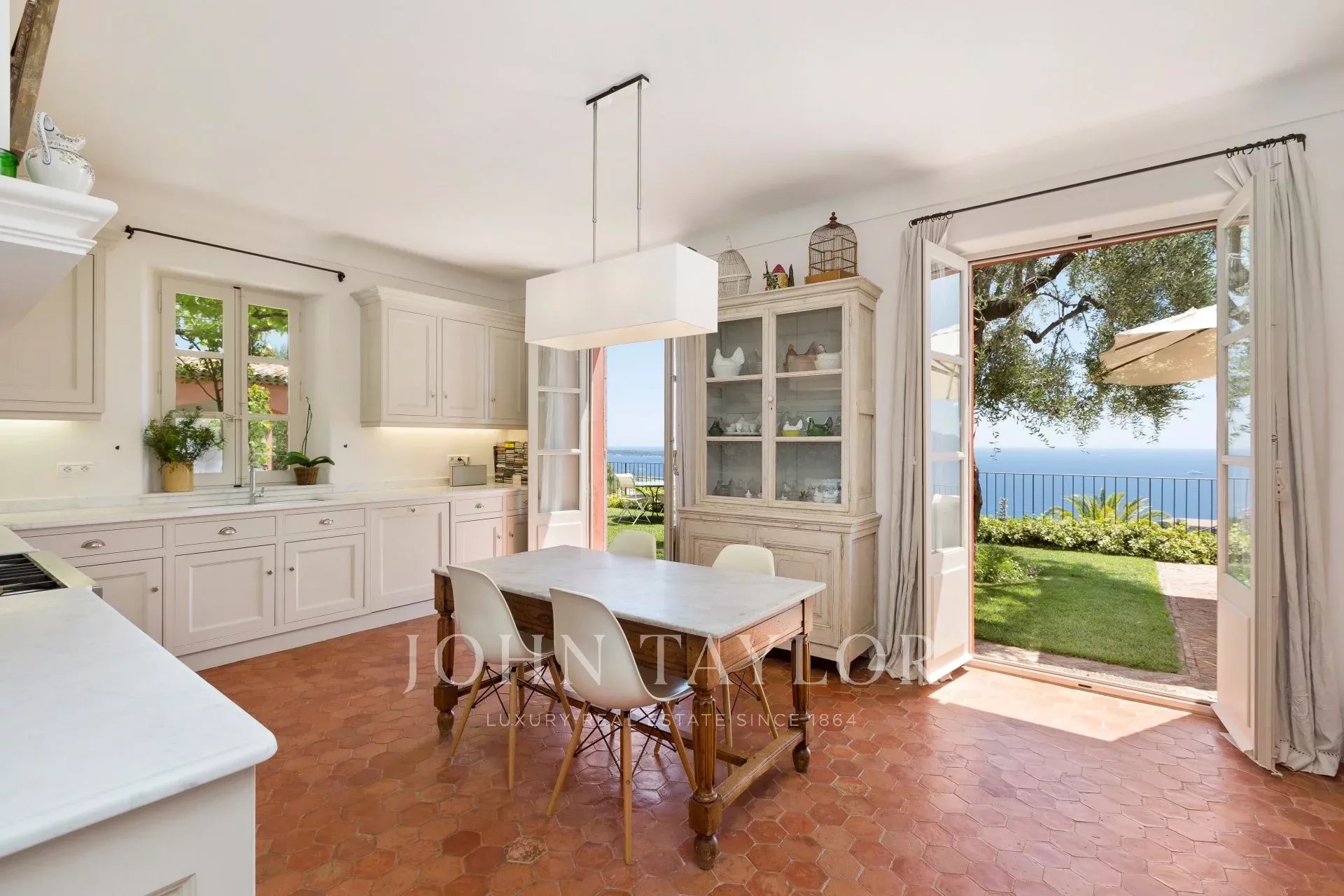 Cozinha totalmente equipada que se abre para o terraço e o jardim;