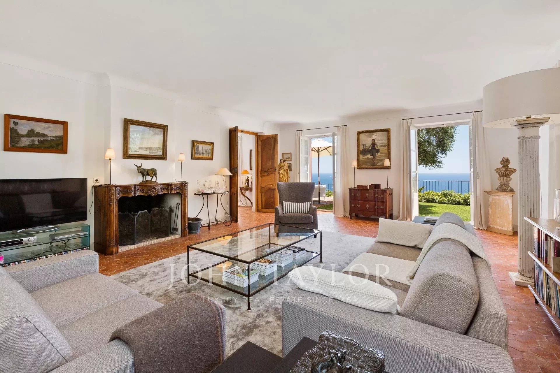Hall de entrada que conduz à sala de estar (TV) com acesso ao terraço e ao jardim, vista mar