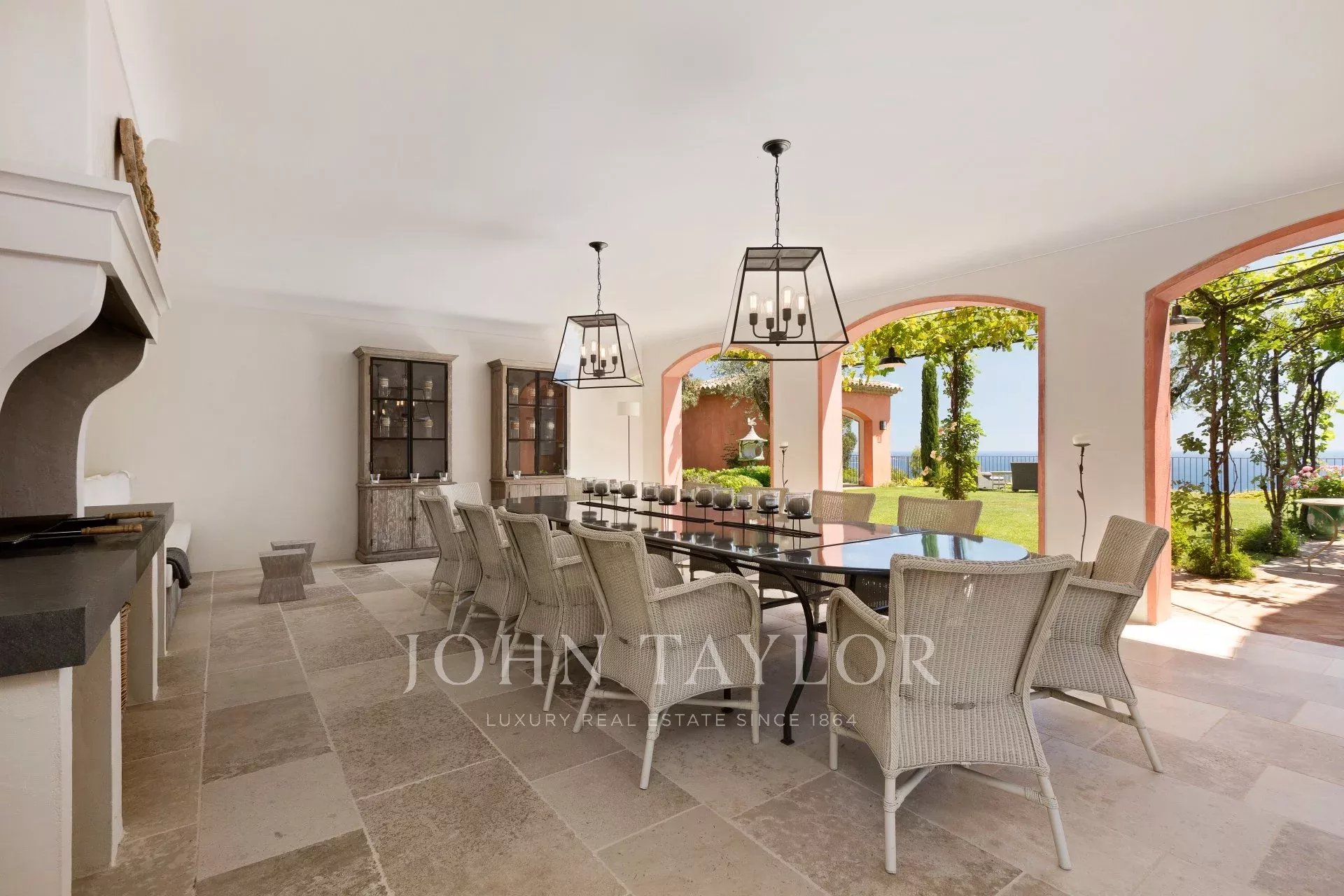 Sala de jantar que se abre para o terraço e para o jardim
