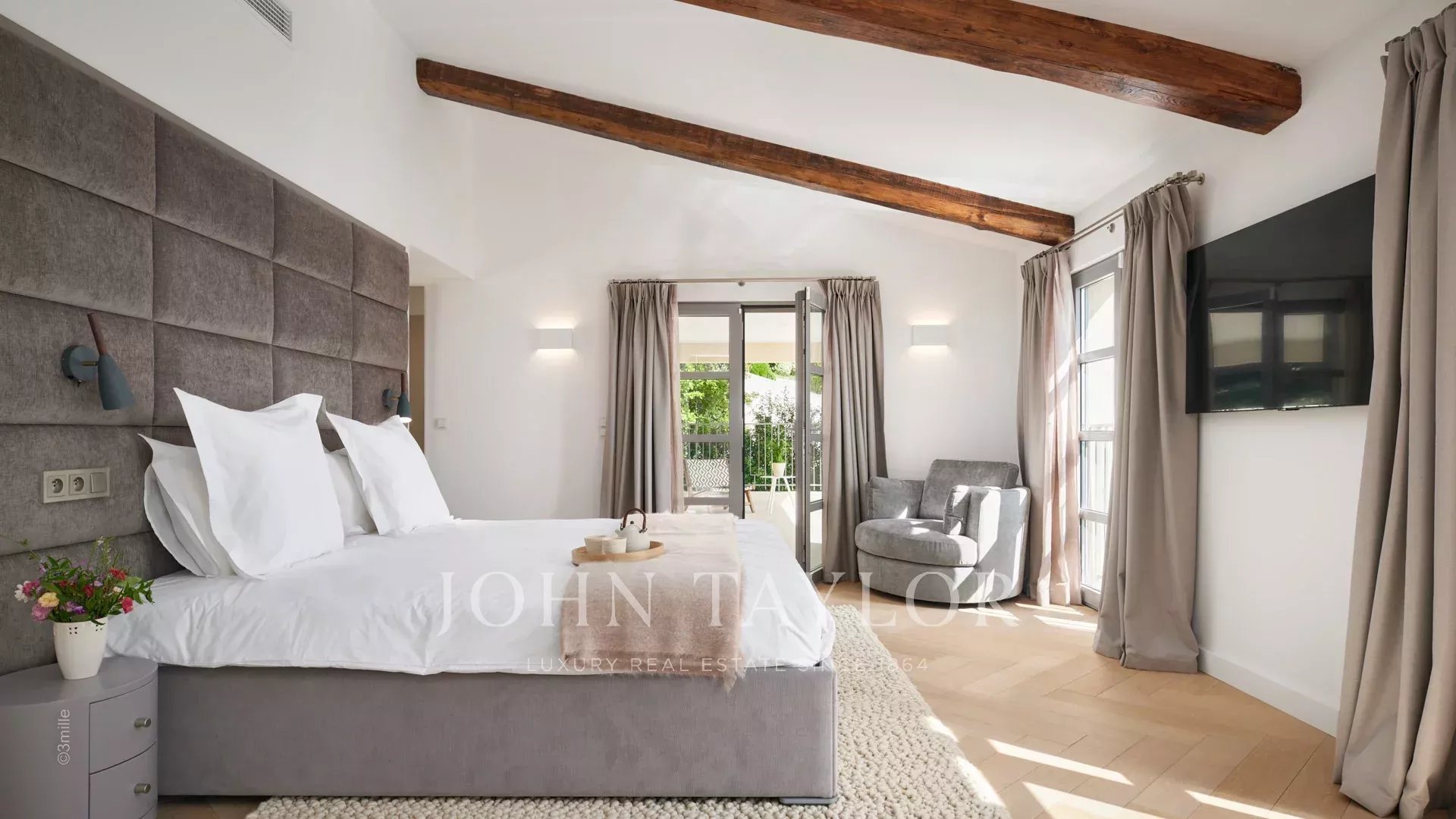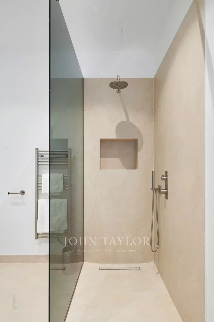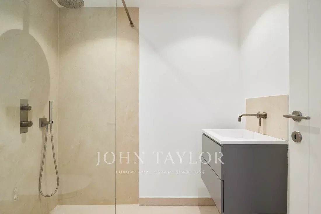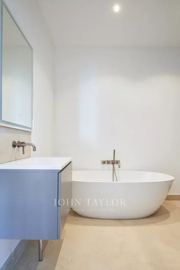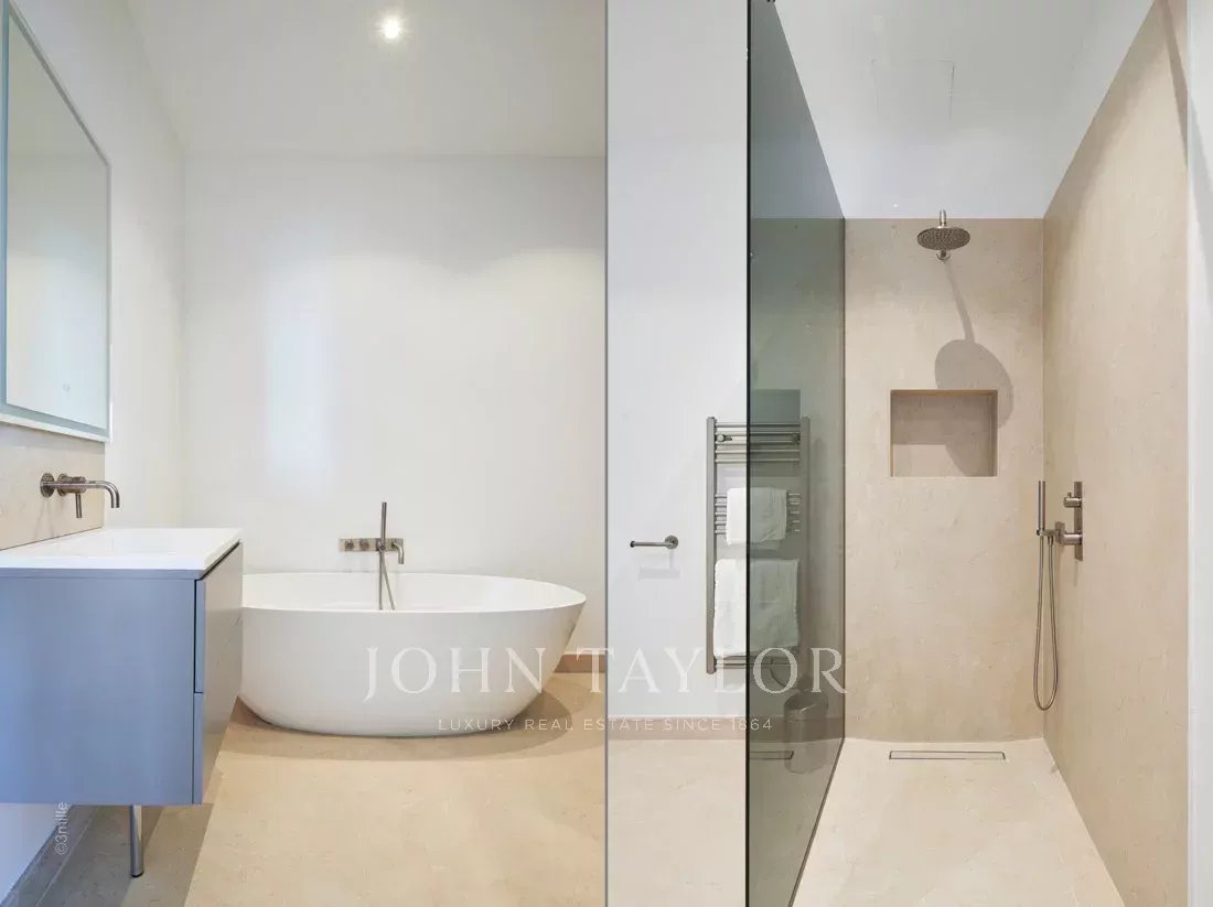 1º andar: quarto principal com cama de casal, casa de banho privativa com duche (2 chuveiros) e WC, quarto de vestir, escritório, terraço privado com vista para o mar.