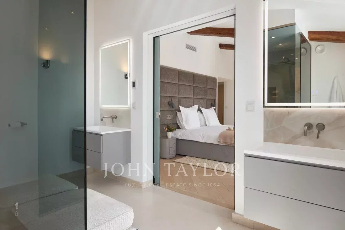 Um quarto duplo com casa de banho, casa de banho privativa com duche, WC e quarto de vestir que dá para o terraço da piscina.