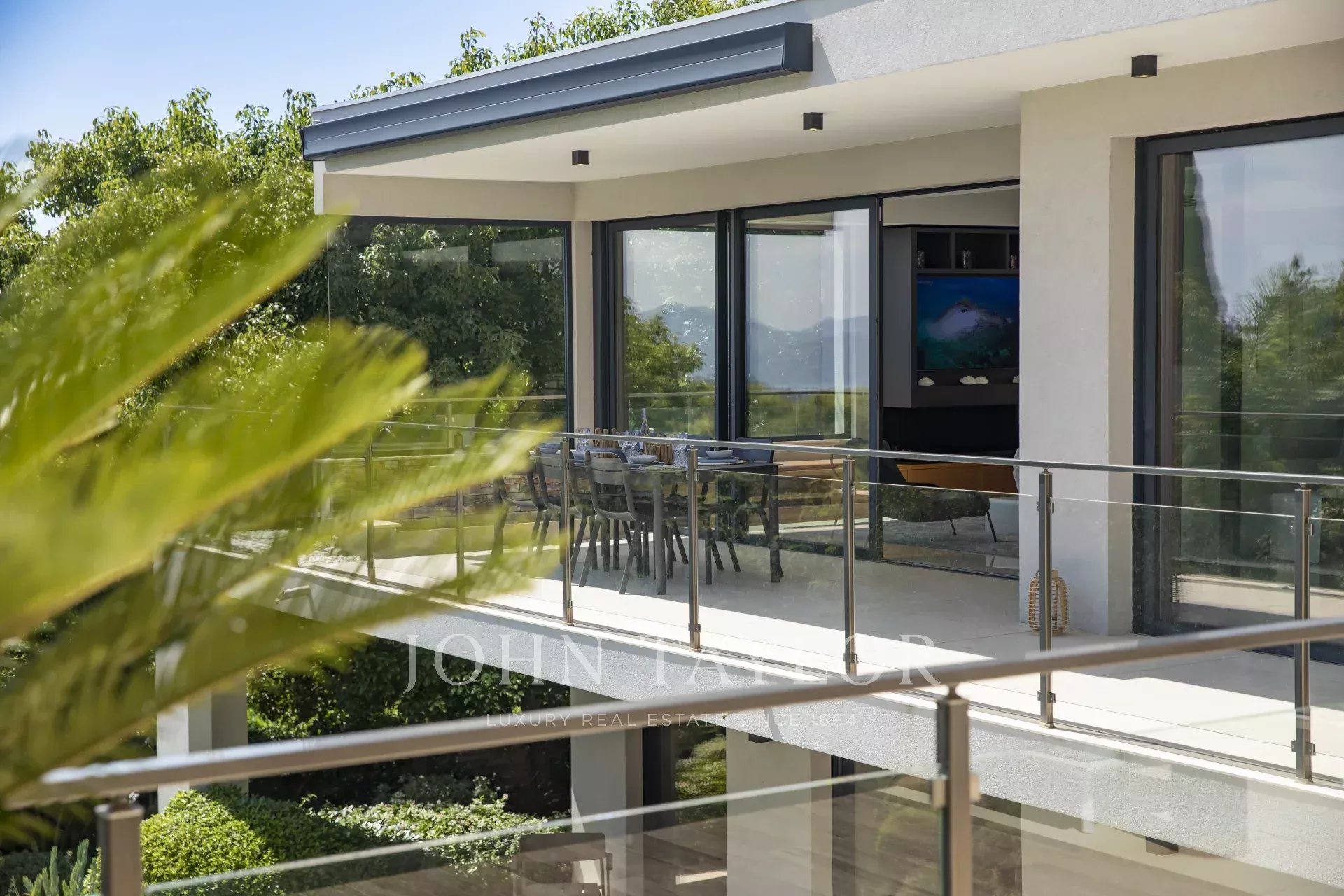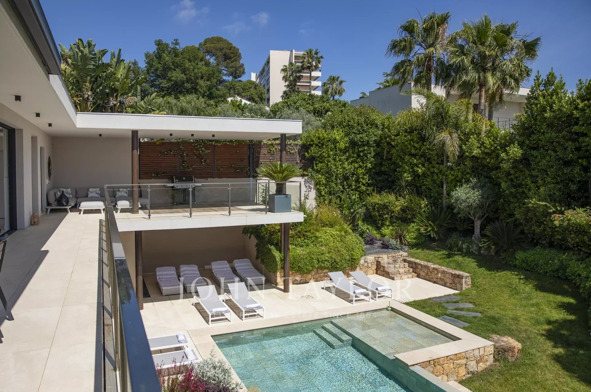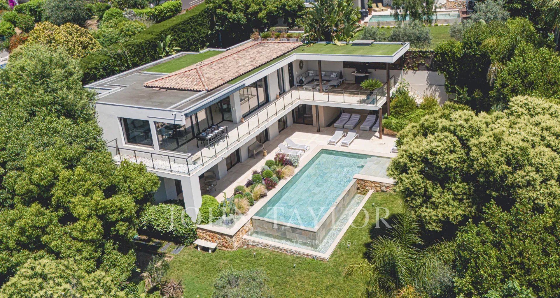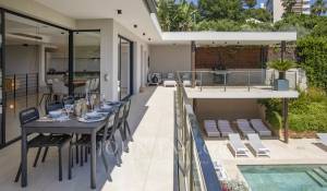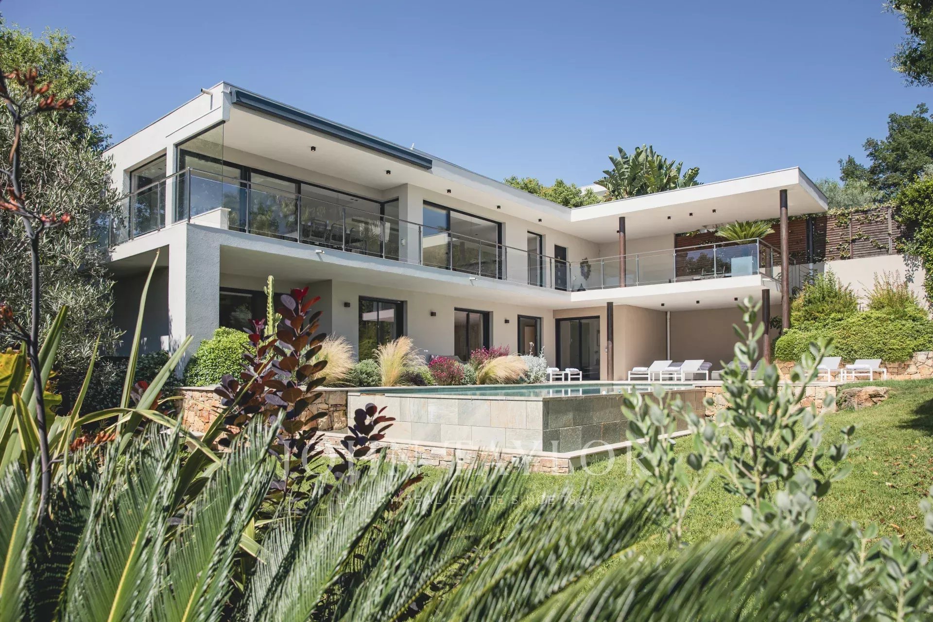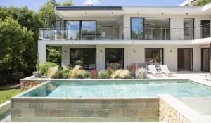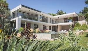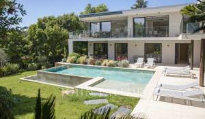 Nas alturas de Cannes, numa zona residencial perto da antiga aldeia de Le Cannet, bela moradia contemporânea com ar condicionado, 240 m2 de área de habitação, inserida em 1.374 m2 de terreno arborizado e exótico.