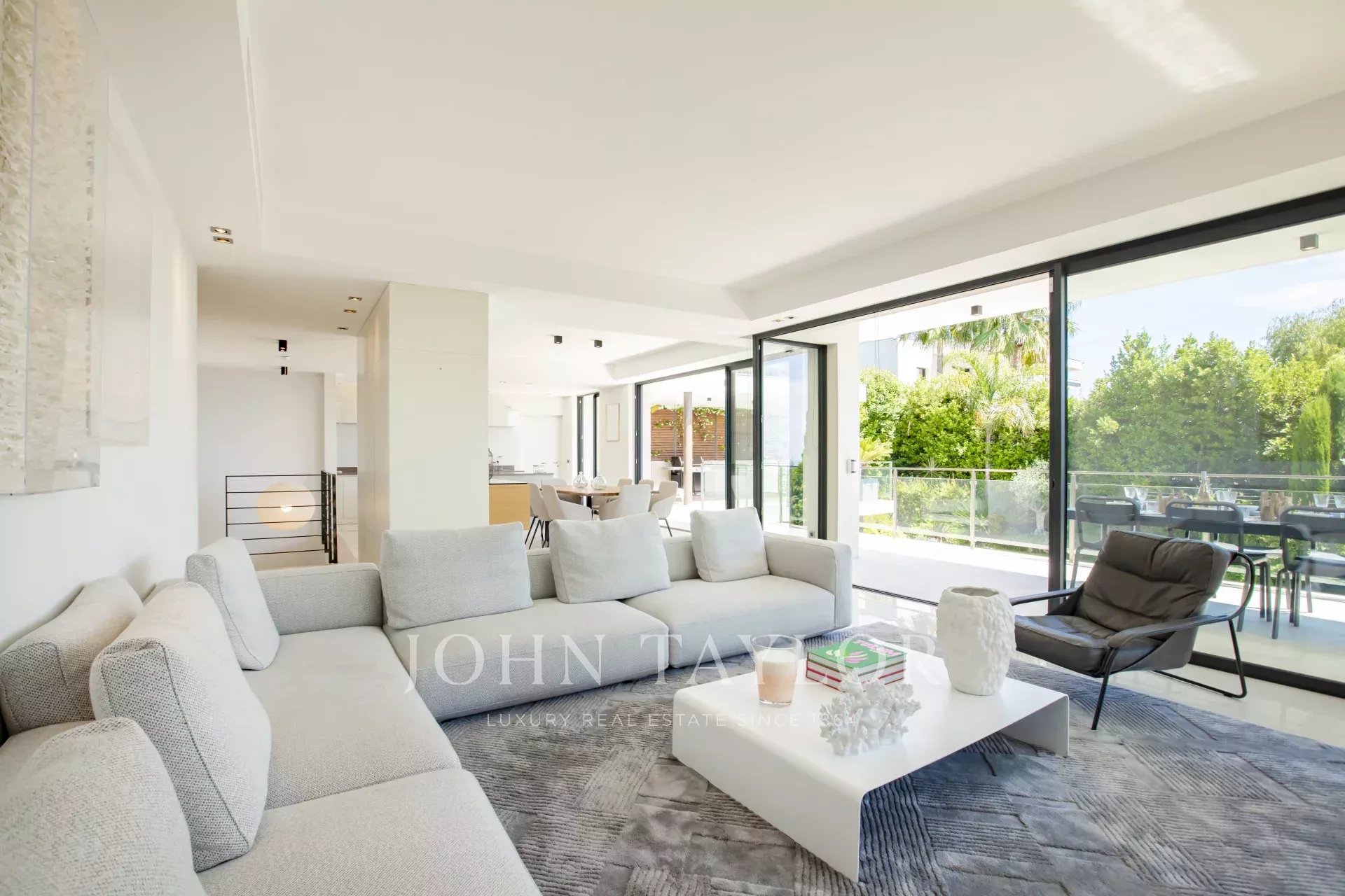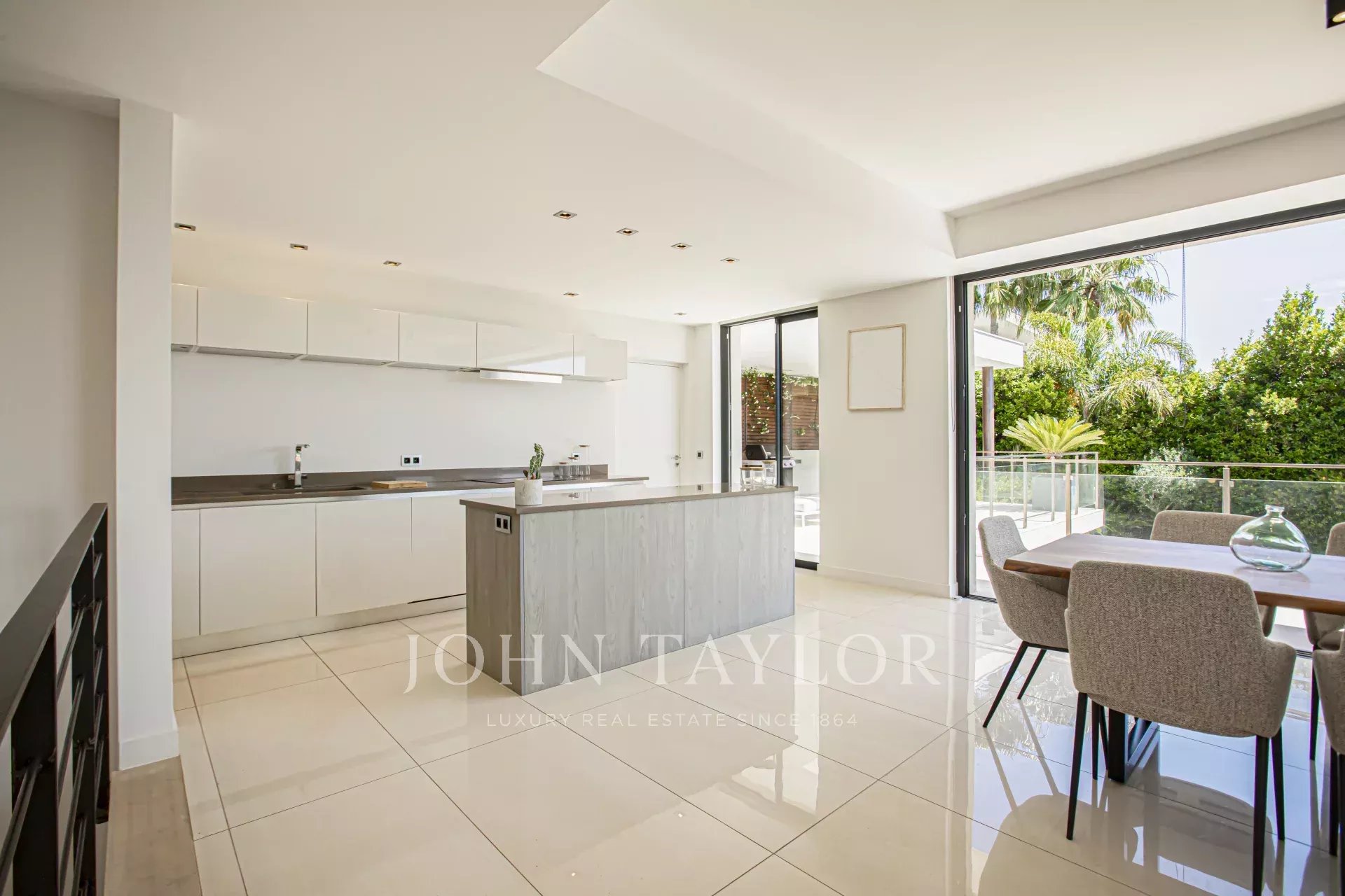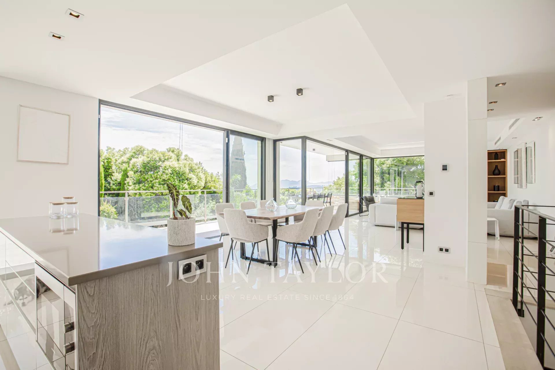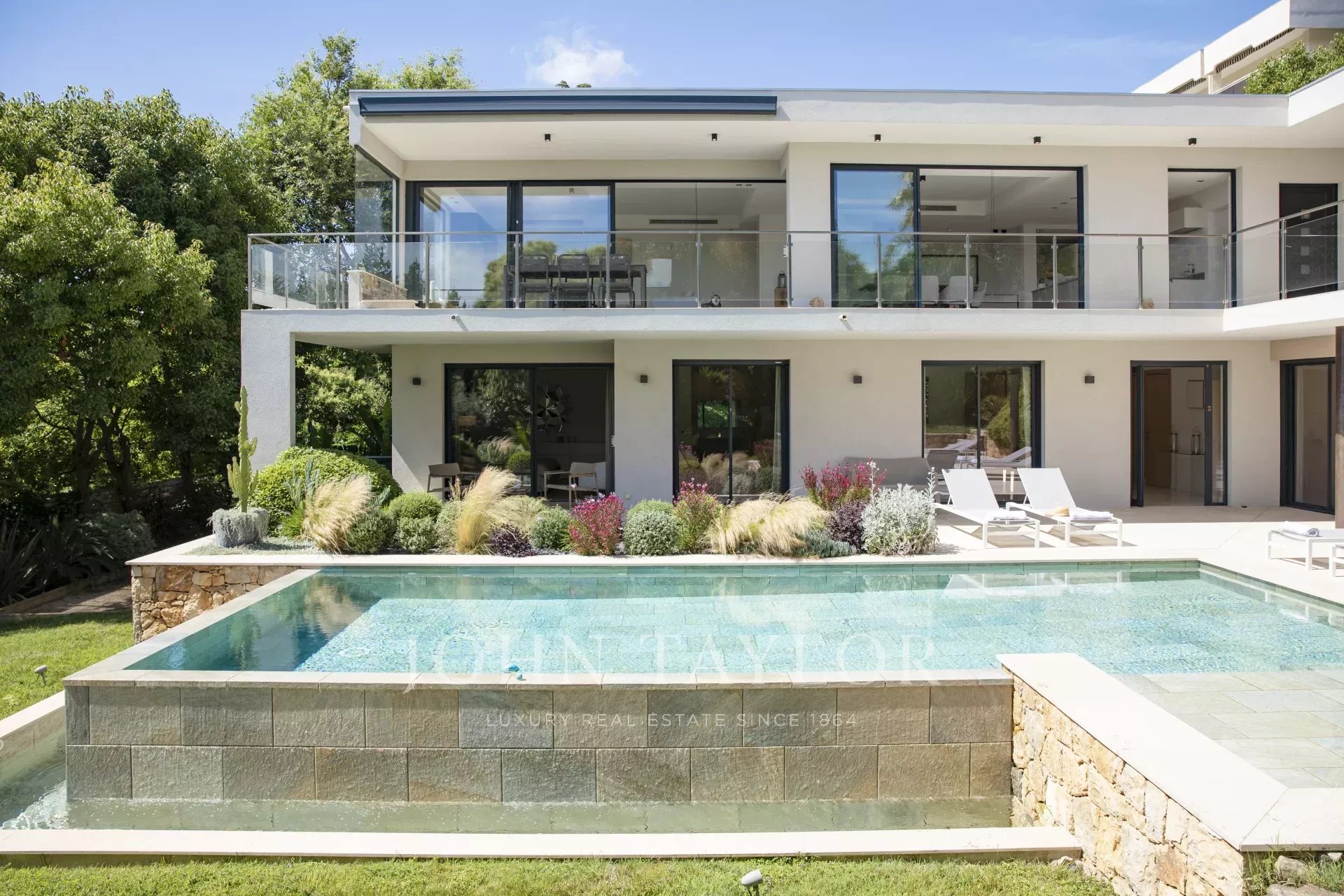 Nas alturas de Cannes, numa zona residencial perto da antiga aldeia de Le Cannet, bela moradia contemporânea com ar condicionado, 240 m2 de área de habitação, inserida em 1.374 m2 de terreno arborizado e exótico.