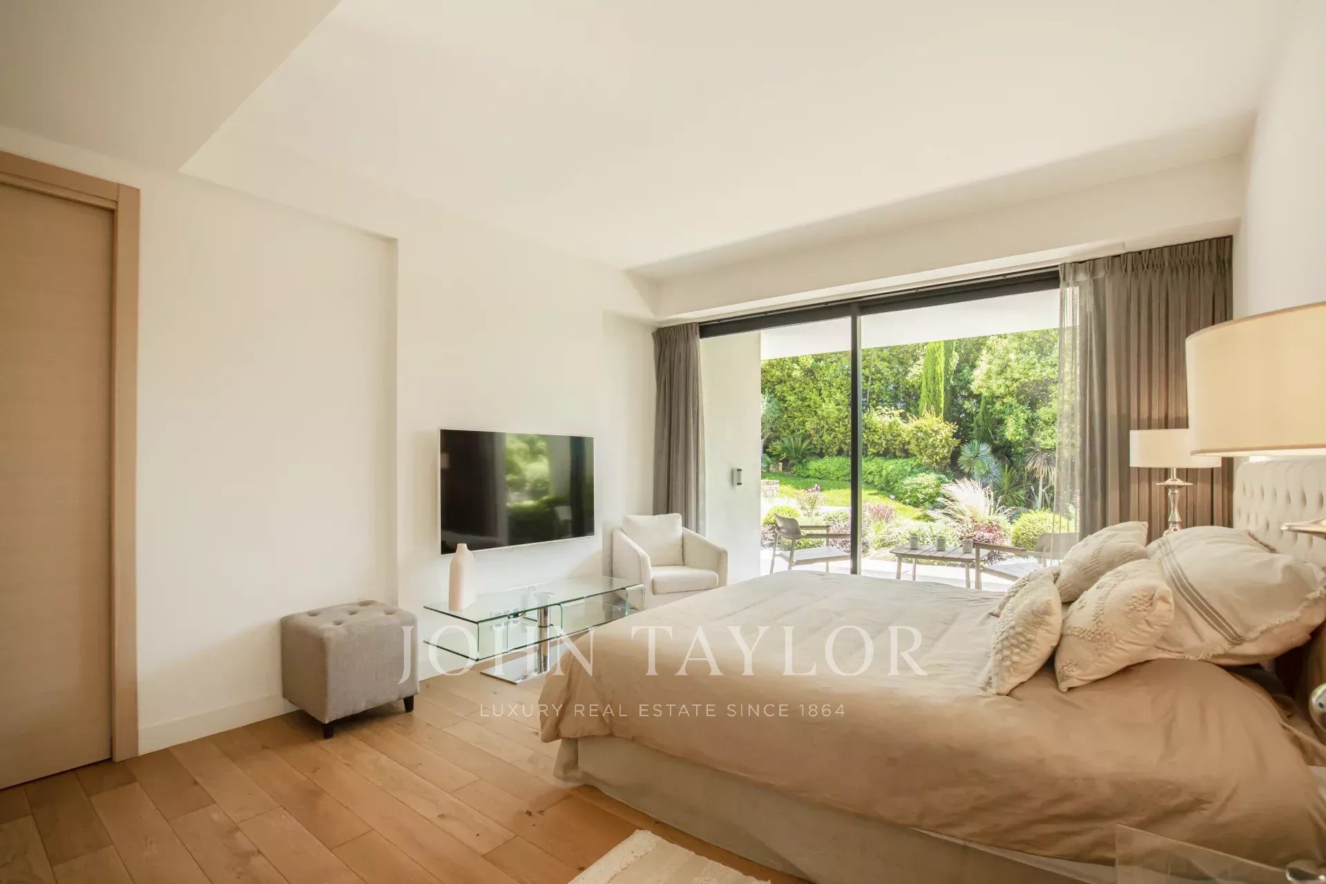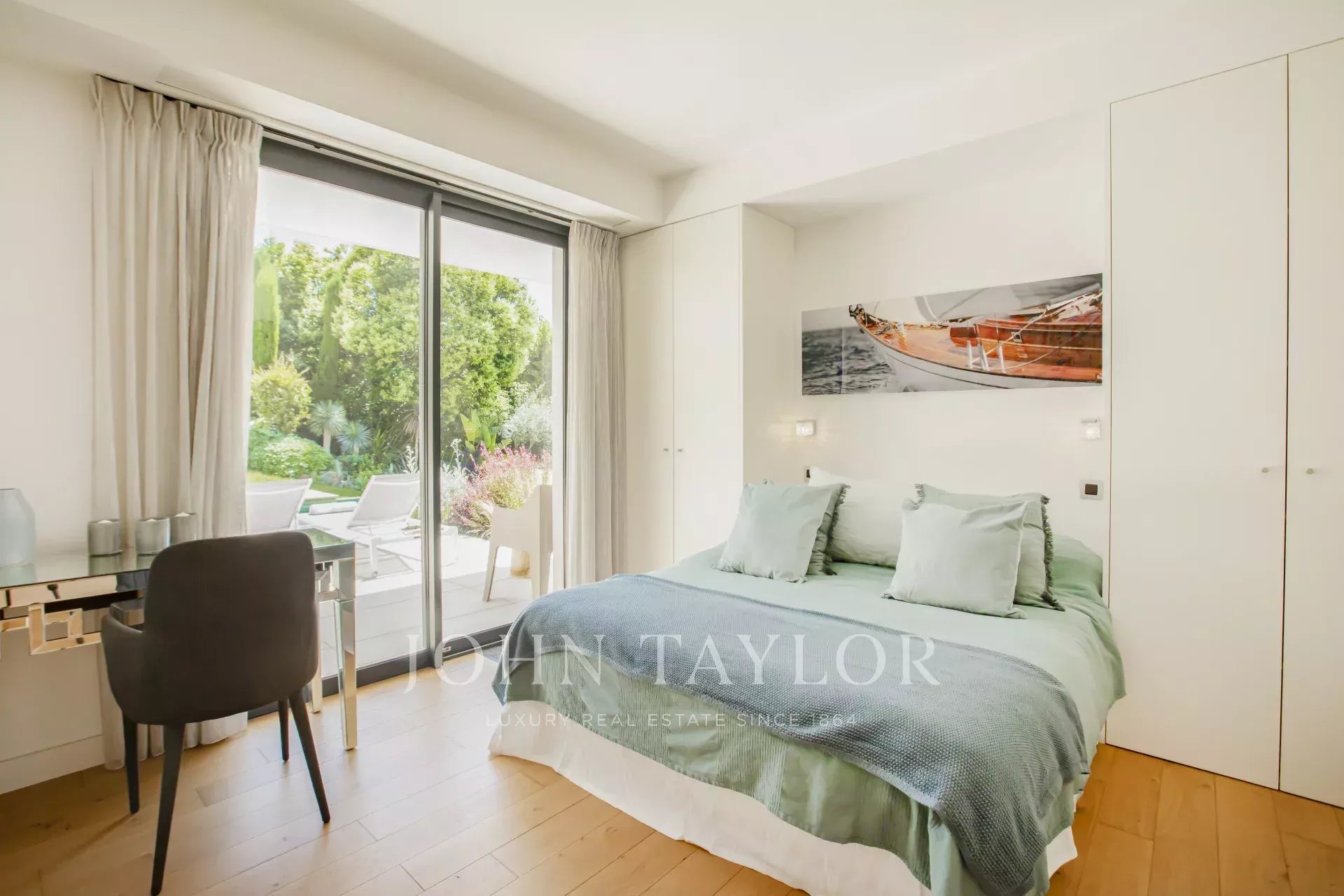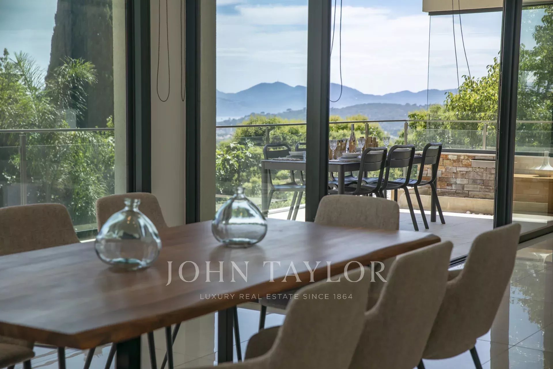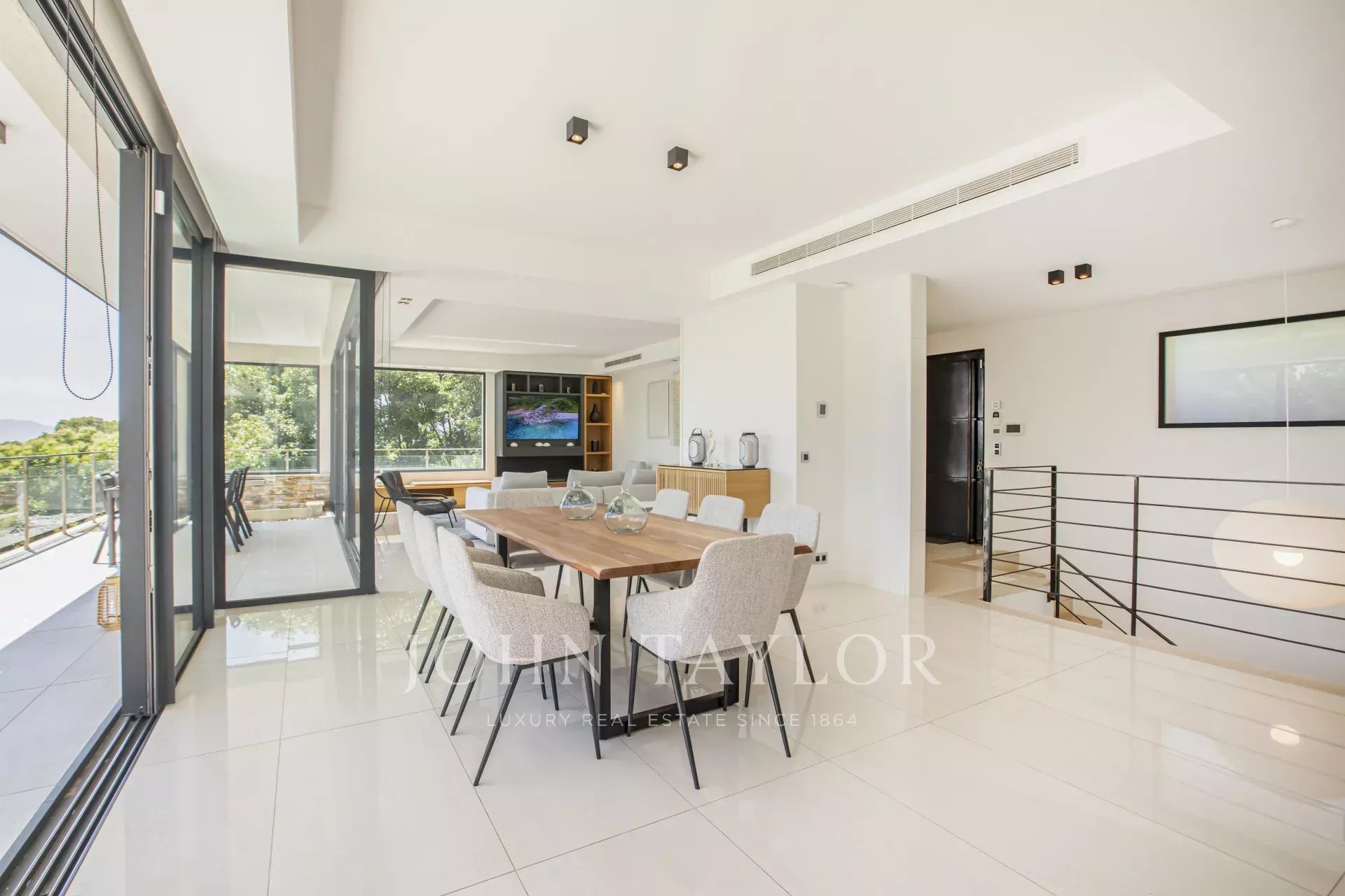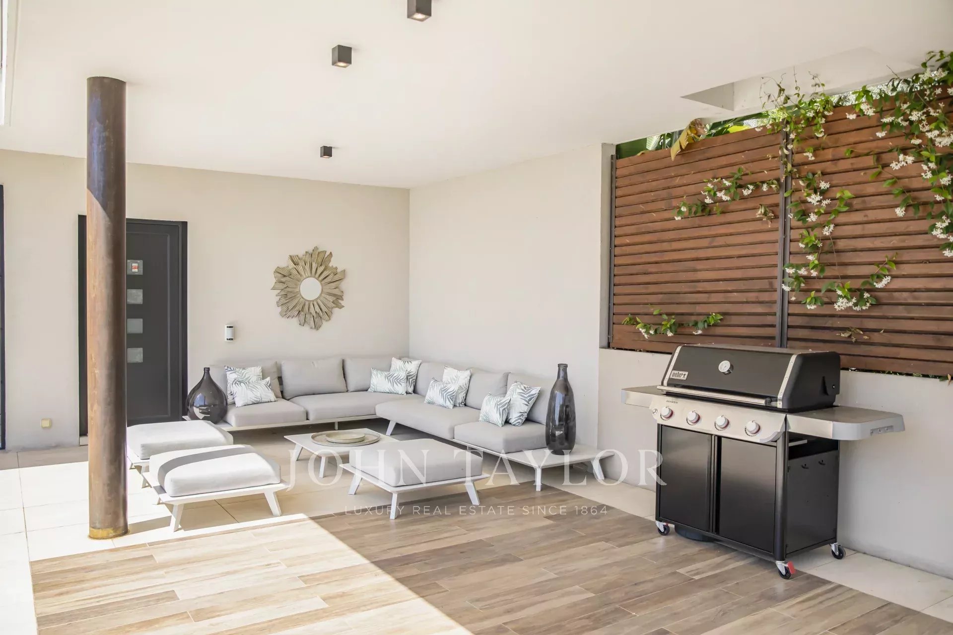 Nas alturas de Cannes, numa zona residencial perto da antiga aldeia de Le Cannet, bela moradia contemporânea com ar condicionado, 240 m2 de área de habitação, inserida em 1.374 m2 de terreno arborizado e exótico.