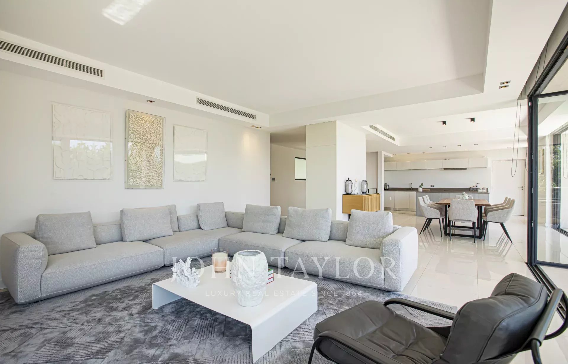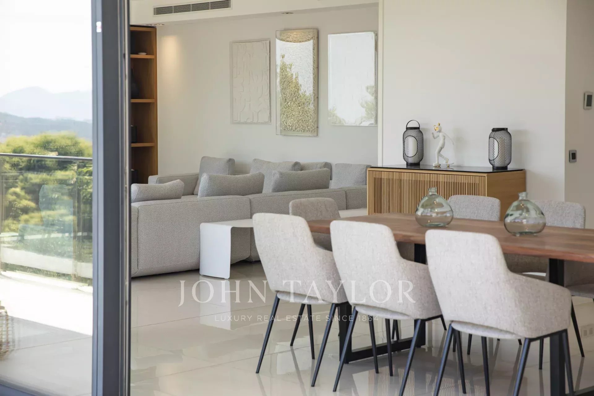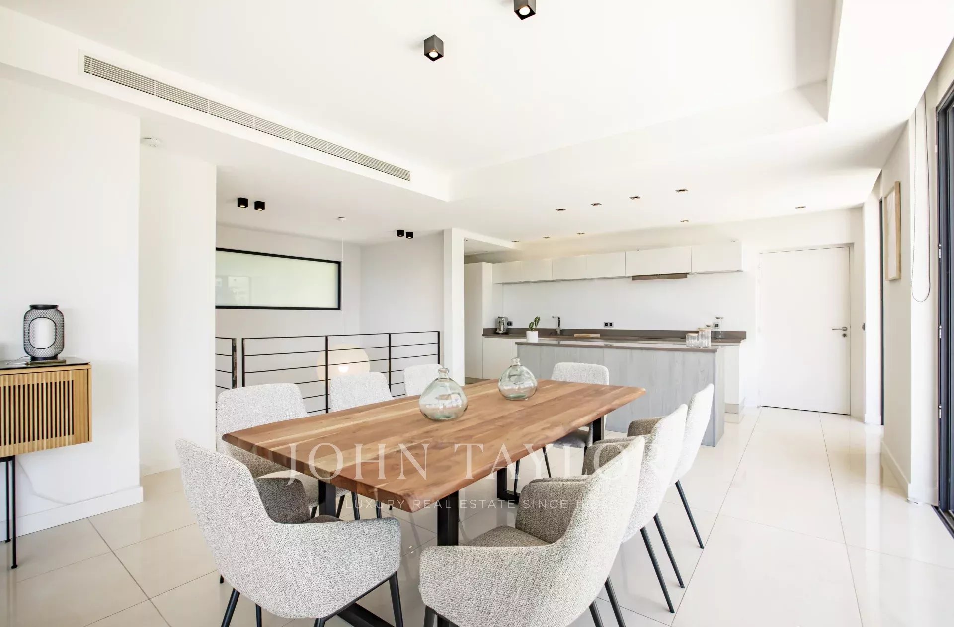 Sala de receção atraente composta por sala de estar, sala de jantar e cozinha equipada, todas abrindo para um terraço com área de jantar e vista para o mar.